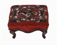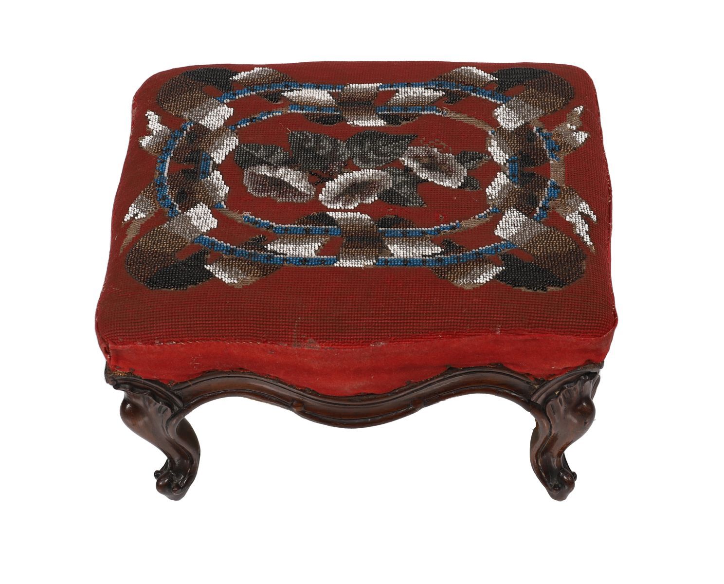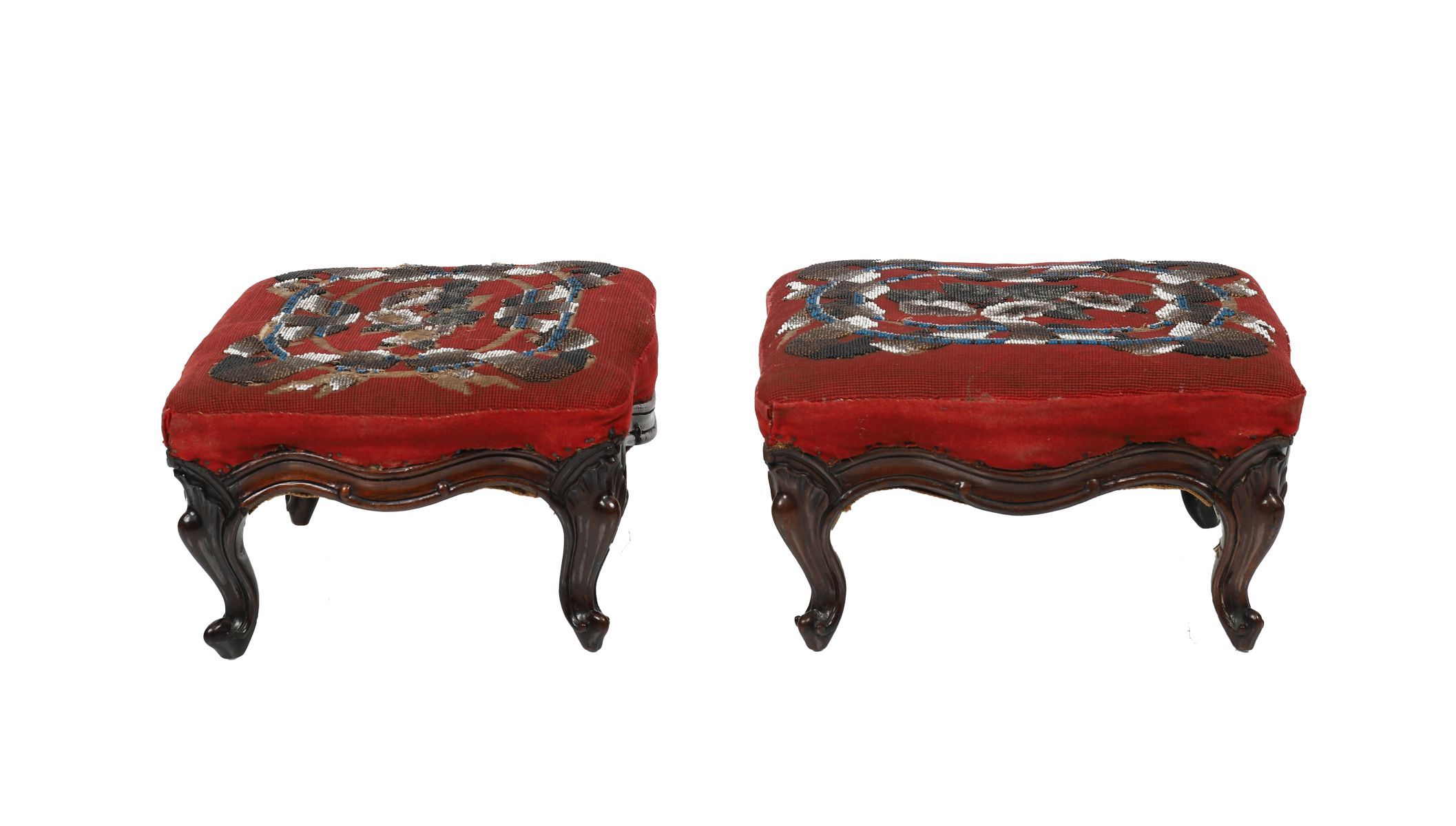 A pair of Victorian carved mahogany footstools, each with floral needlework upholstered tops and carved cabriole legs.