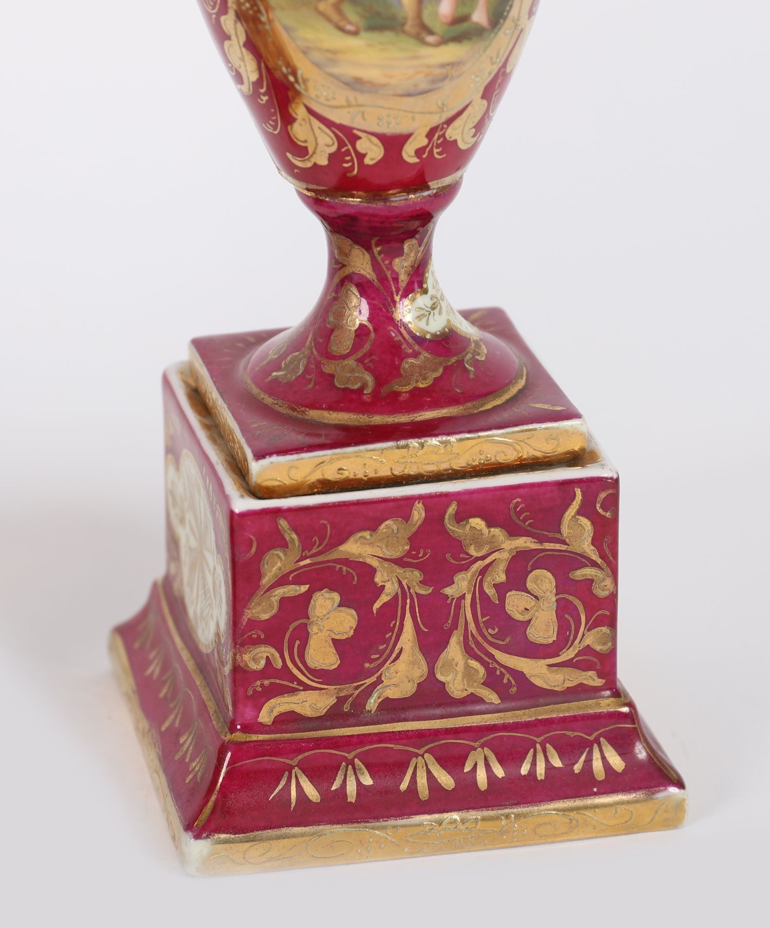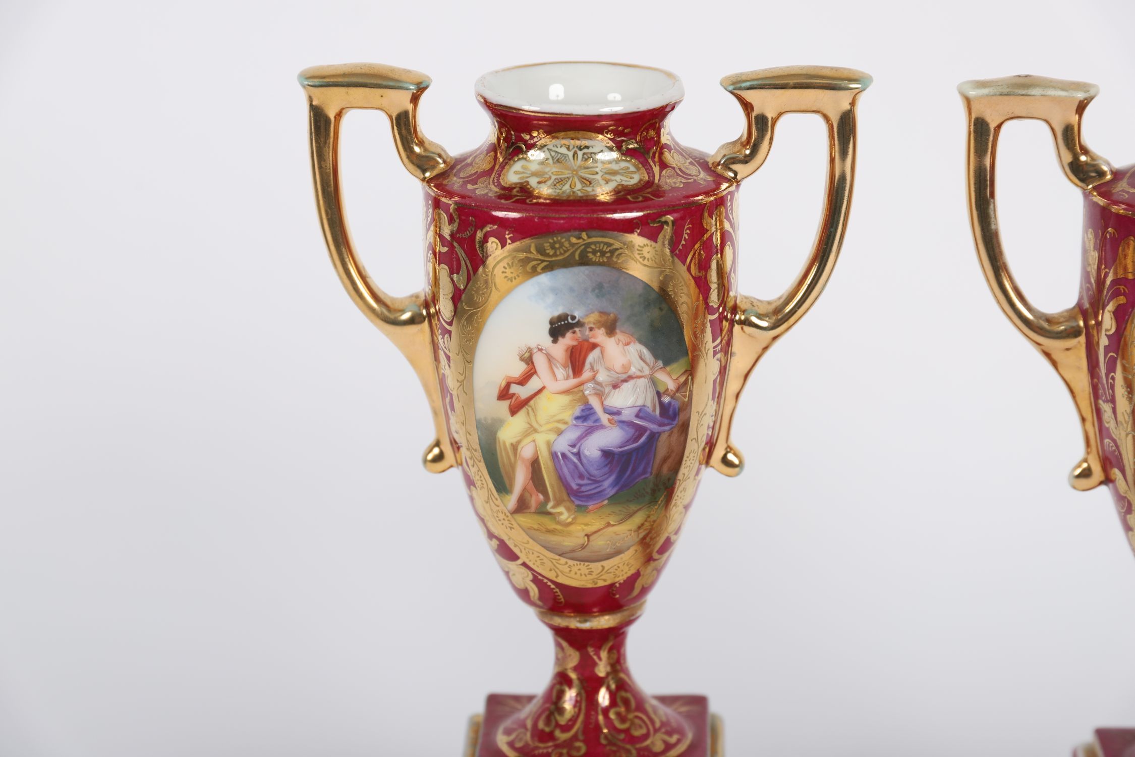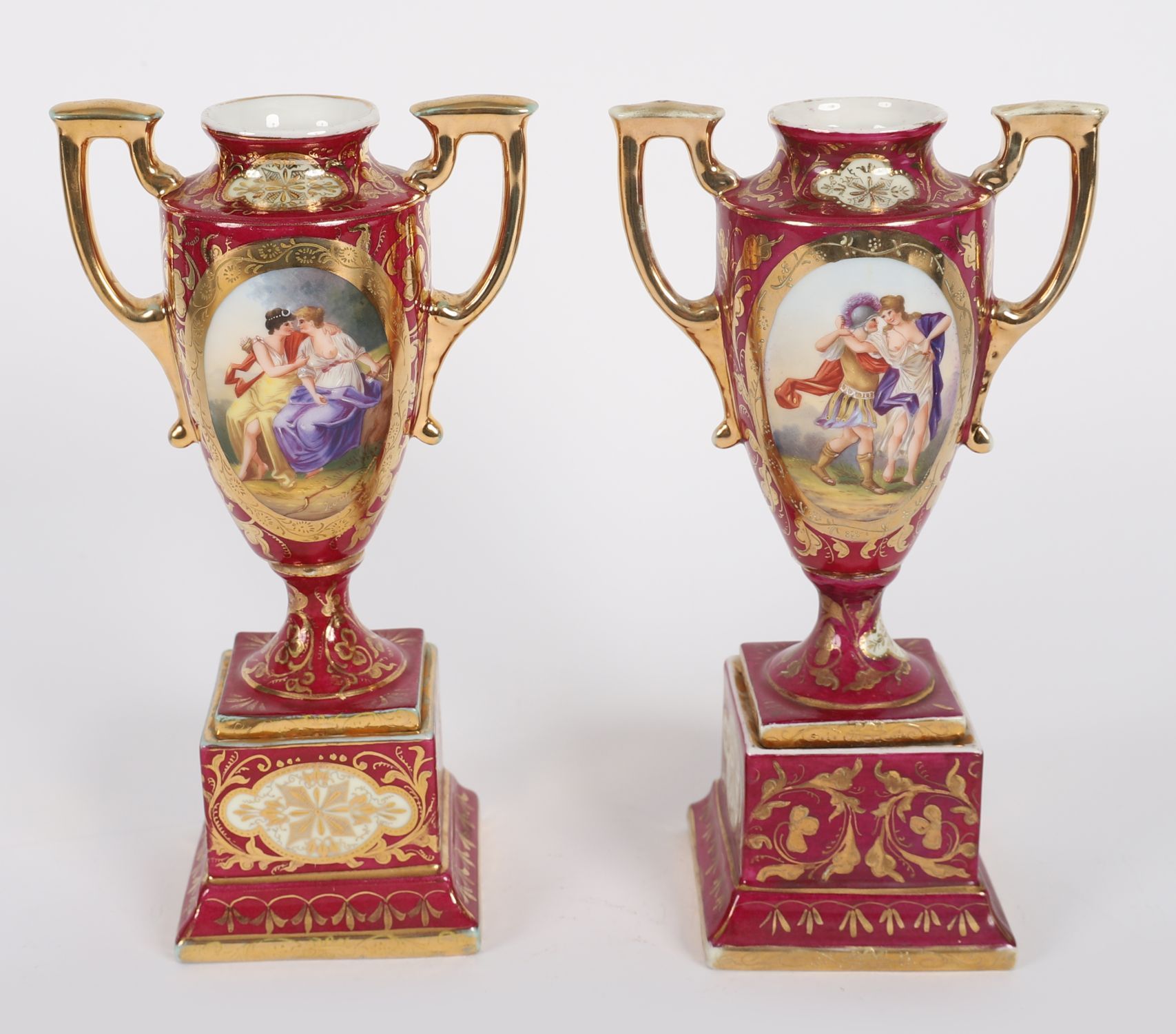 A decorative pair of twin-handled Vienna-porcelain cabinet vases, each of baluster form with classical figural reserves depicting mythological or romantic scenes in the 18th-century style. The bodies are richly decorated in deep crimson with gilt detailing, floral motifs, and cartouches, all raised on shaped plinth bases.