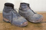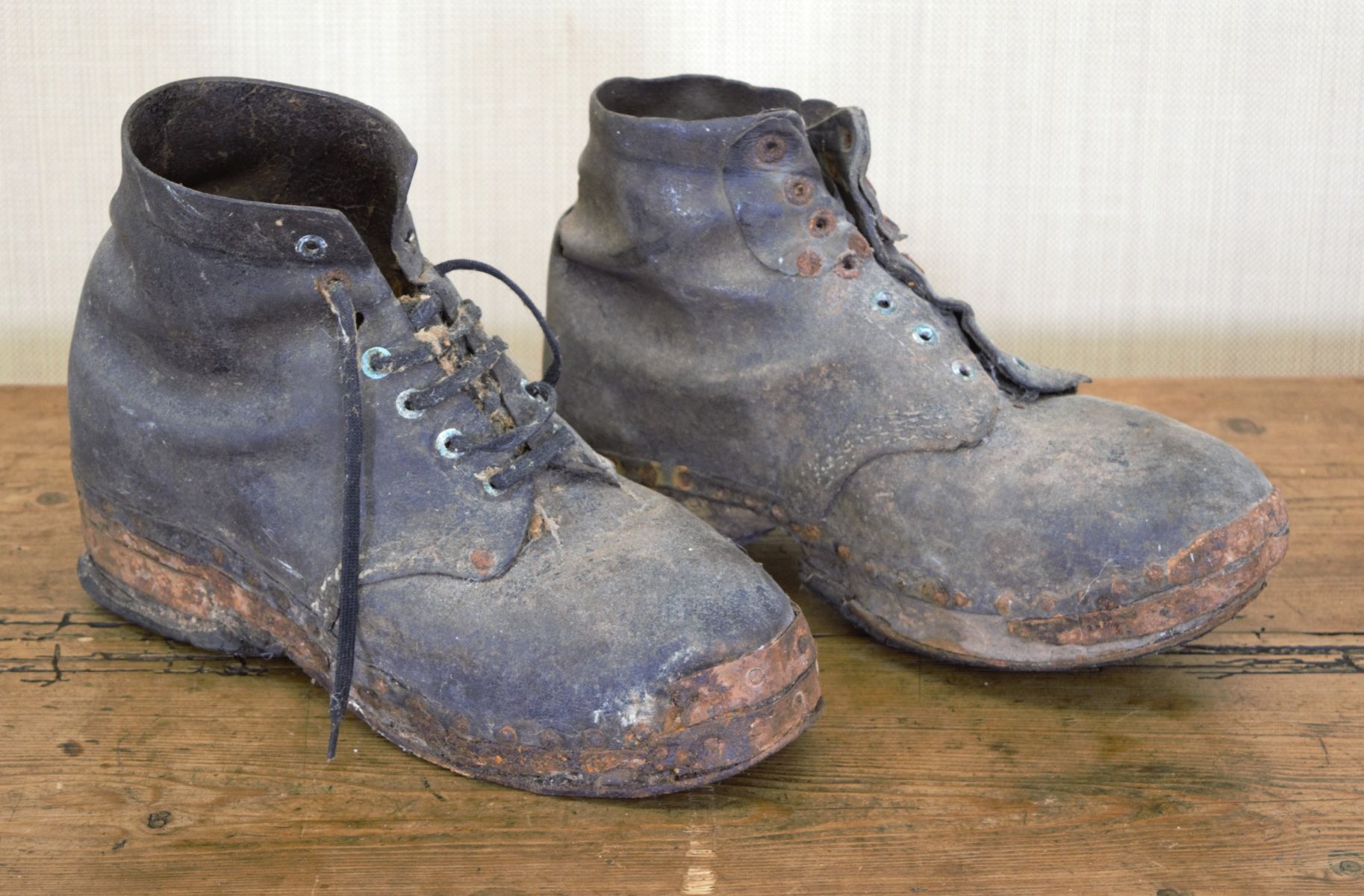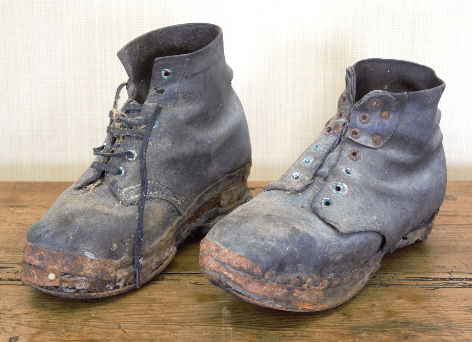 Pair of heavy leather man’s hobnail boots with studded soles. Early 20th century.