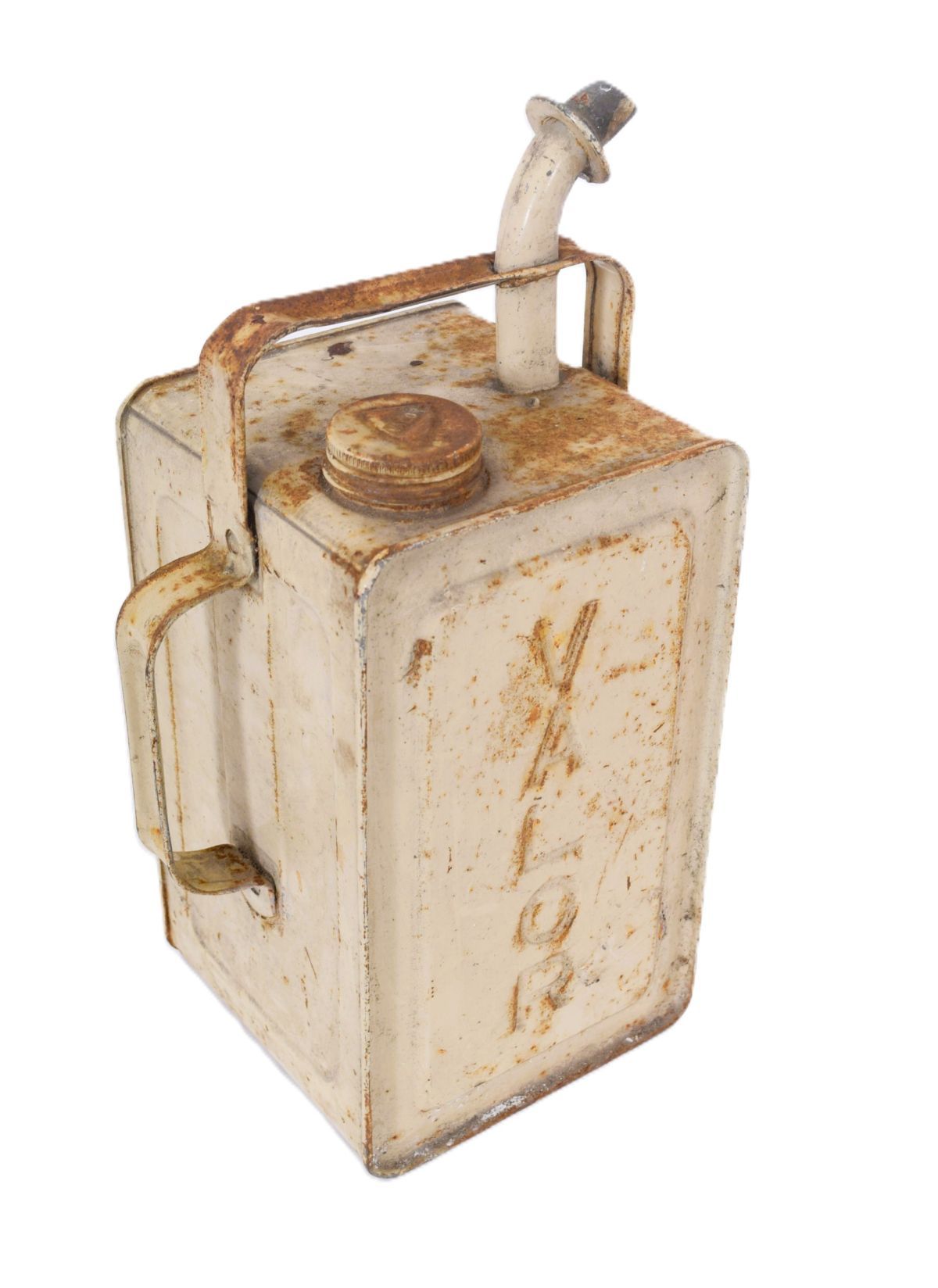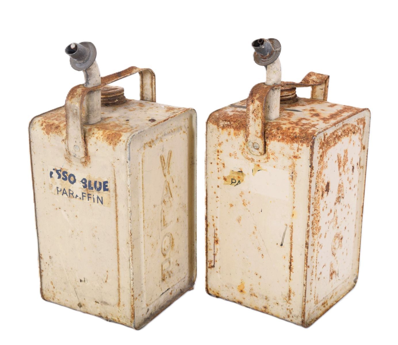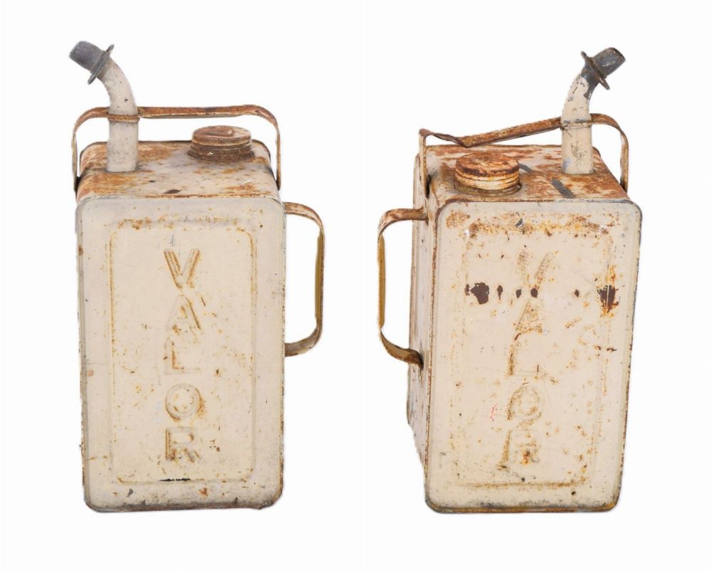 Two early metal paraffin cans including Valor and Esso Blue examples with printed branding.