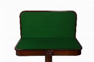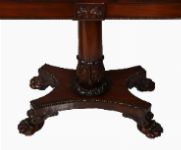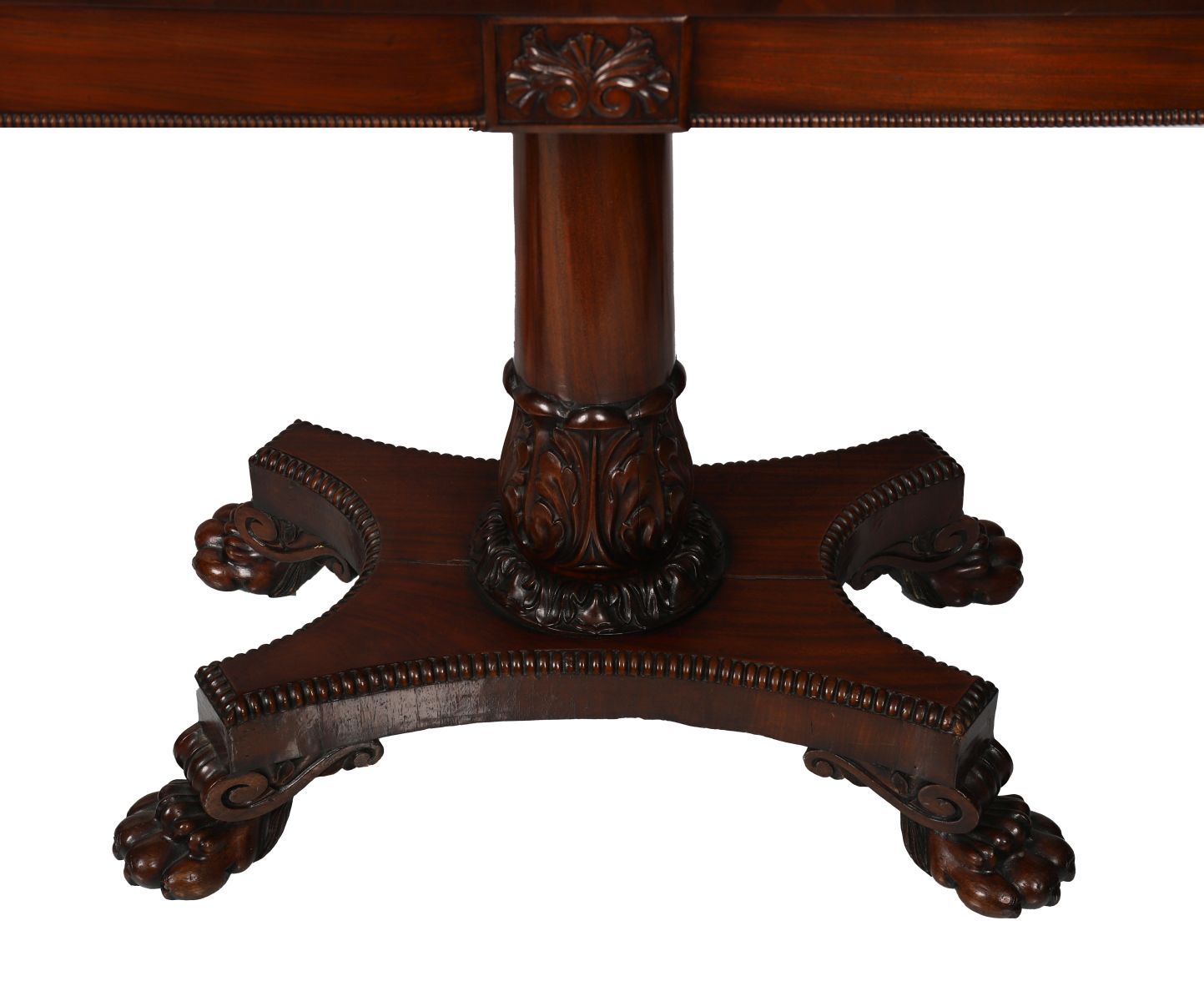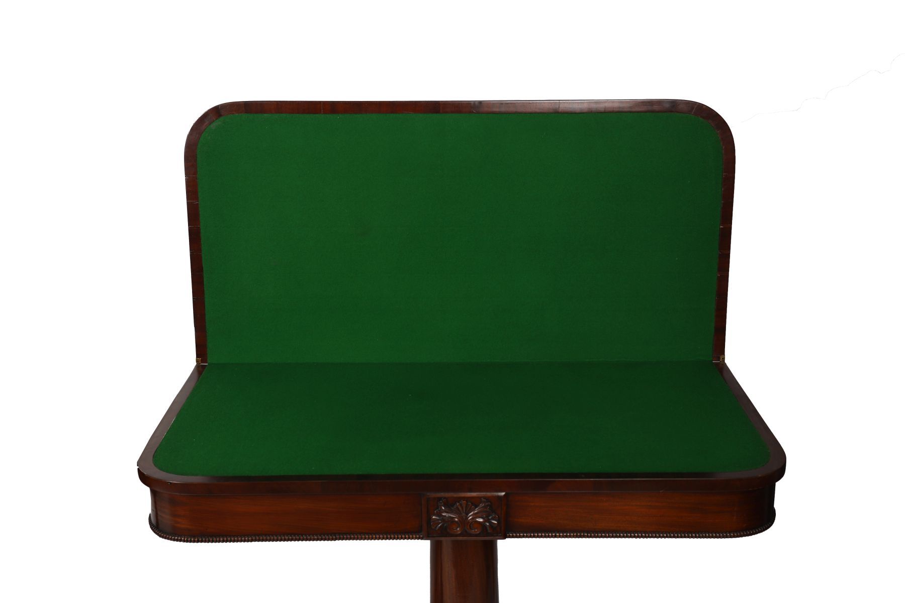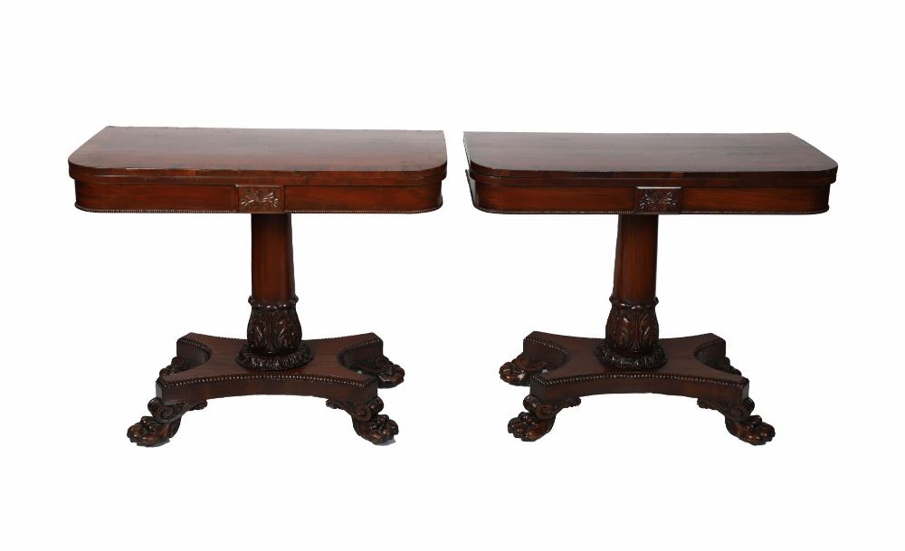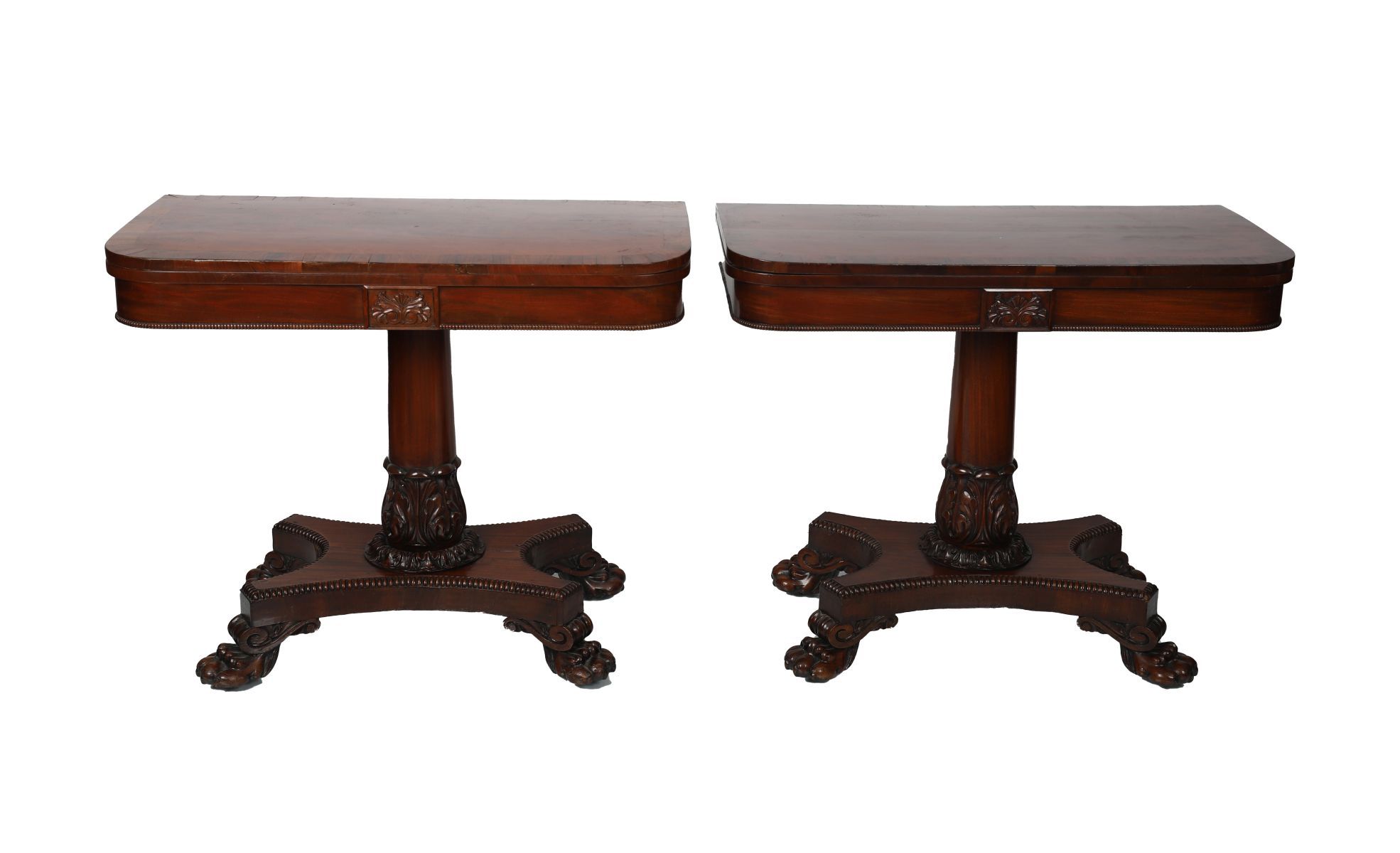 Circa 1835. Each with rectangular fold-over top crossbanded in rosewood, opening to a baize-lined playing surface; raised on a boldly carved central pedestal with acanthus leaf collar and platform base terminating in lion paw feet.