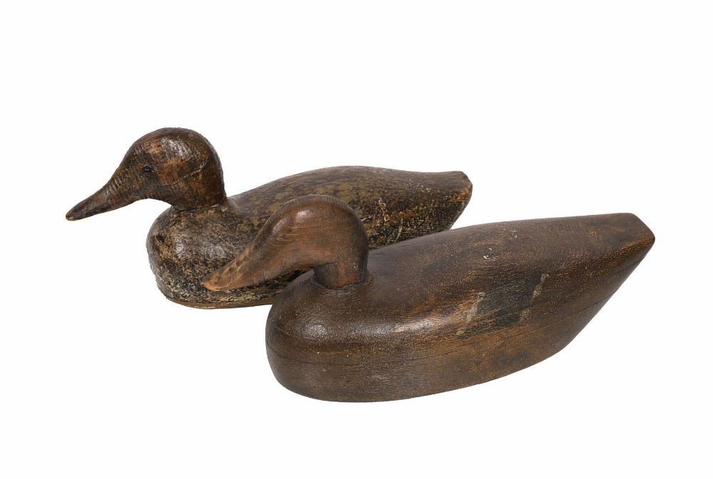 Two hand-carved wooden duck decoys, each with well-shaped bodies and stylised painted decoration.