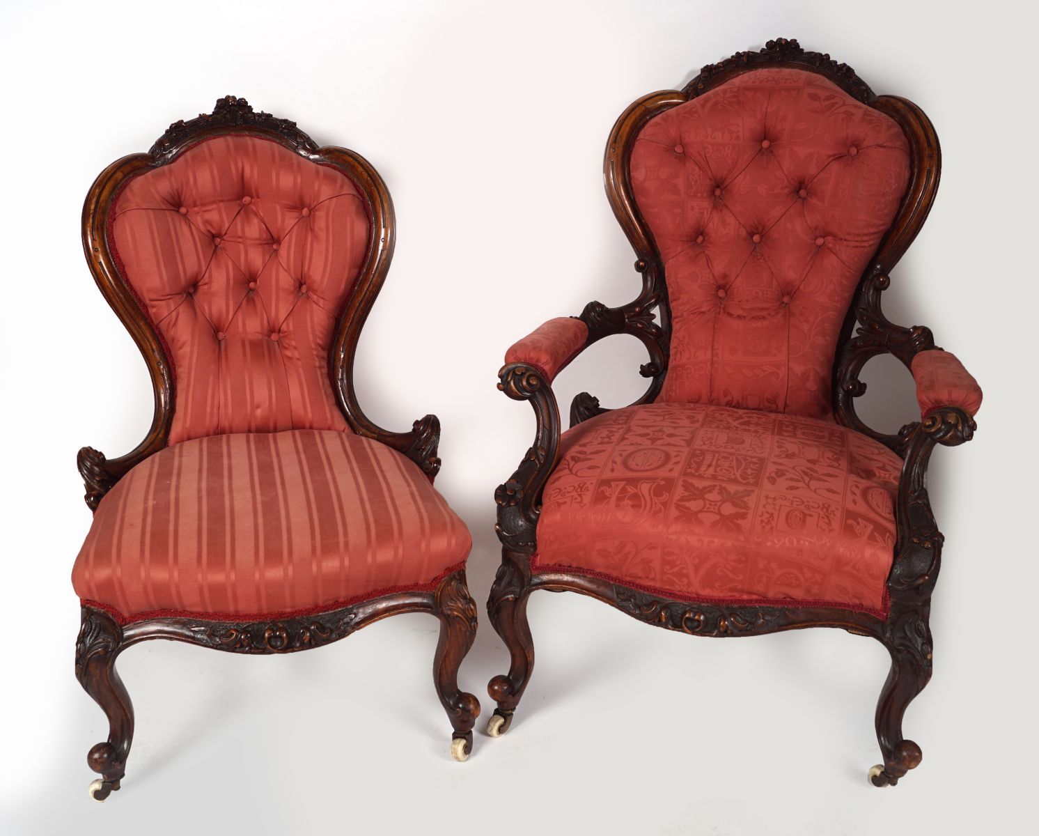 a lady's and a gent's, each with a deep buttoned upholstered balloon-shaped show frame back, above a serpentine fronted seat, raised on cabriole legs to the fore terminating on castors.