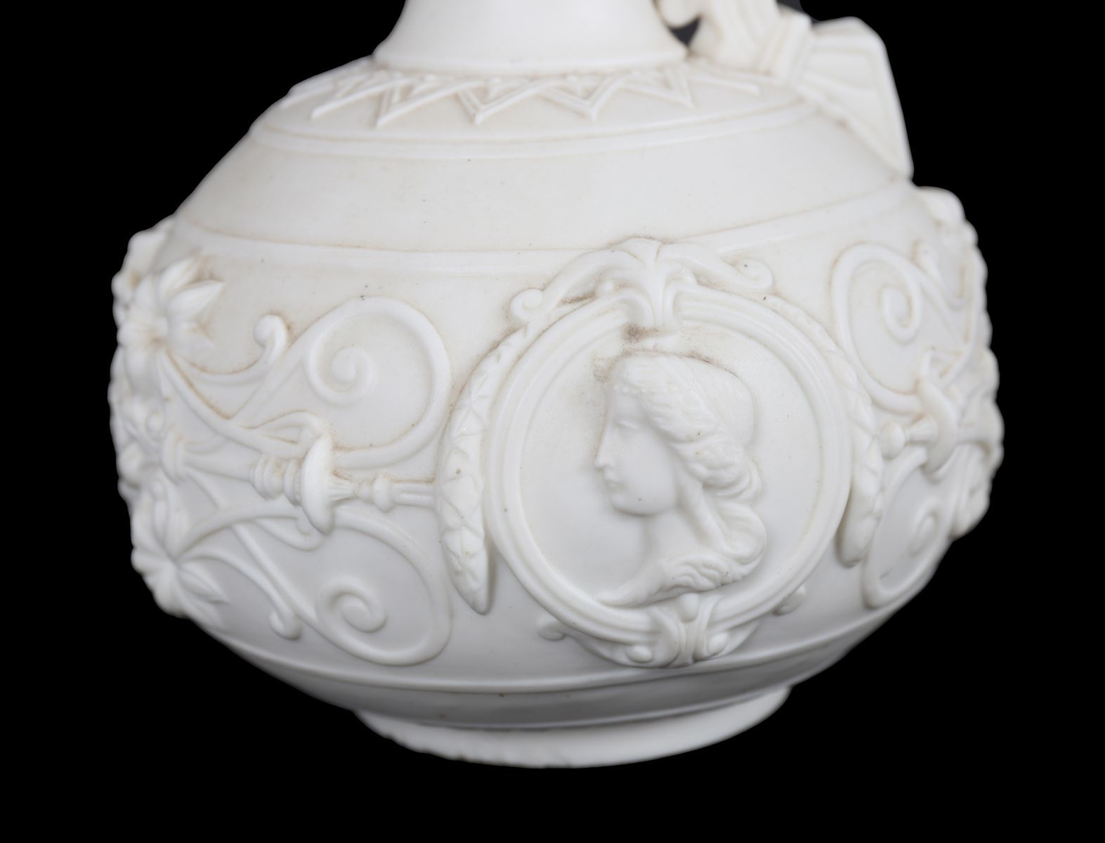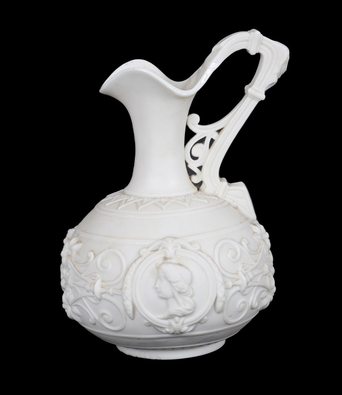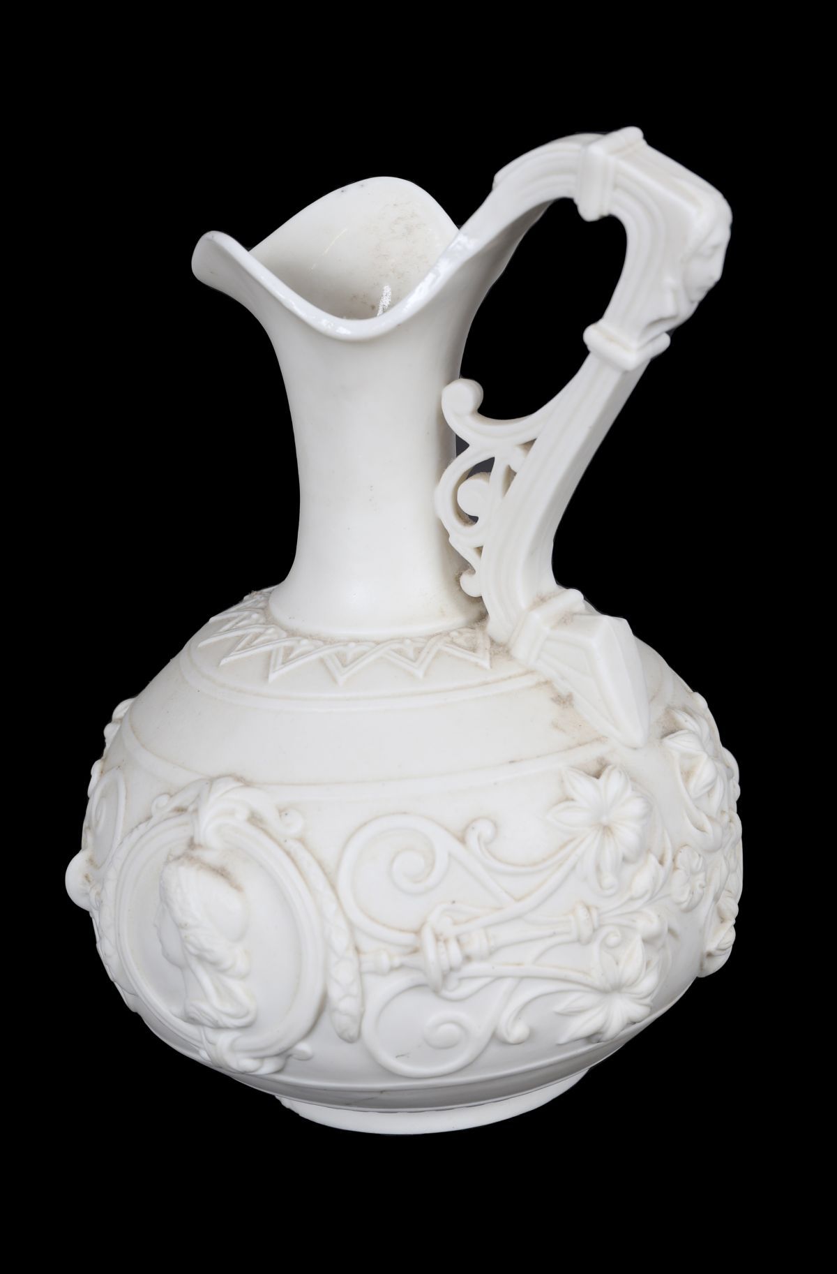 A Parian neoclassical jug of classical form, moulded with relief decoration and shaped handle.
