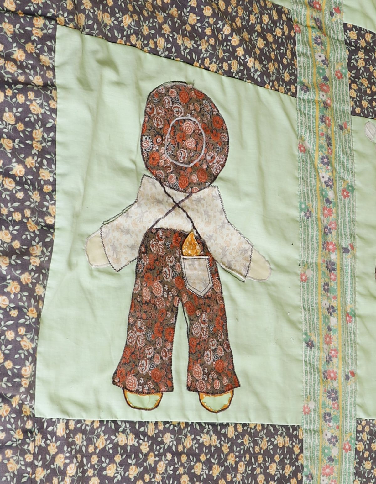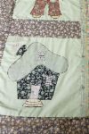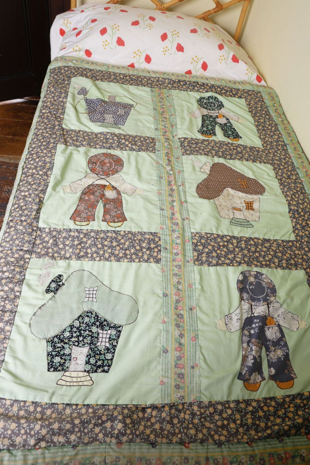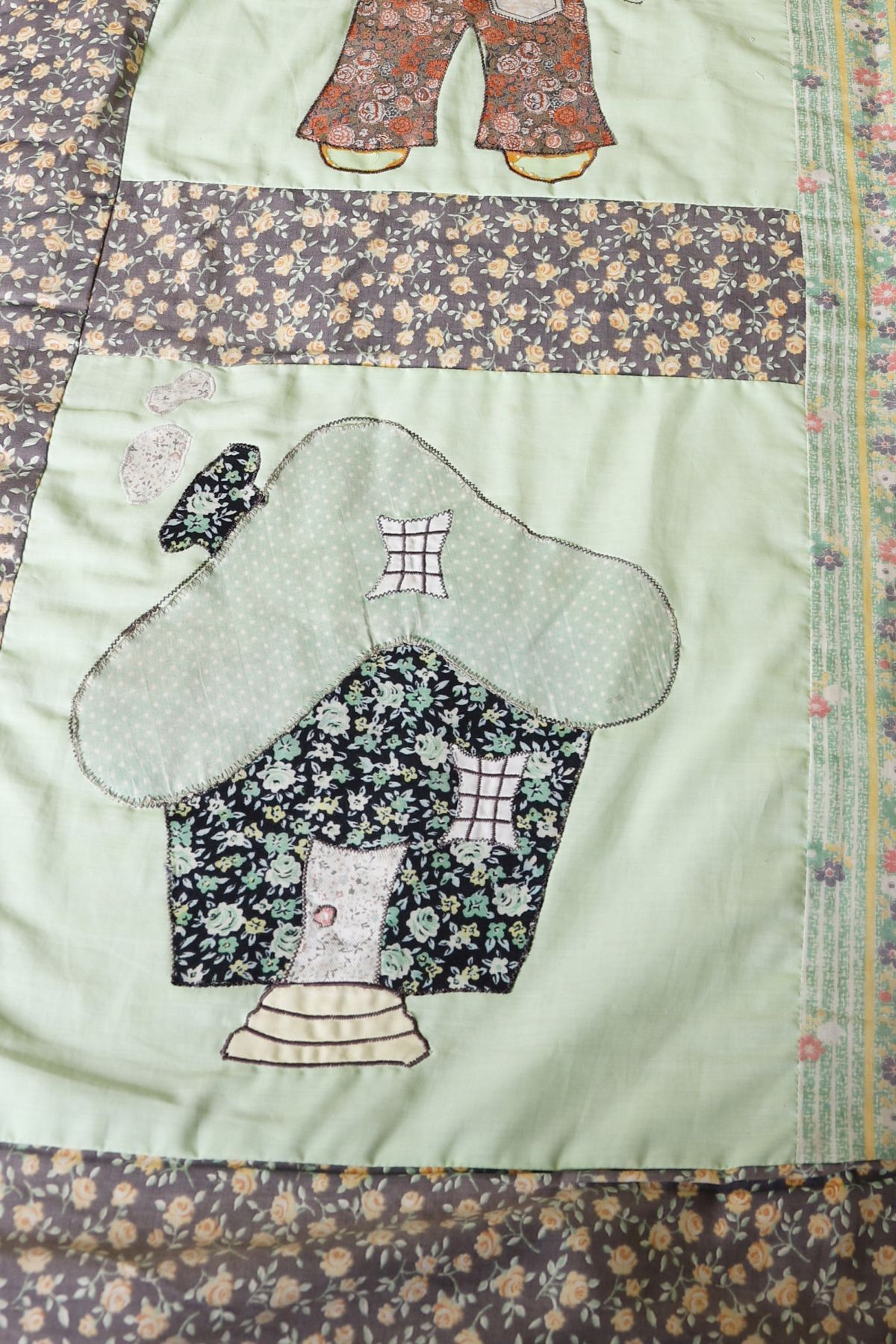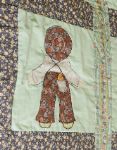Decorative patchwork quilt featuring appliqué figural panels depicting stylised figures and domestic motifs, bordered by floral printed fabric bands and quilted throughout.