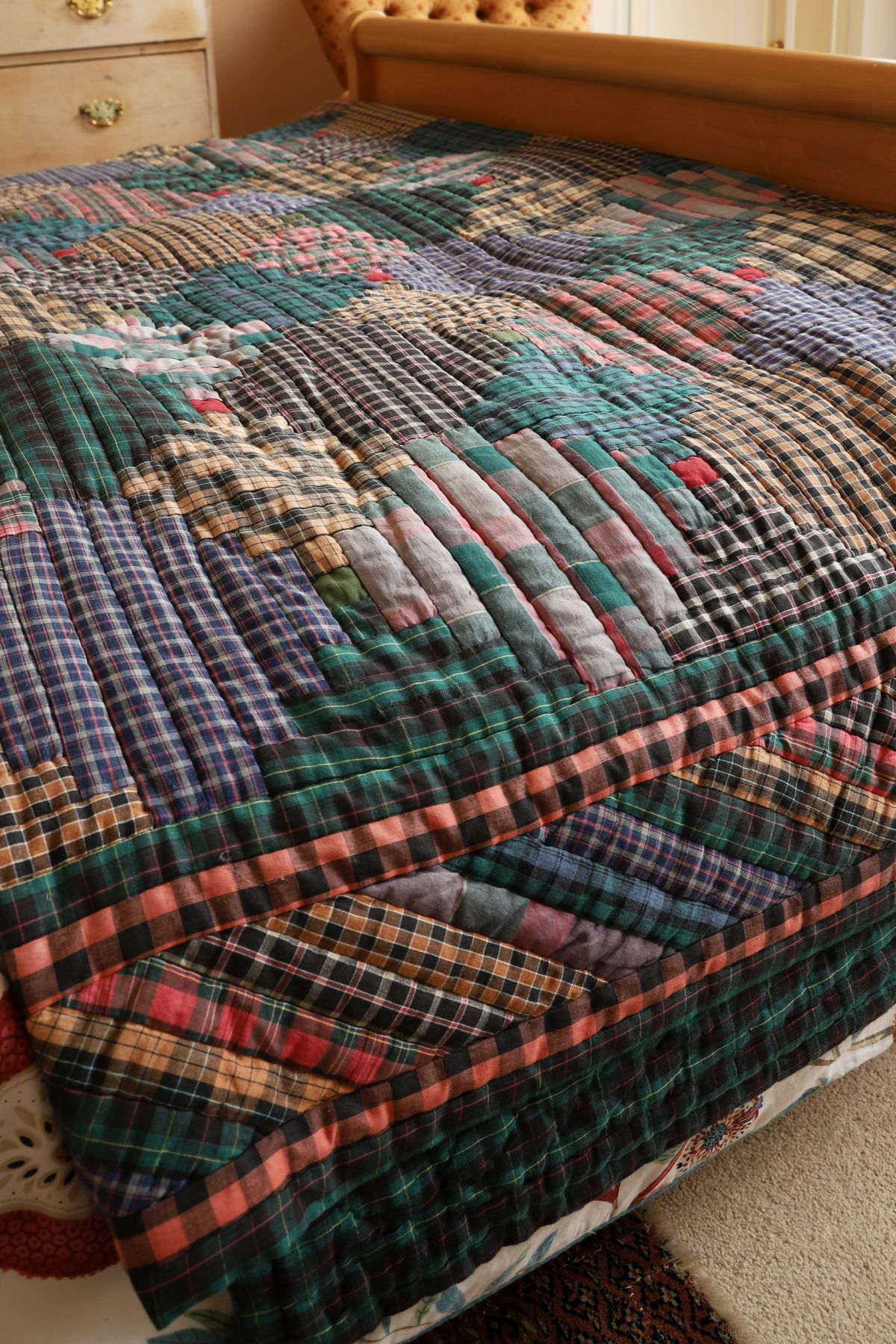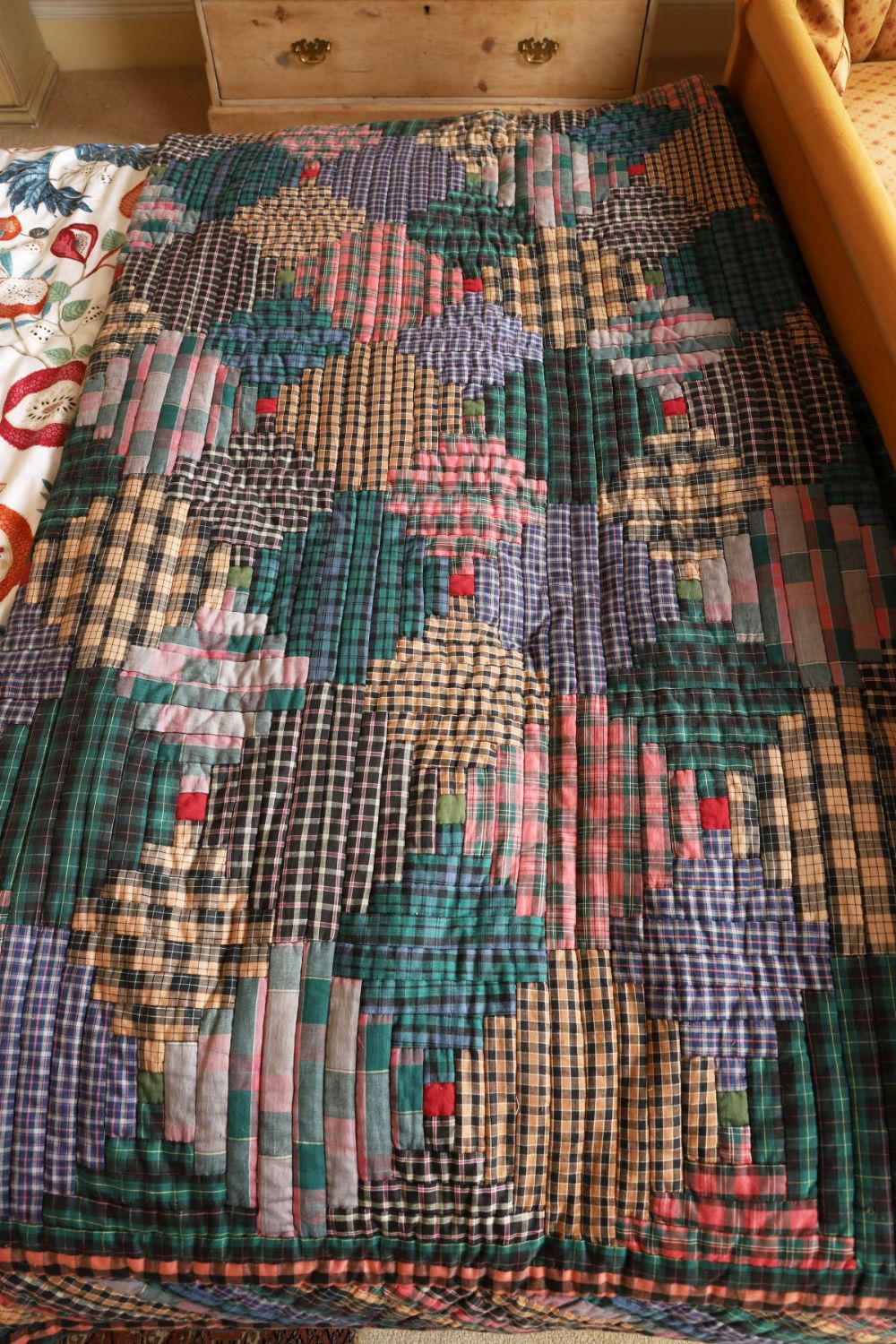 Handmade patchwork quilt composed of rectangular and stepped blocks in muted greens, blues, pinks and browns, worked in checked and striped cotton fabrics. Quilted throughout and backed in cotton.