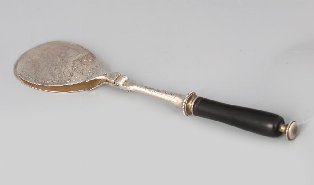 A pair of 19th century patent silver-plated articulated serving tongs, with ebony handle, the terminals engraved with foliate design.