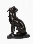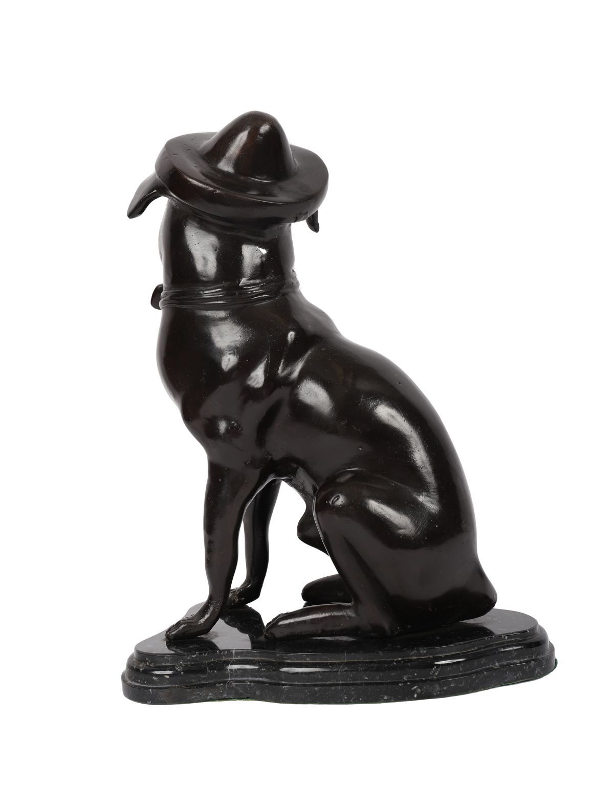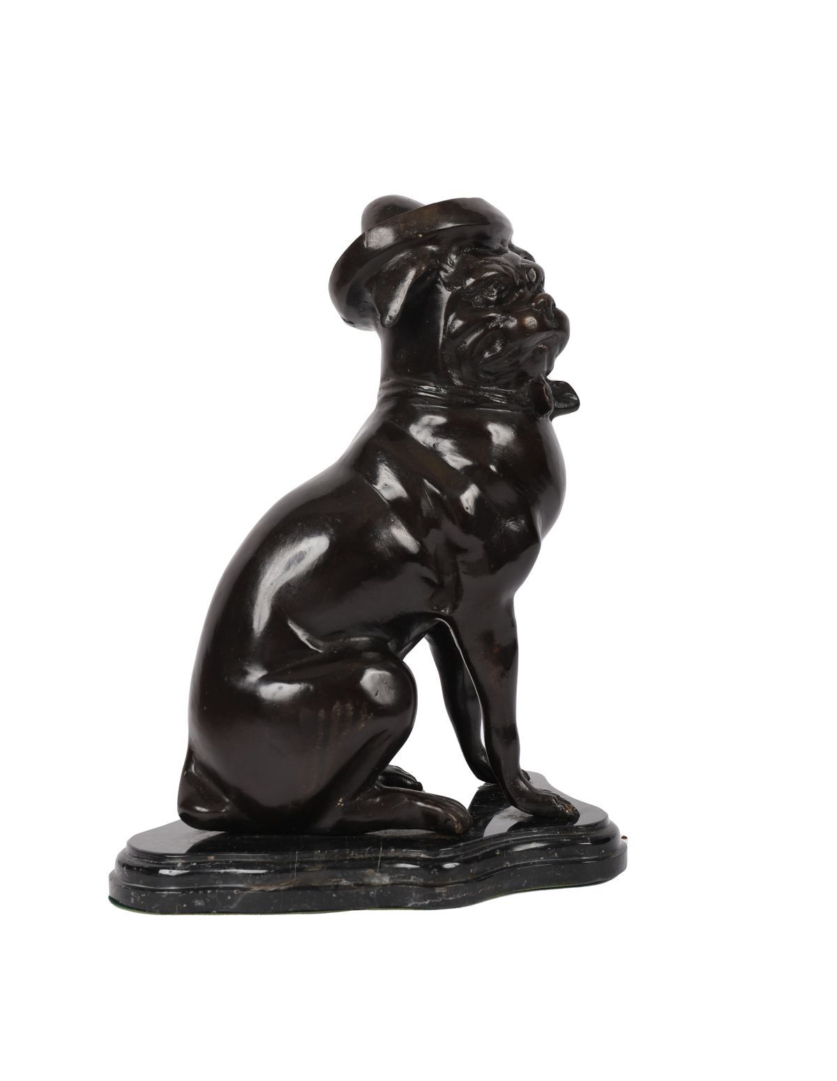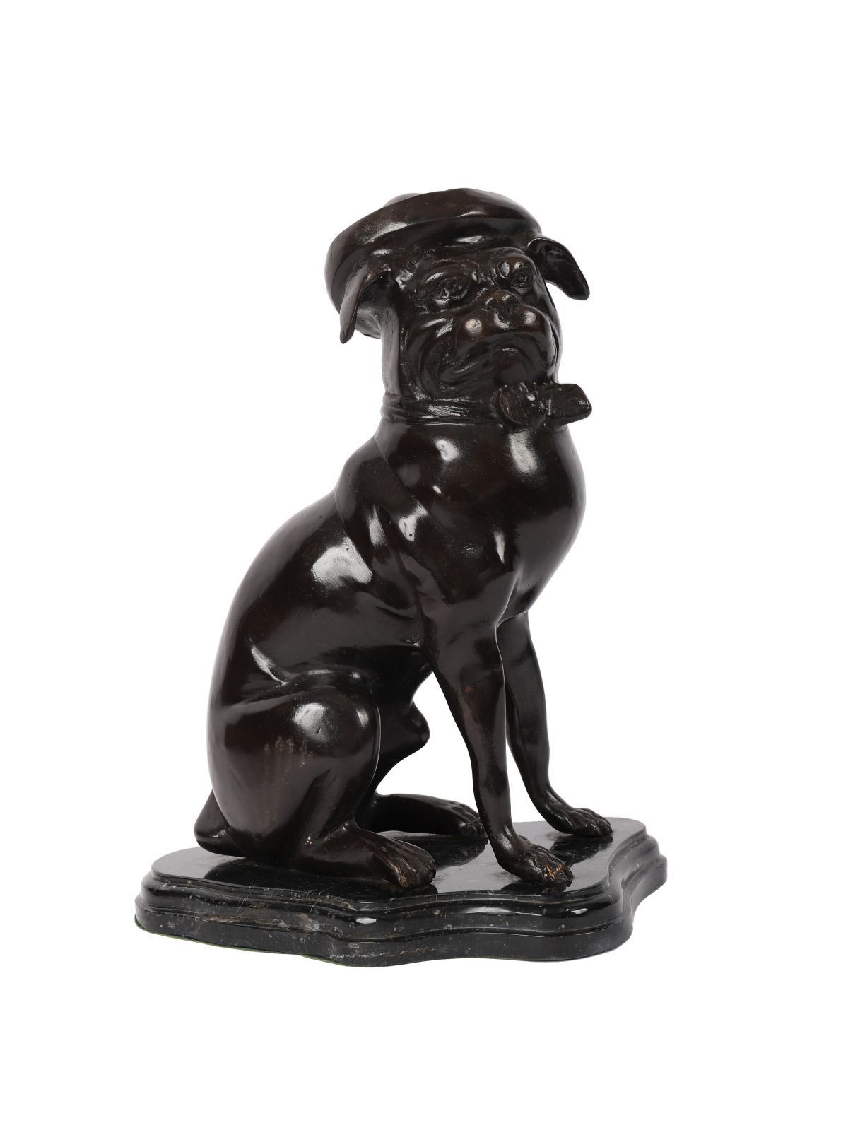 Well-modelled bronze figure of a seated bulldog wearing a hat and collar, with rich dark patina, set on a shaped marble plinth. Early 20th century.