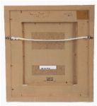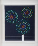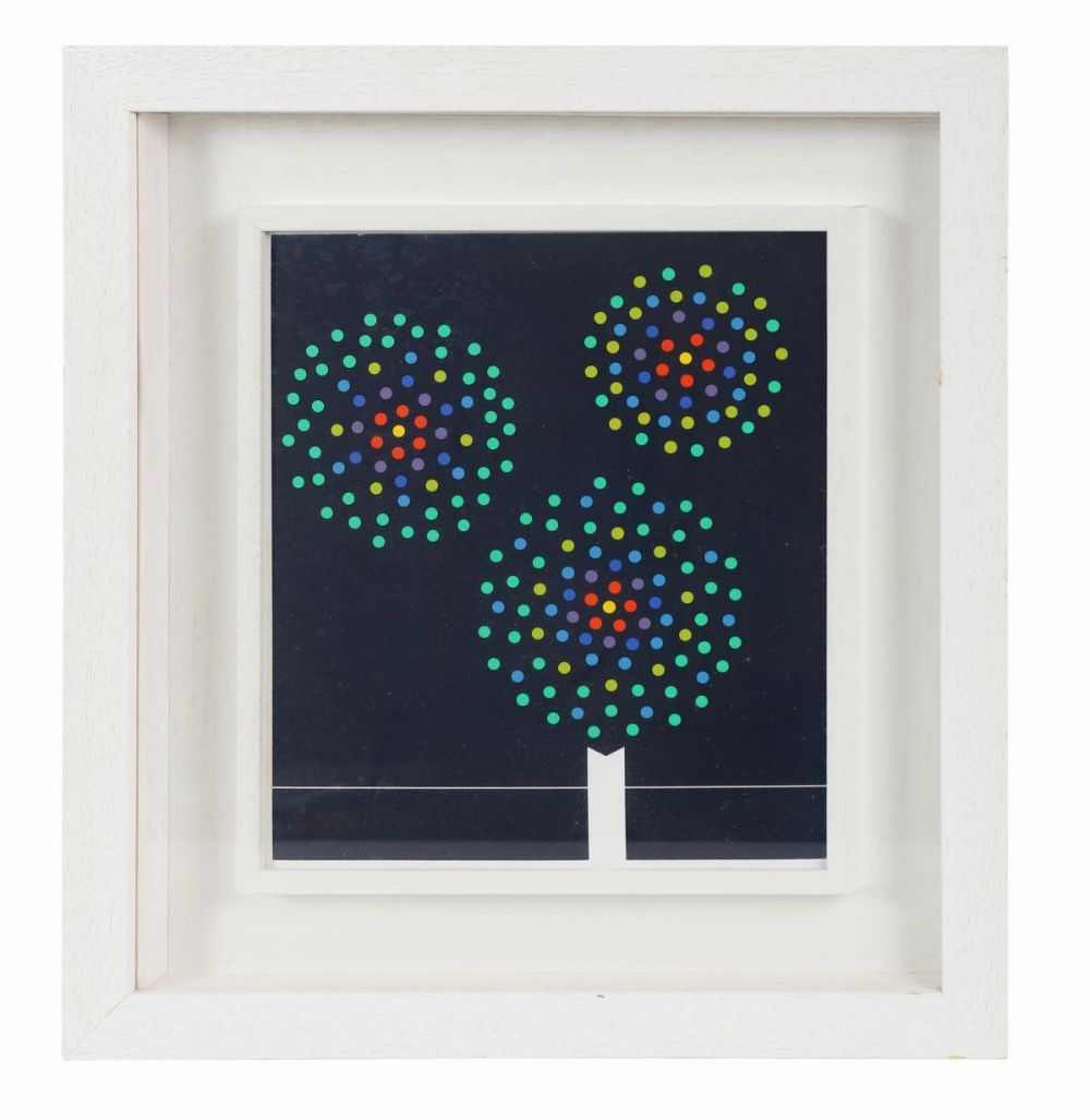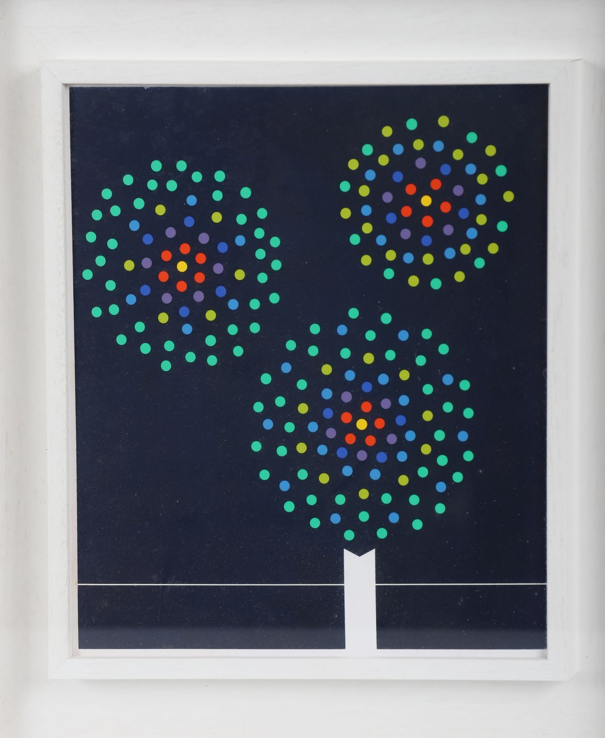 A striking screenprint composed of clustered circular dot formations in bright greens, blues and oranges arranged on a dark ground. The design reflects Scott’s minimalist precision and his interest in rhythmic, meditative pattern-making. Framed and glazed.