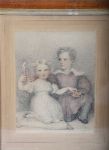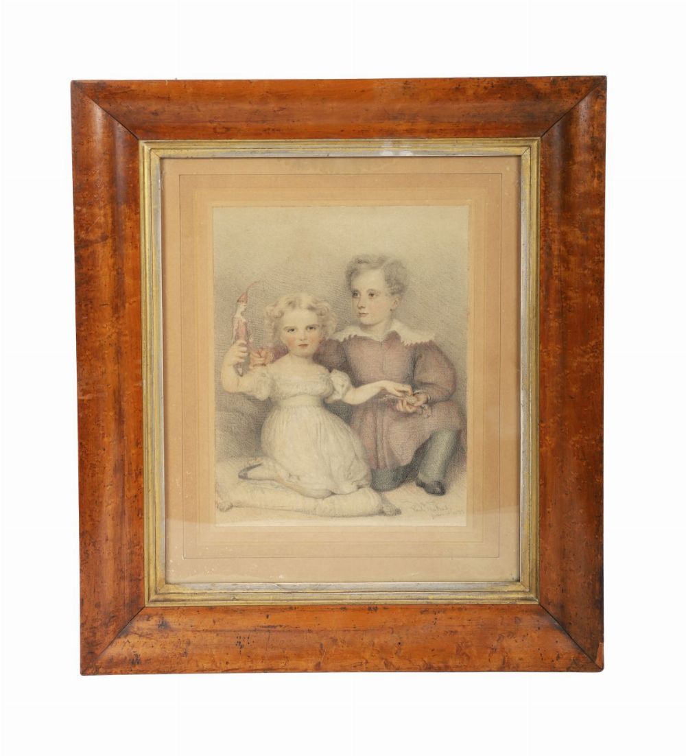 Pencil and watercolour on paper. A finely detailed study of a young boy and girl, the latter holding a small doll.