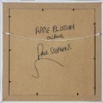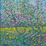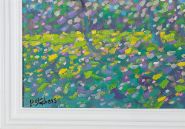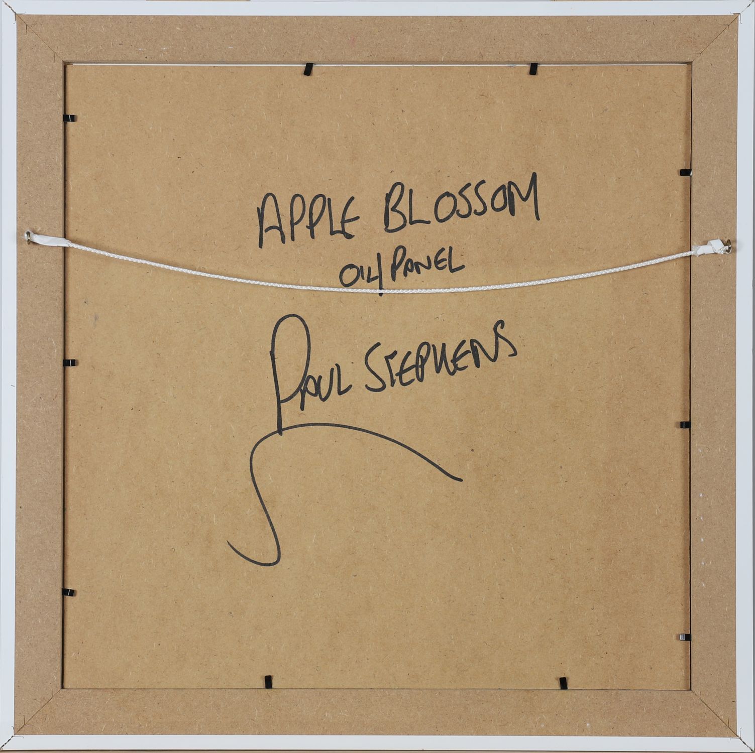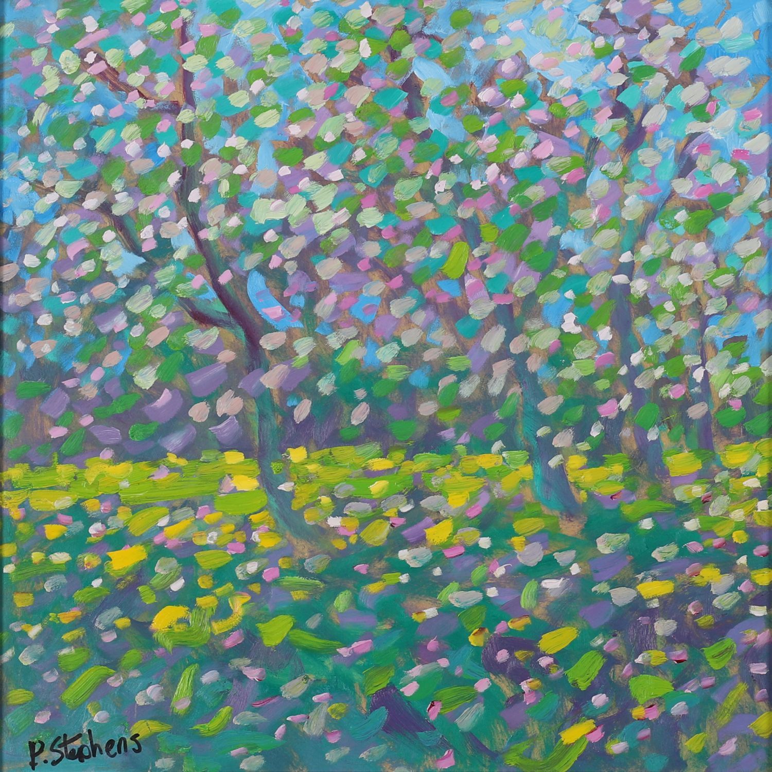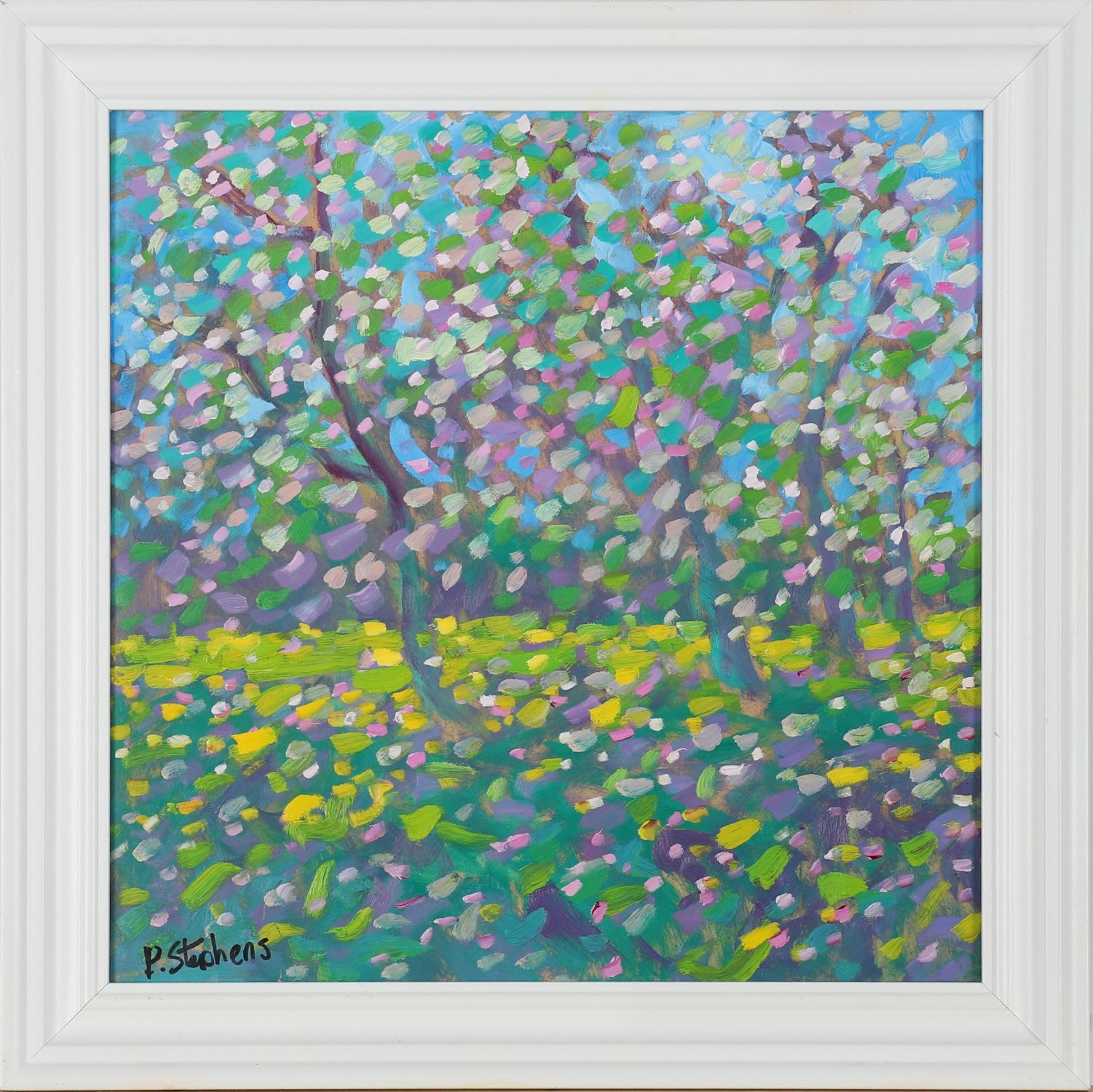 An oil on canvas by Paul Stephens, depicting an orchard in full bloom, painted in vibrant impressionist dabs of pink, purple, green, and yellow. Signed lower left. Presented in a white painted frame.