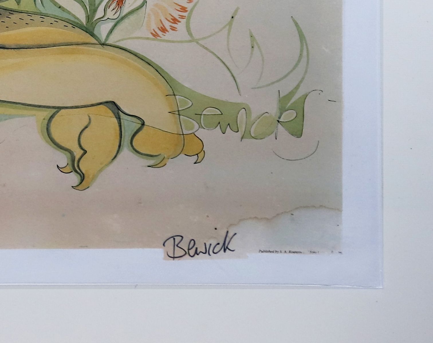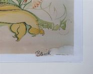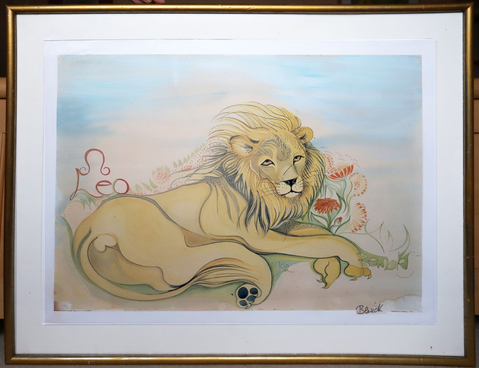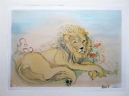 Signed limited edition print depicting a reclining lion amidst stylised floral forms. Framed.