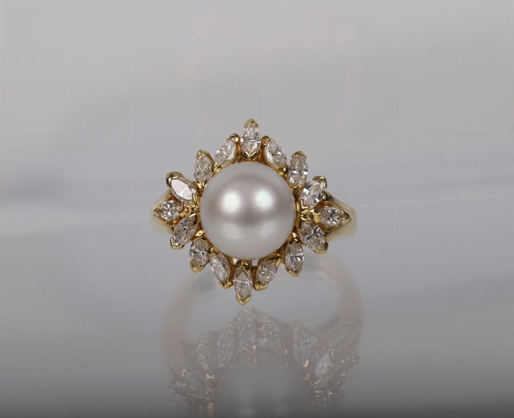 Lot 574 PEARL AND DIAMOND RING, 18 CT. GOLD