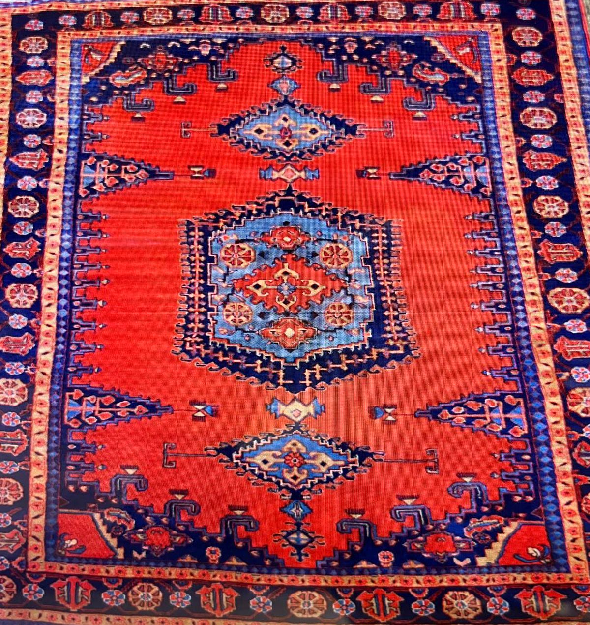 A Persian Heriz hand-knotted wool rug, featuring a bold geometric medallion design on a vibrant red field with indigo and sky-blue accents, framed by multiple floral and geometric borders.