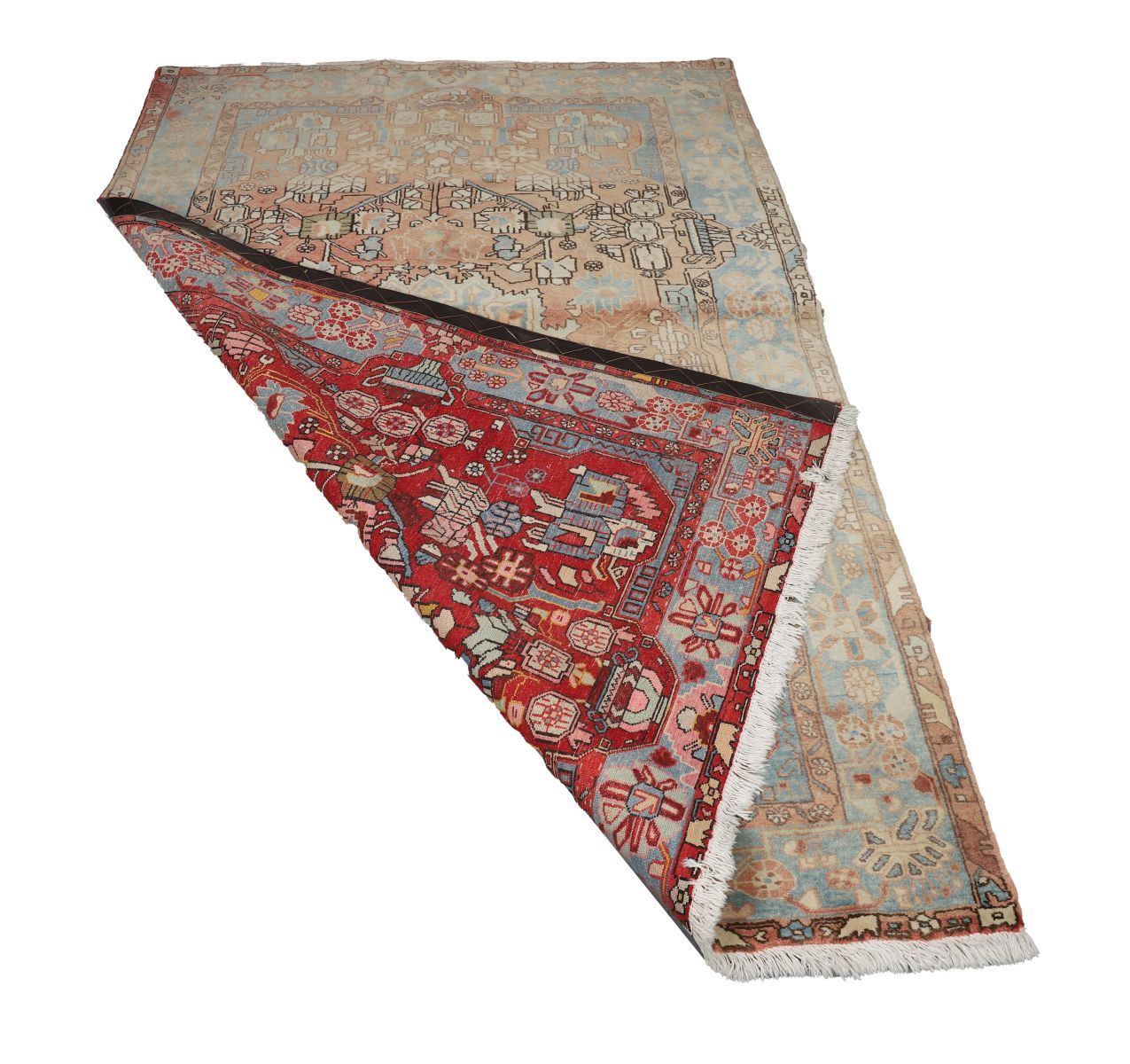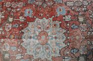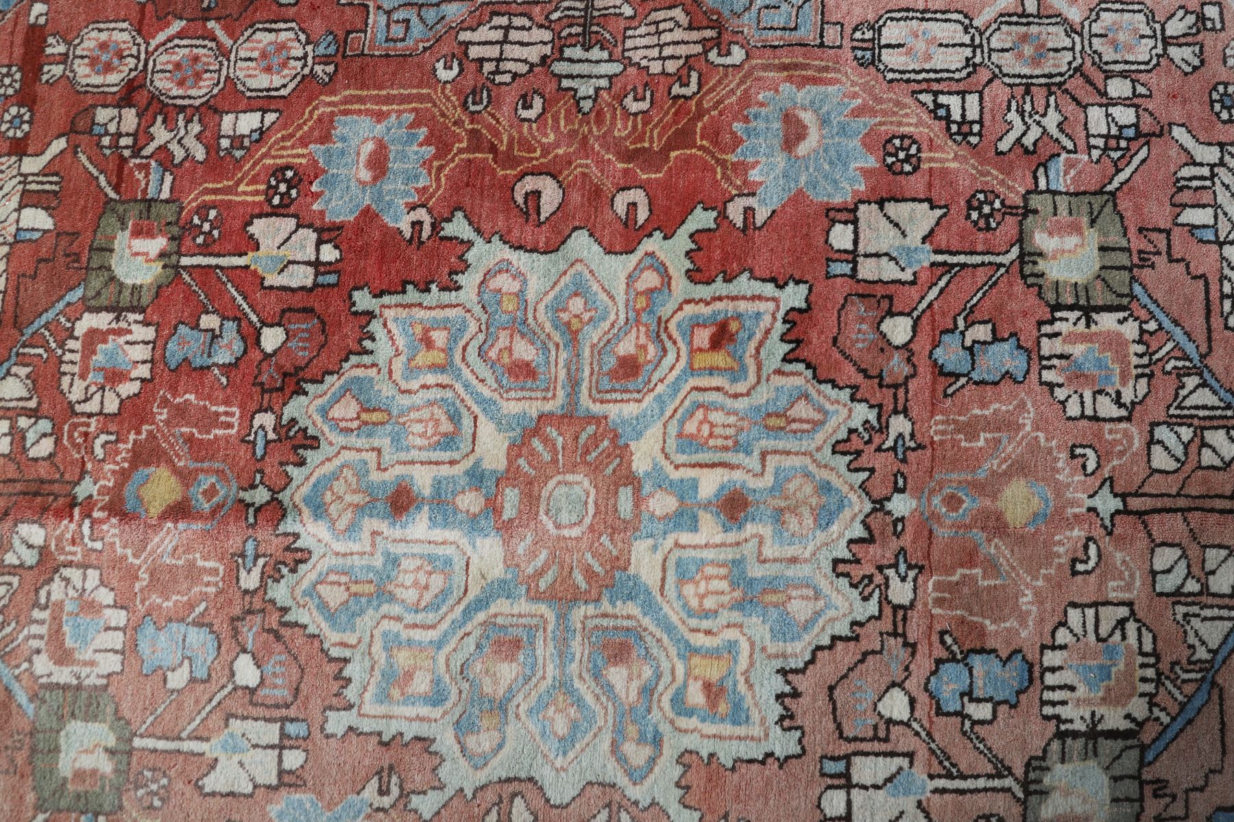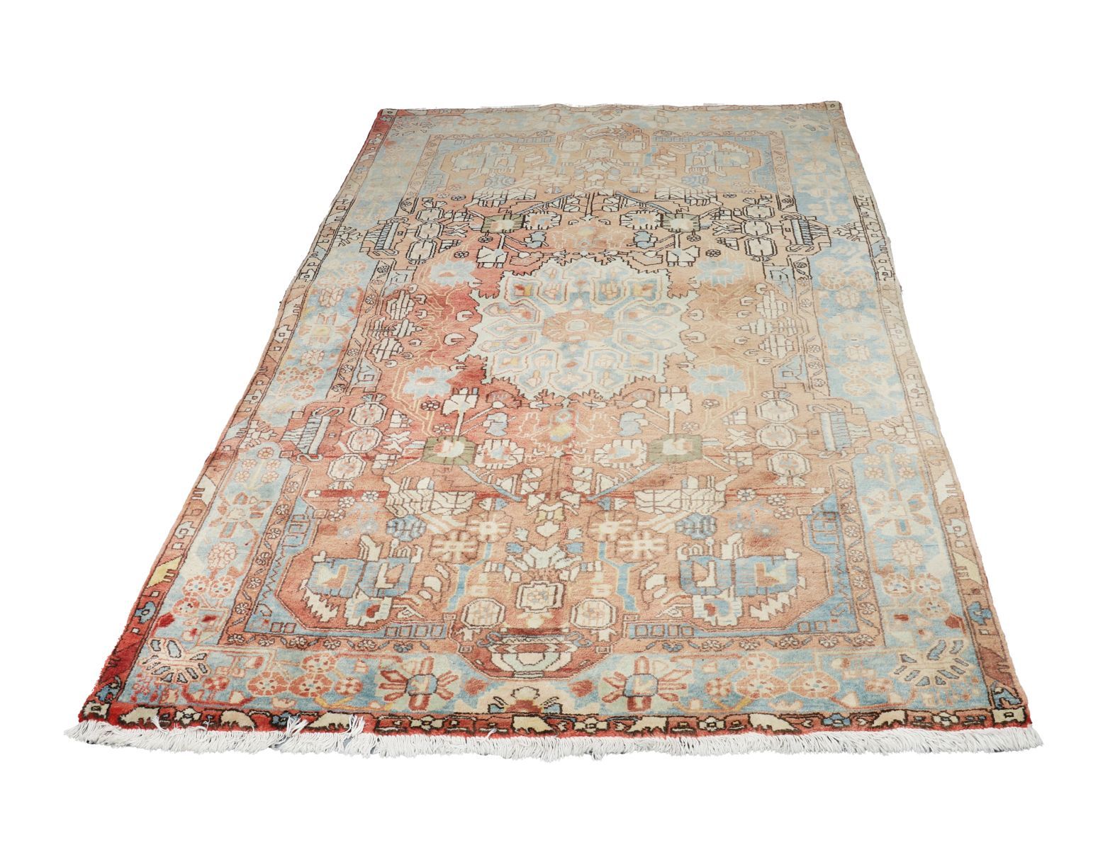 A hand-knotted Persian Nahavand rug, the central ivory medallion within a rust-red field decorated with stylised floral and geometric motifs in pale blue, cream, and brown, enclosed by a broad border of palmette and angular vine design. Wool pile on cotton foundation. Retains original fringes.