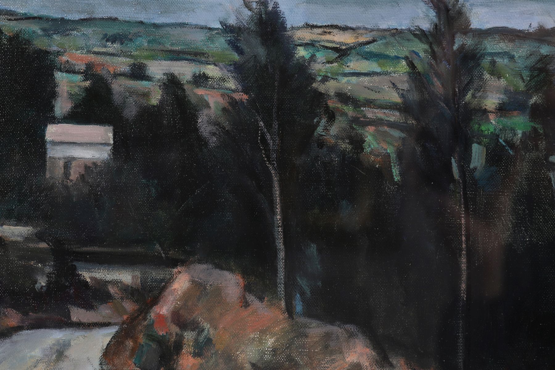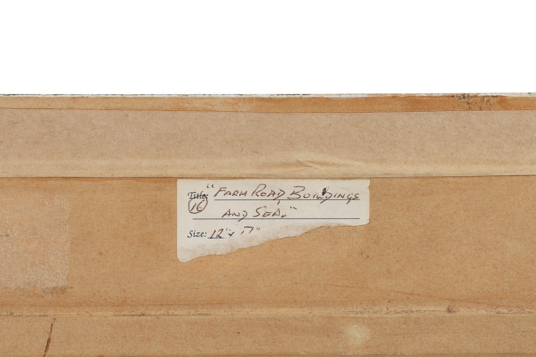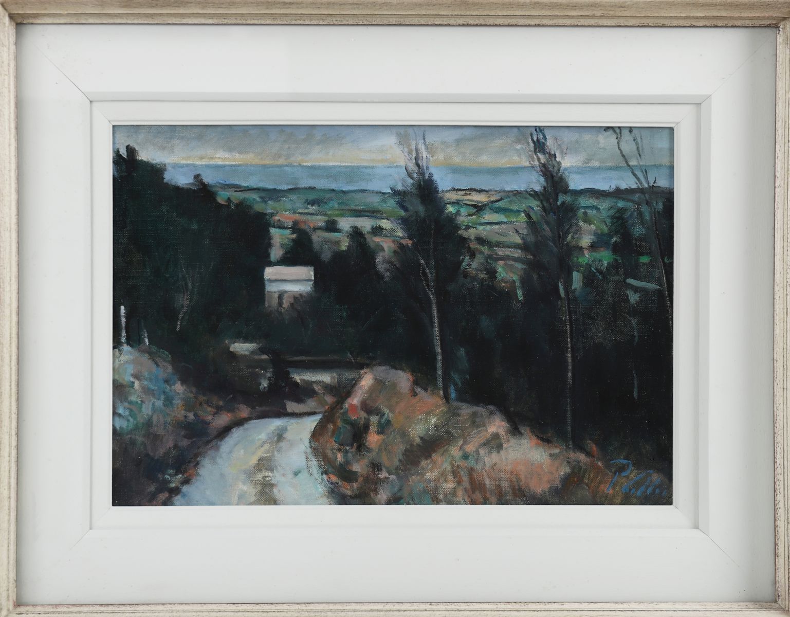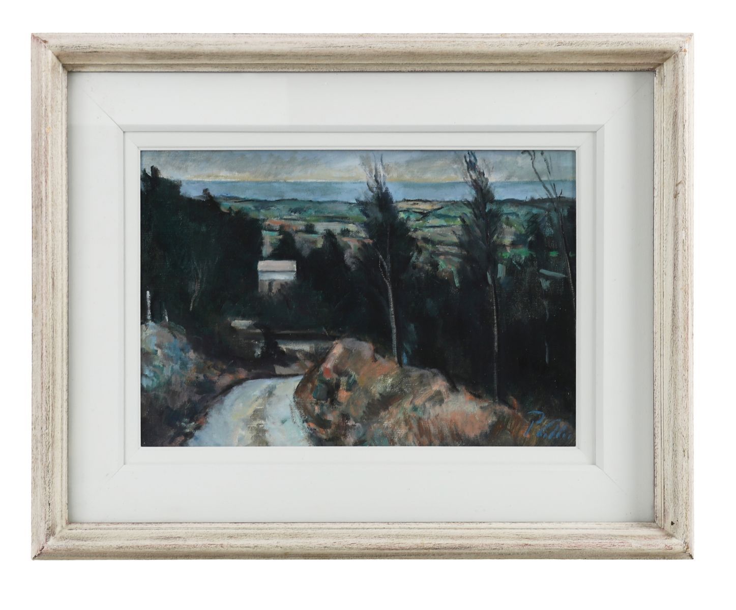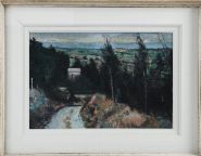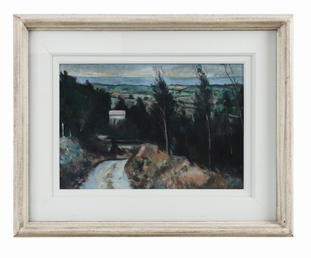 A rural landscape depicting a sloping farm track flanked by trees and outbuildings, rendered in Collis’ distinctive simplified forms and structured colour blocks. The subdued palette and rhythmic brushwork emphasise quiet countryside architecture. Signed bottom right and framed in a rustic grey moulded frame.