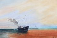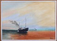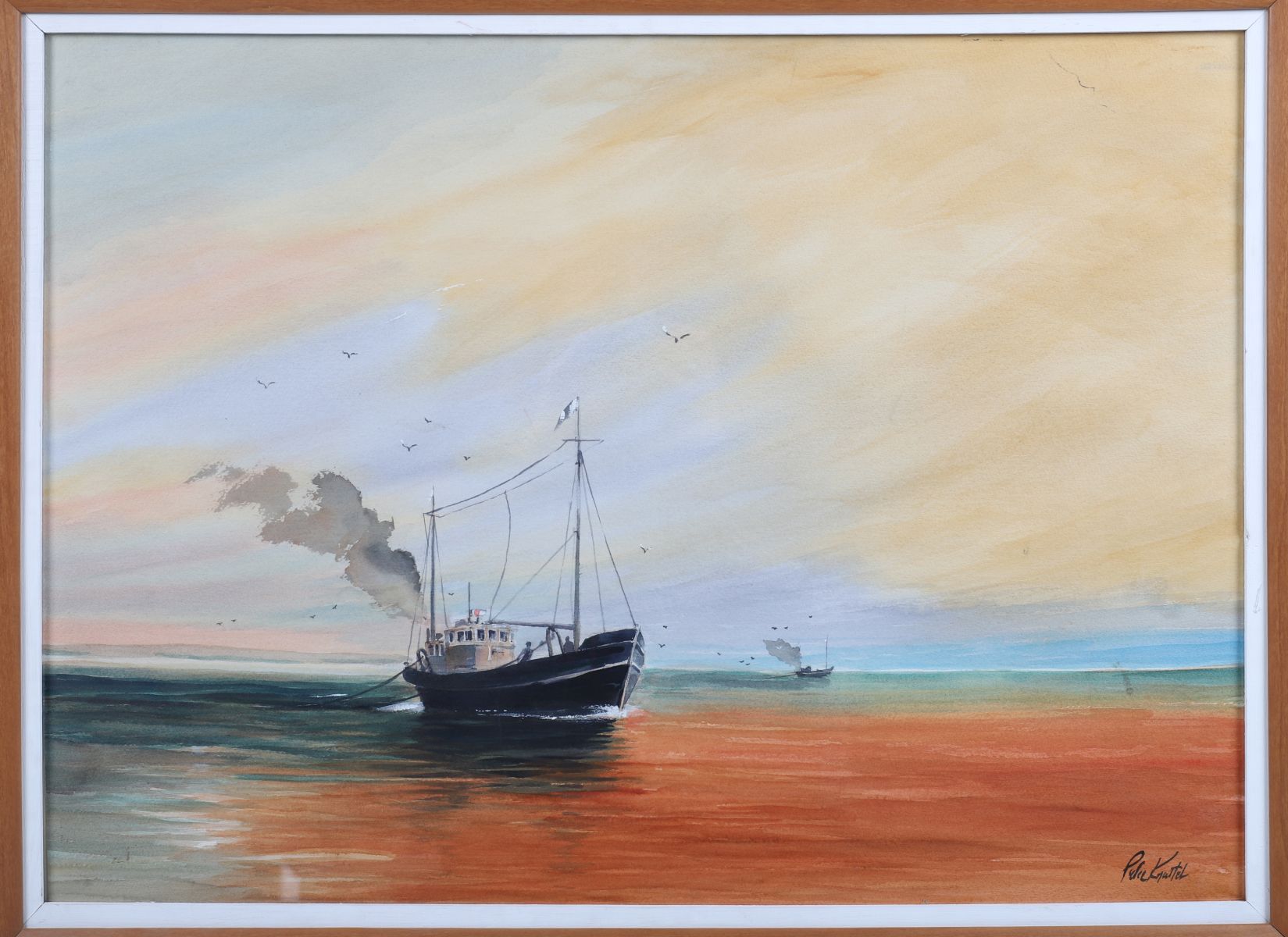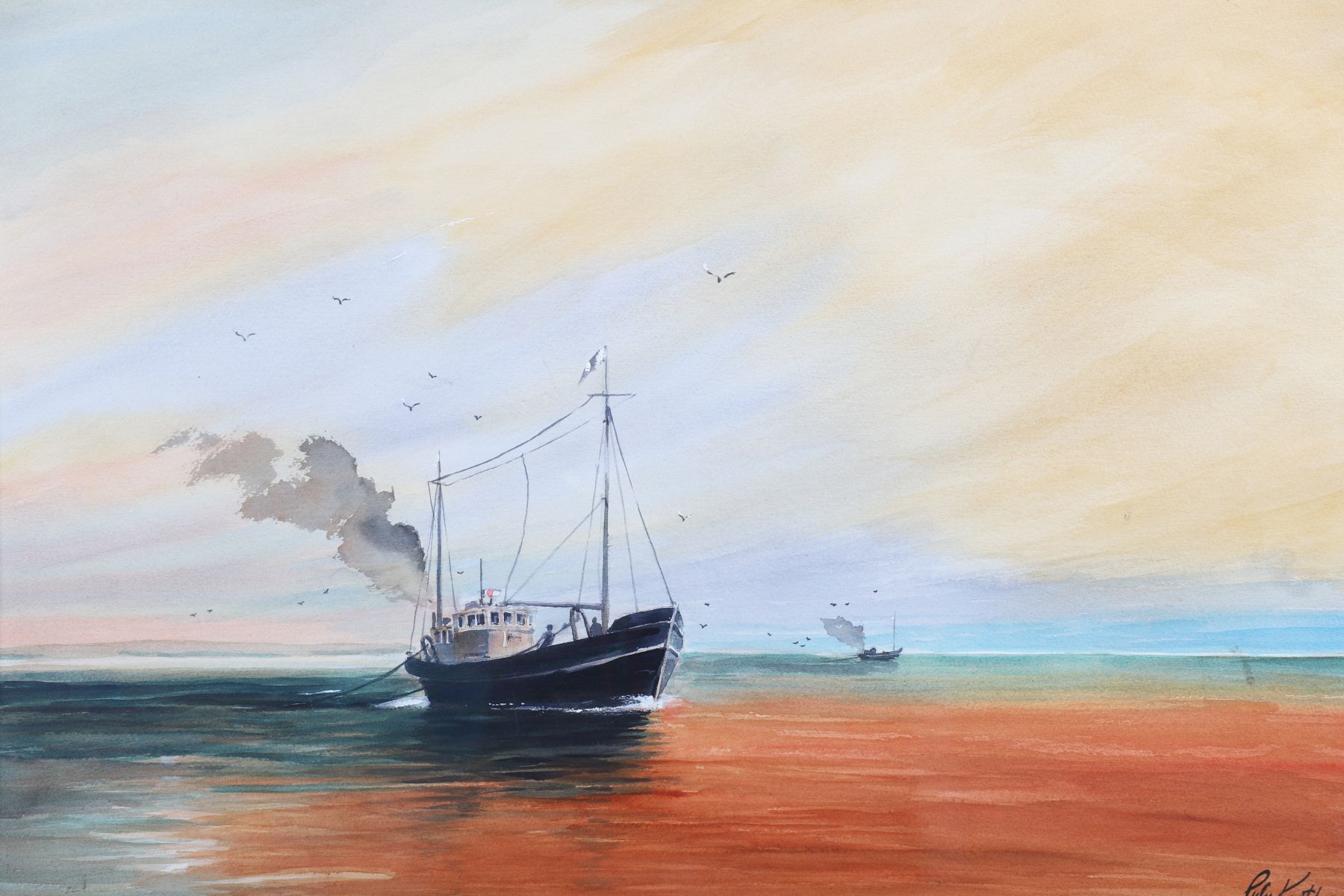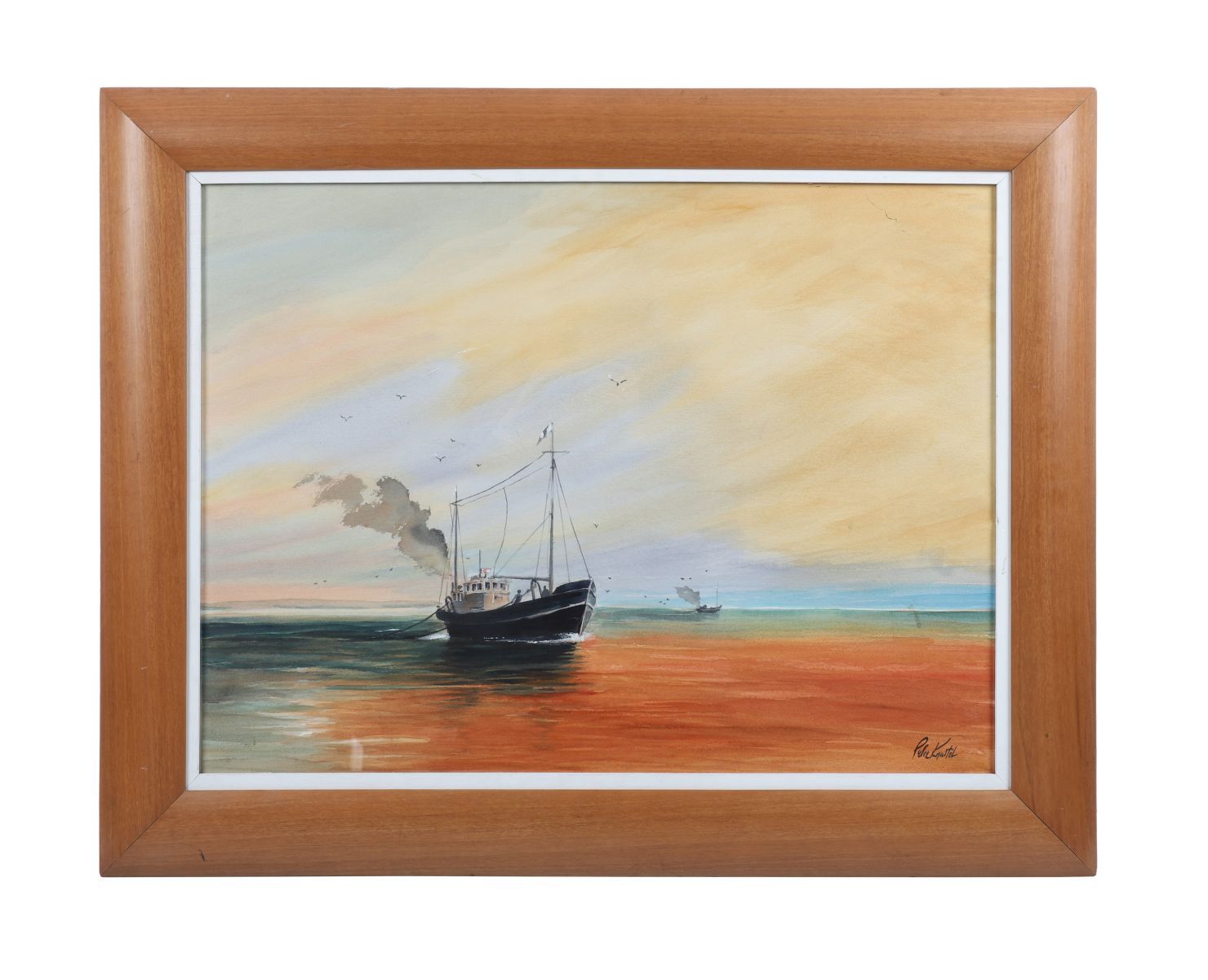 Depicting trawlers under a glowing evening sky with gulls above. Signed lower right and framed. Emer Gallery and Apollo Gallery labels verso.