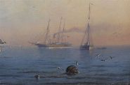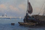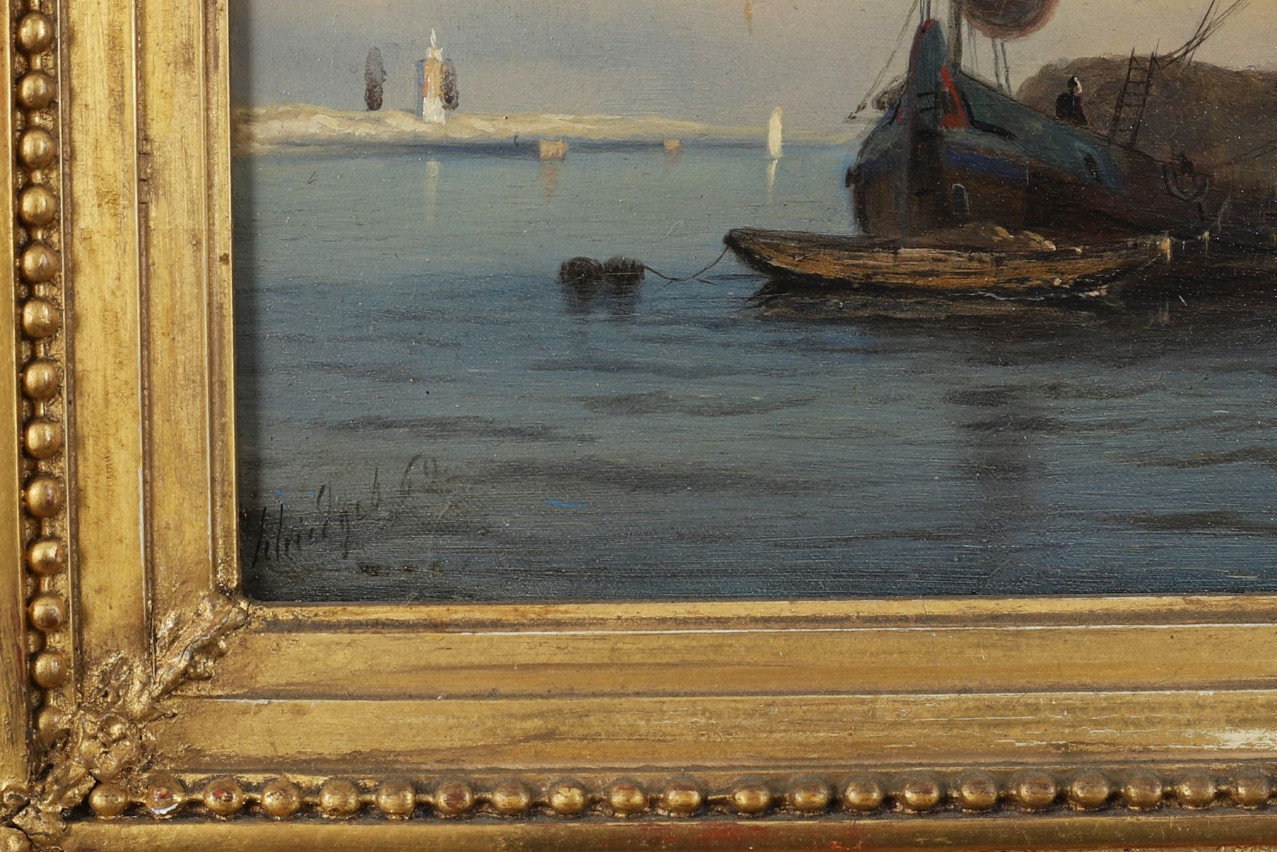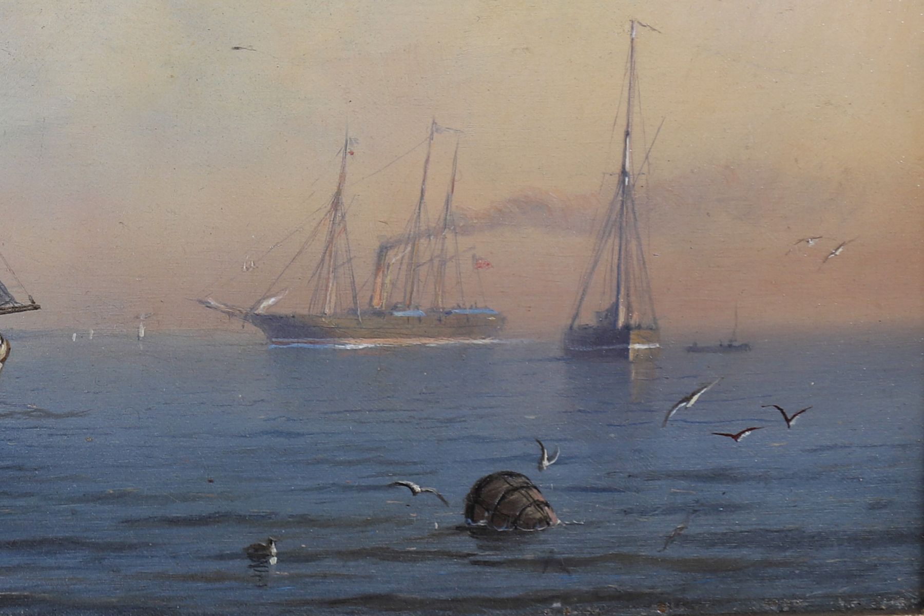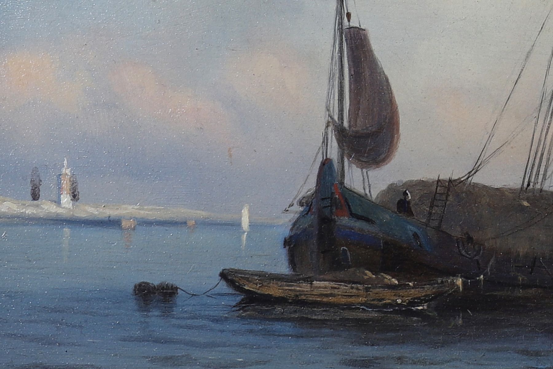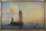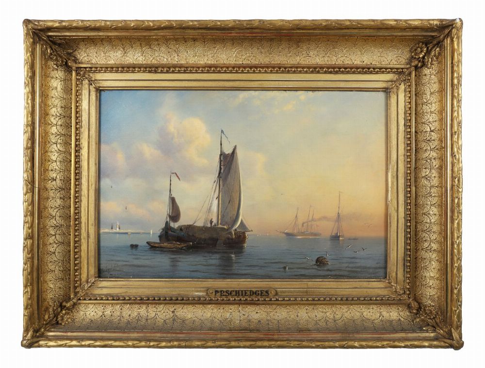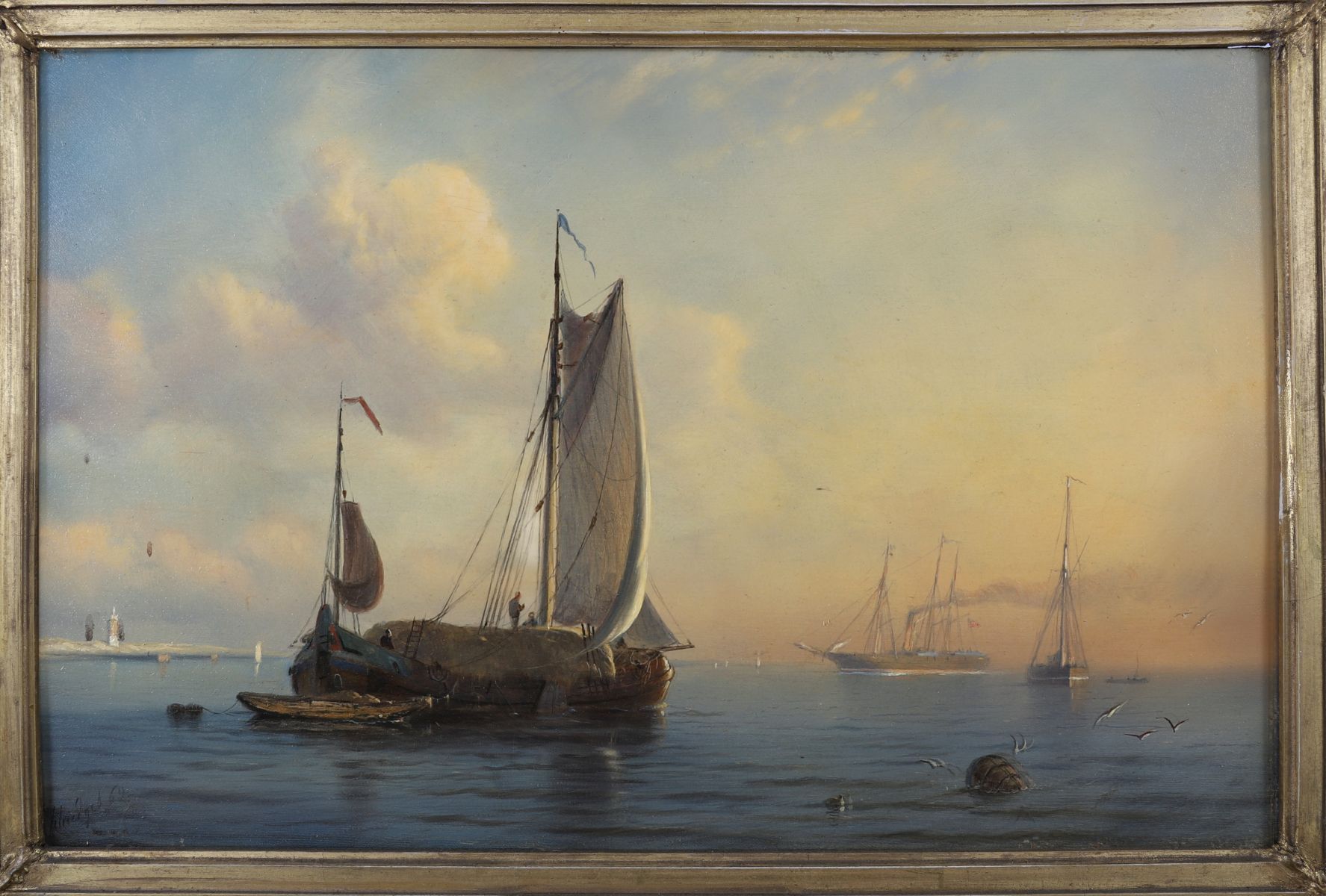 A calm seascape depicting Dutch sailing vessels near the shore beneath a softly clouded sky. Oil on panel, signed lower left. Presented in a gilt frame.