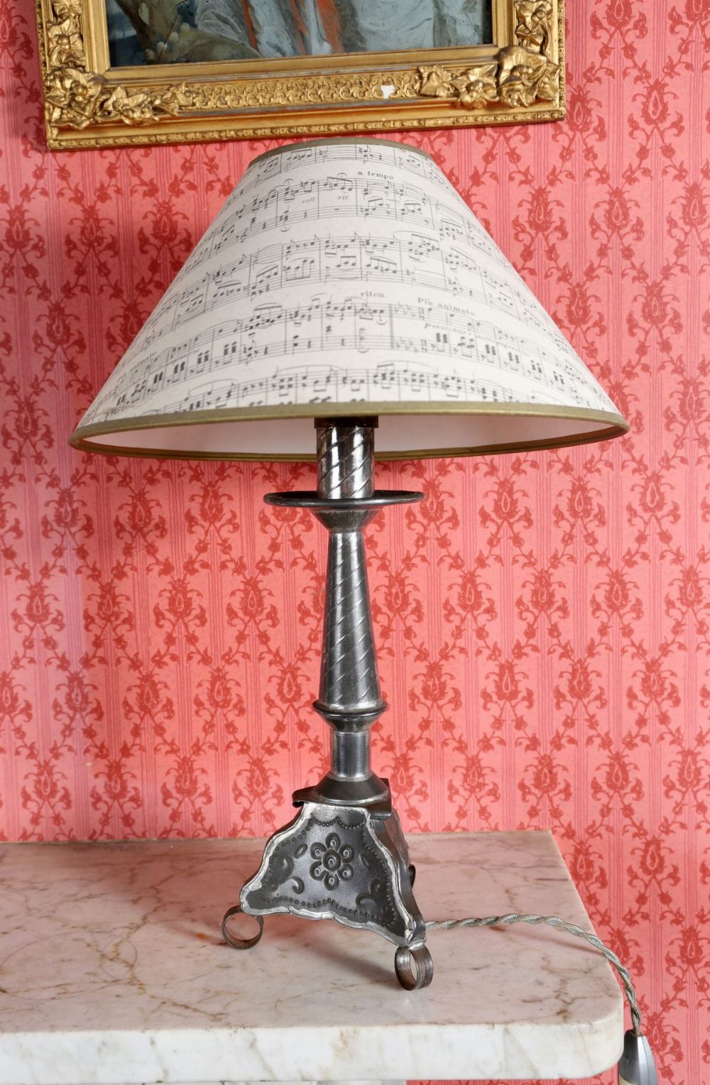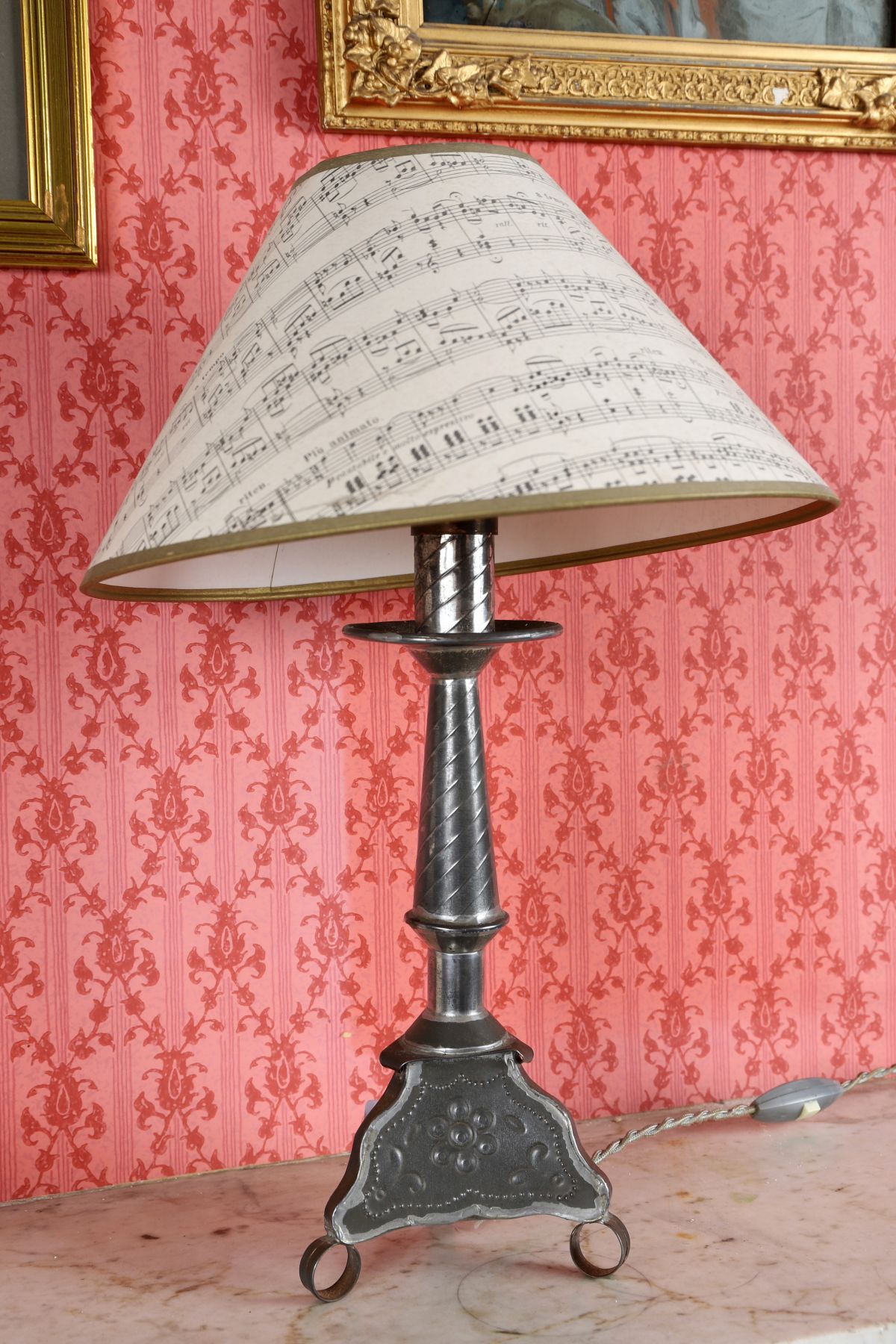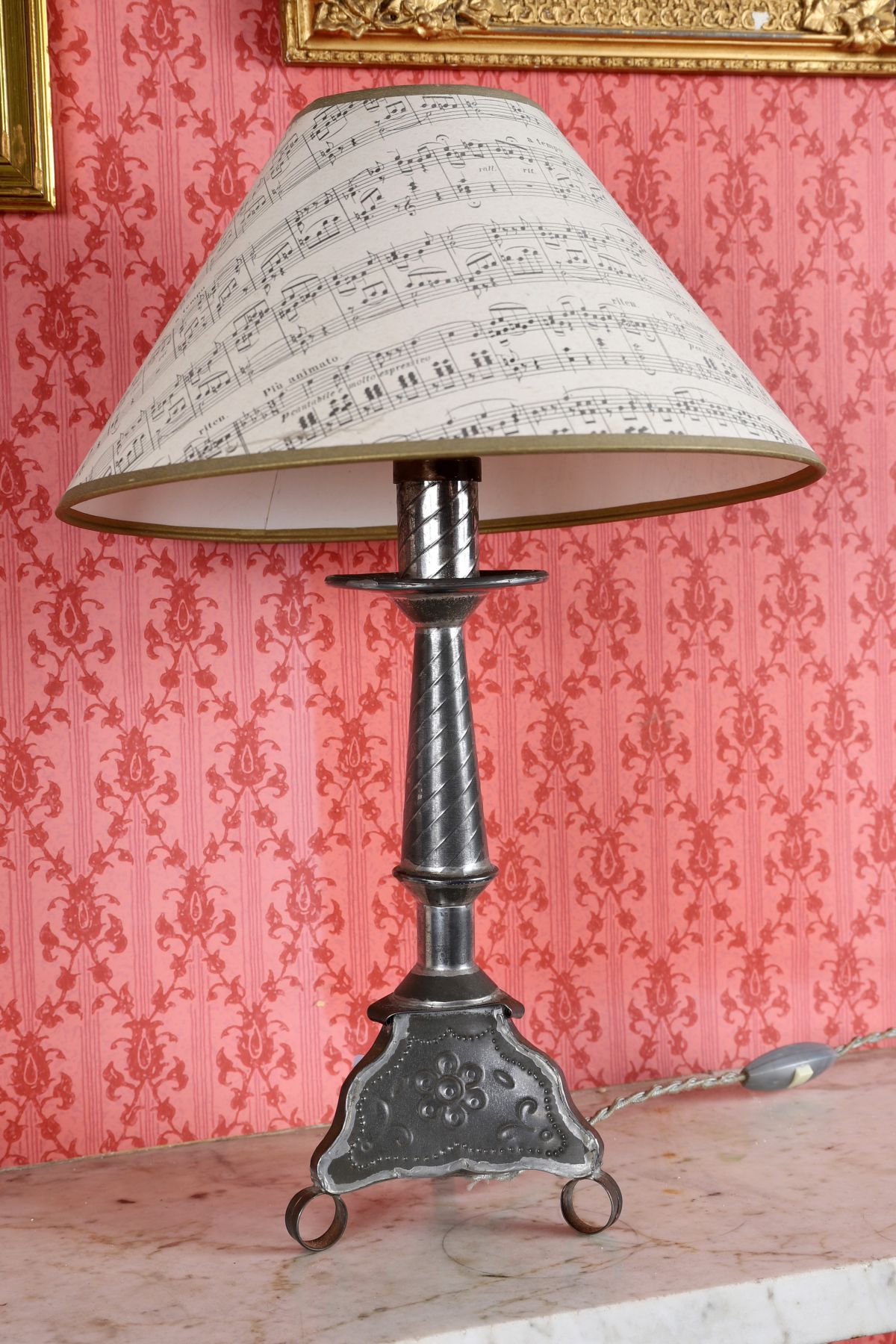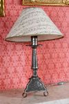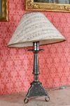The tapered pewter column on a shaped tripod base, fitted for electricity and surmounted by a printed shade. 20th century.
