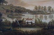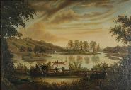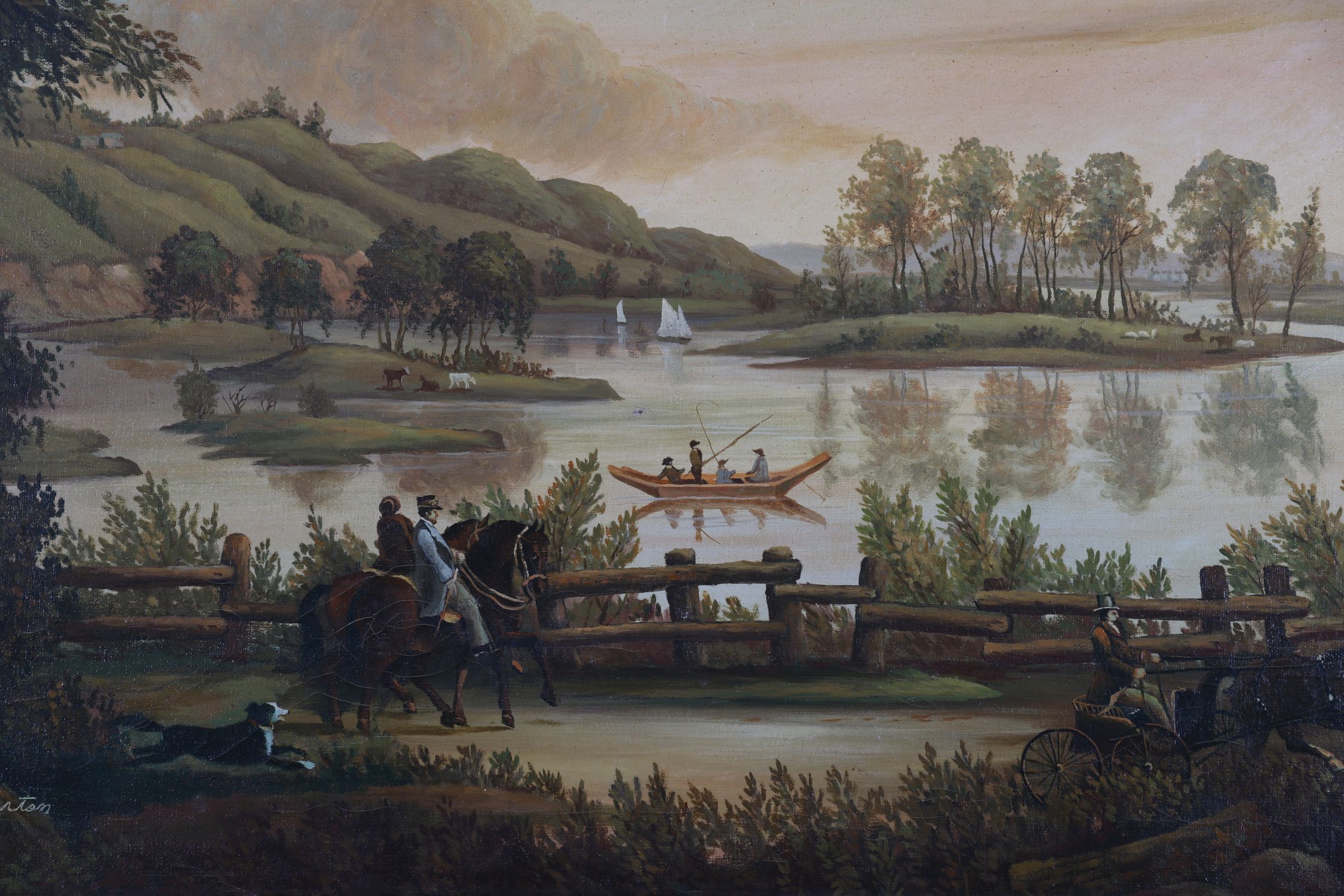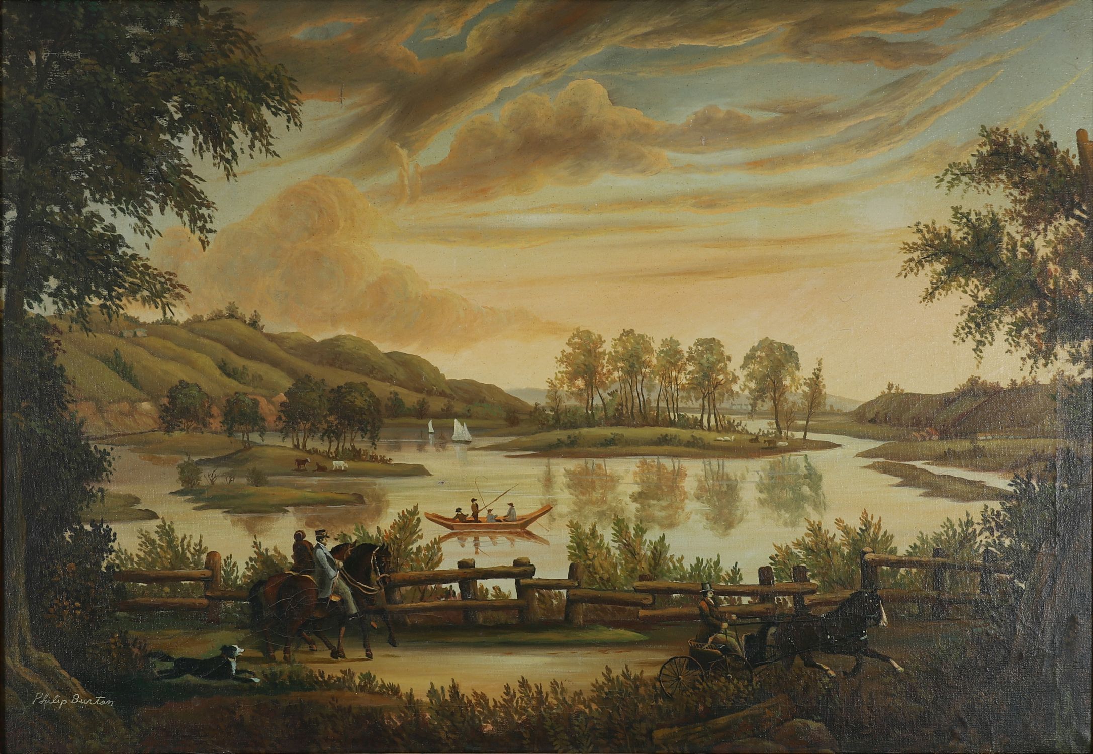 A finely executed landscape scene by Philip Burton, depicting a horse-drawn carriage crossing a wooden bridge in the foreground, with figures boating on a reflective lake, framed by wooded hills and dramatic cloudscape. Rich in period detail and atmosphere.