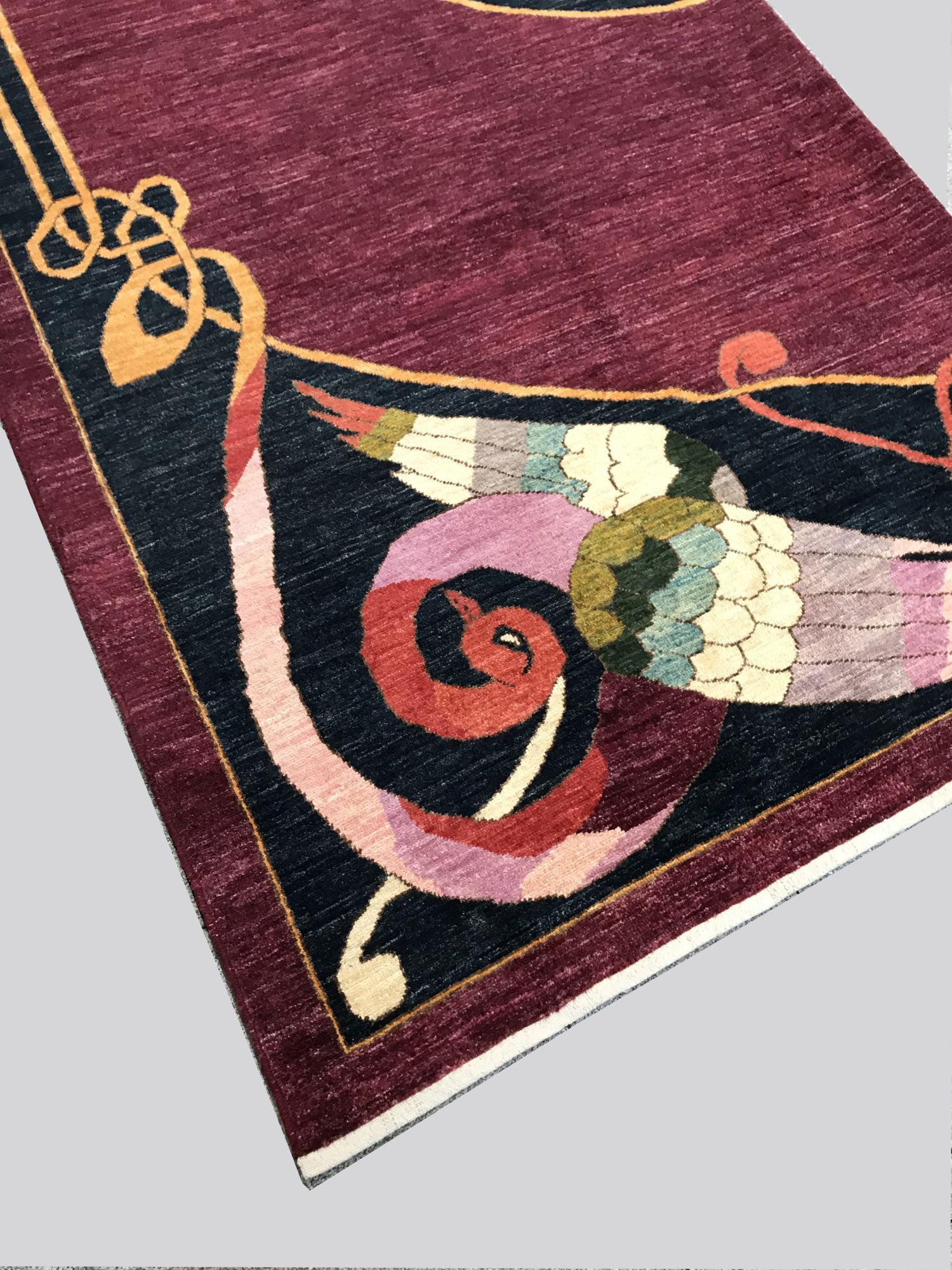 Made in Honour of Emer wife of Cuchulainn. The bold central field in deep burgundy is adorned with a circular wreath of interlacing abstract scrollwork in pink, orange, lilac, and green, framed by stylised corner motifs featuring dramatic, curling birds with plumage rendered in jewel-toned hues. The border is outlined with mustard-gold lines terminating in Celtic-style knots.