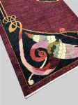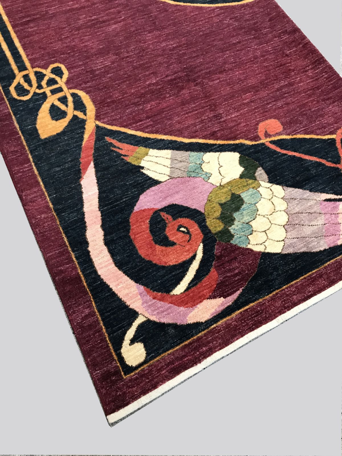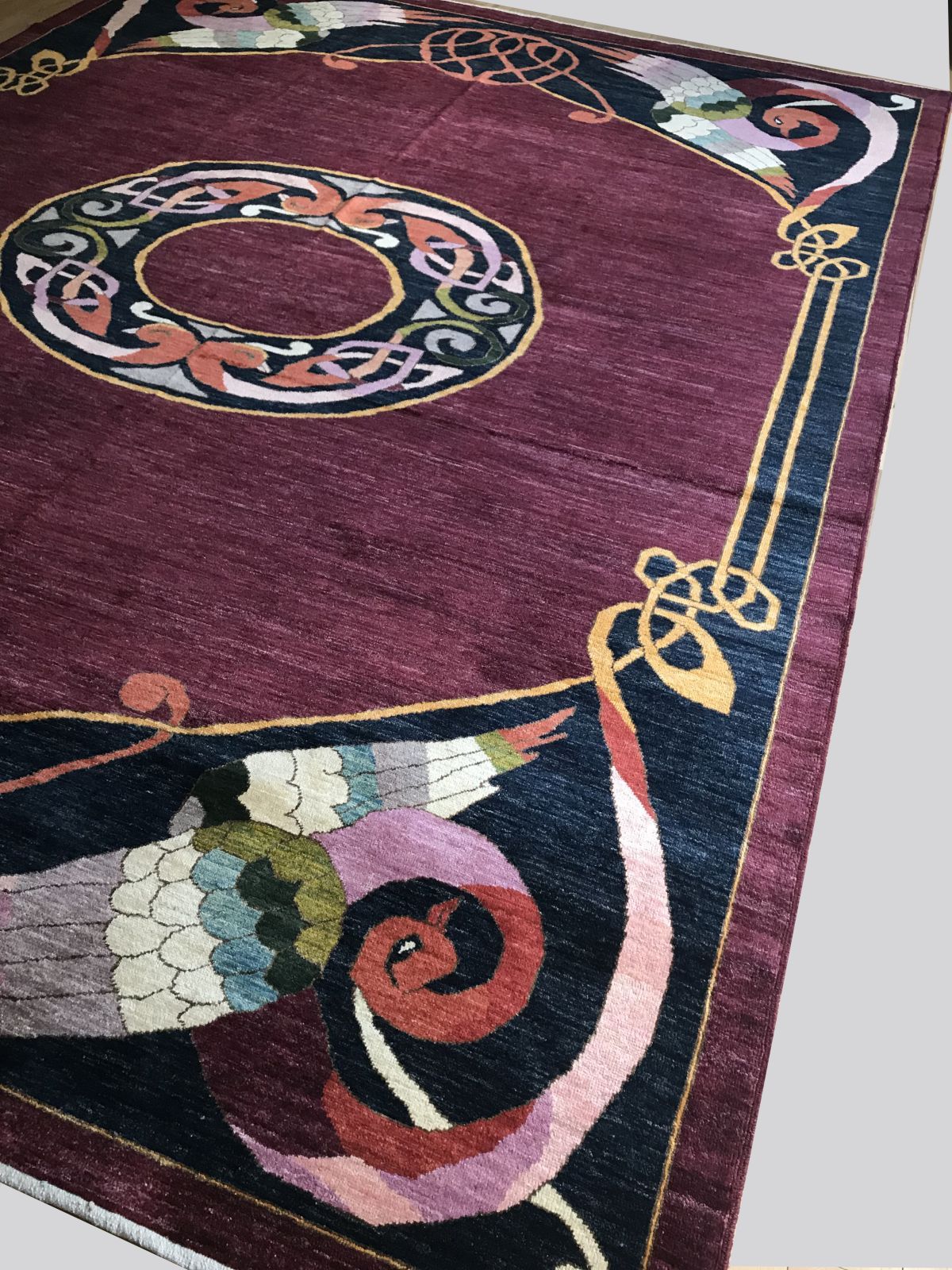 Made in Honour of Emer wife of Cuchulainn. The bold central field in deep burgundy is adorned with a circular wreath of interlacing abstract scrollwork in pink, orange, lilac, and green, framed by stylised corner motifs featuring dramatic, curling birds with plumage rendered in jewel-toned hues. The border is outlined with mustard-gold lines terminating in Celtic-style knots.