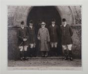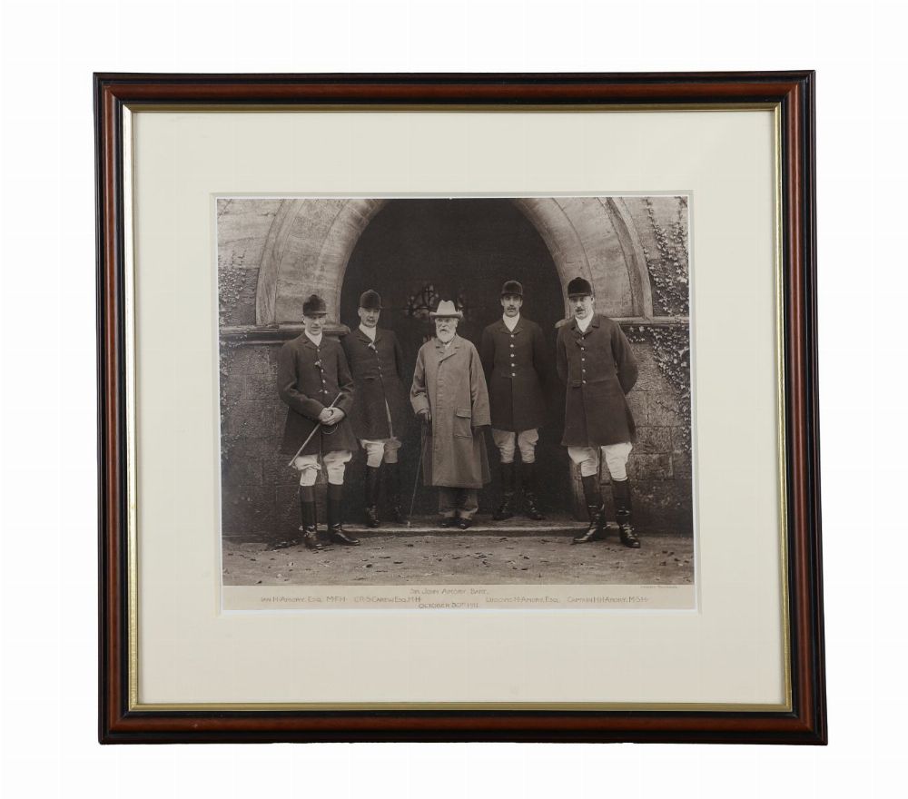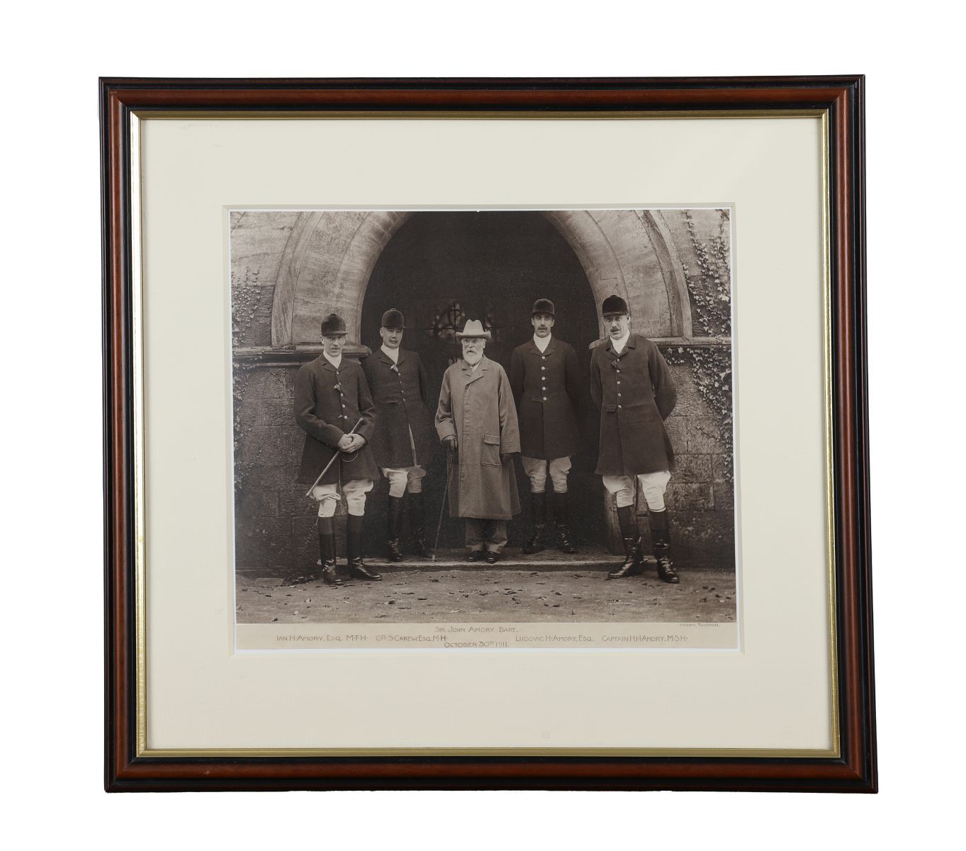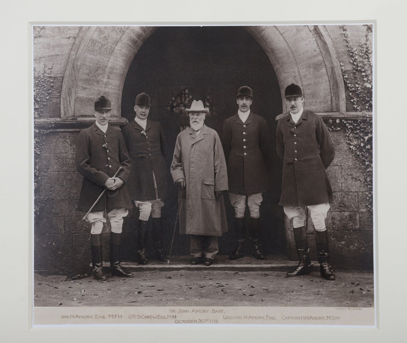 A sepia photograph depicting Sir John Amory, Bart., with Ian H. Amory Esq., M.F.H., C.R.S Carew Esq., M.F.H., Ludovic H. Amory Esq., and Captain H. H. Amory, M.S.H., posed outside a stone archway. Captioned and dated “October 30th, 1911.” Presented in a period wood and gilt frame with mount.