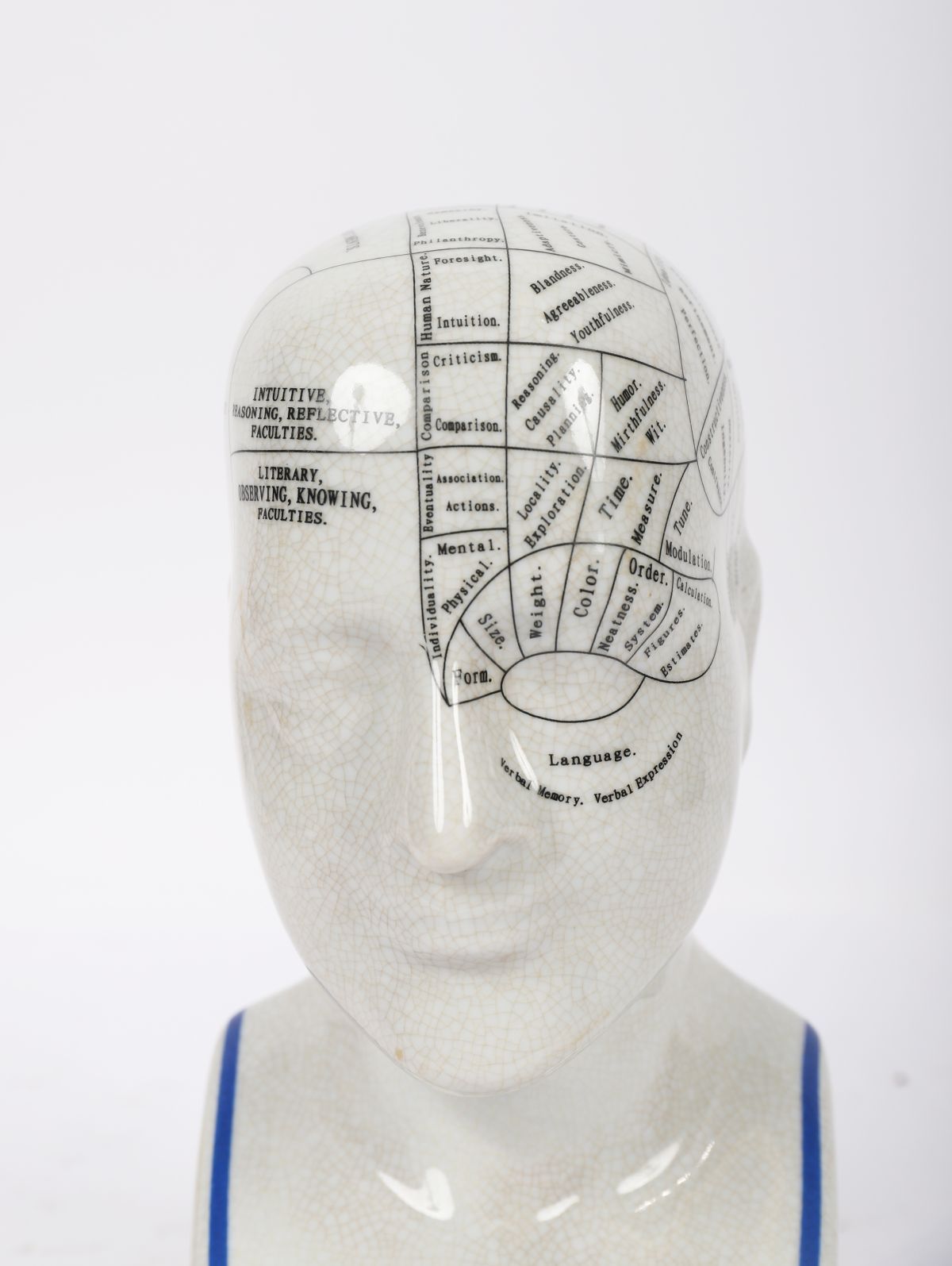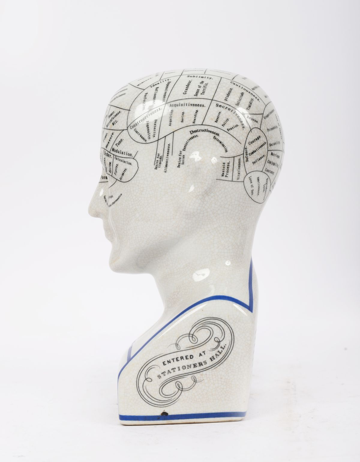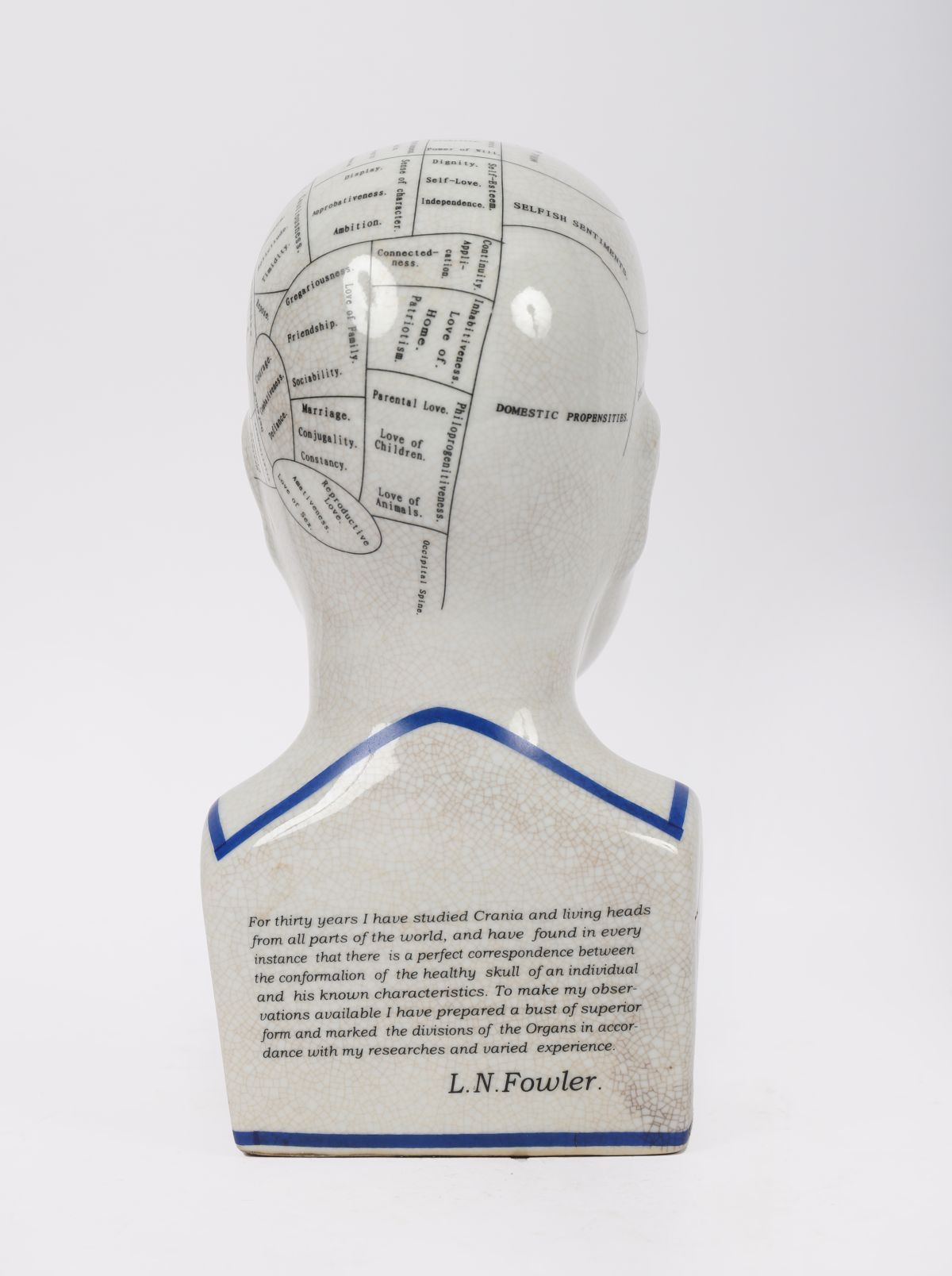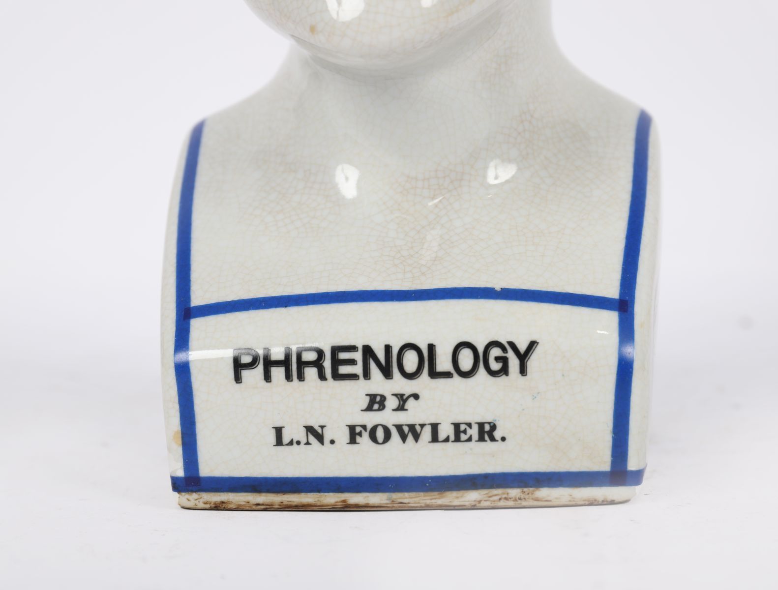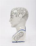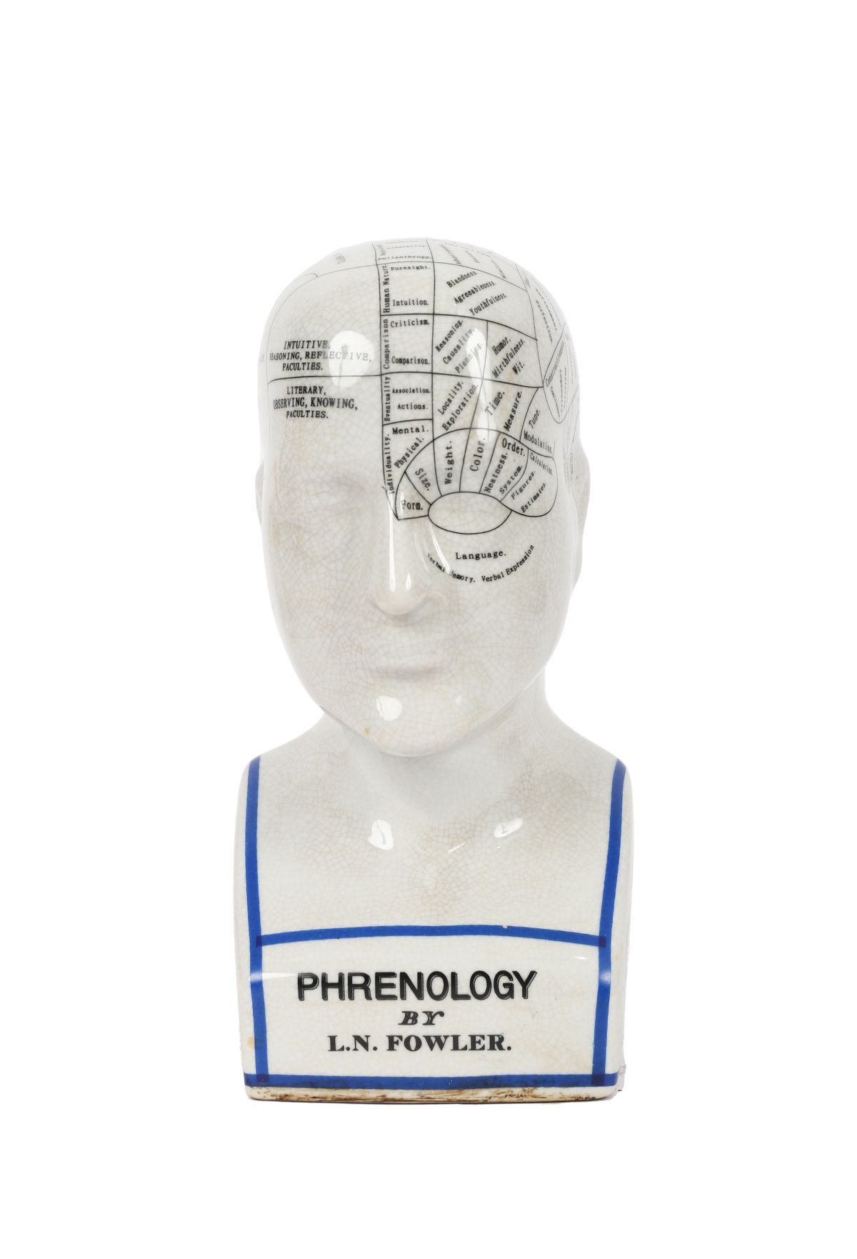 Ceramic model of a phrenology head printed with character and faculty divisions, inscribed “Phrenology by L.N. Fowlerâ€. English, late 19th century style.