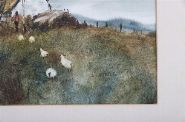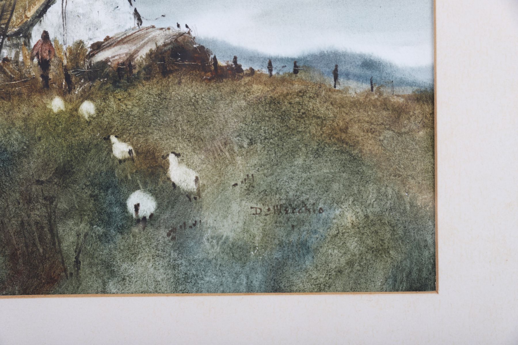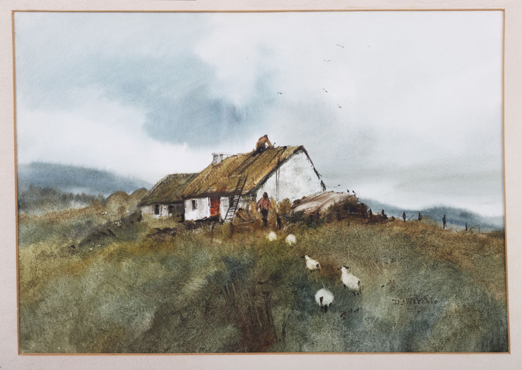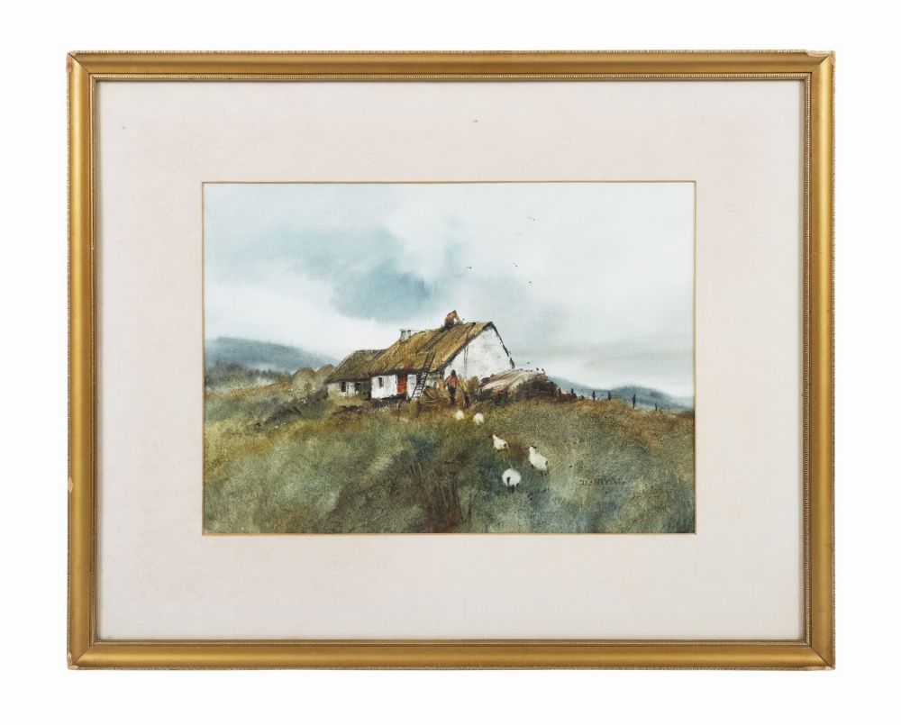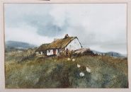 Watercolour landscape depicting a traditional Irish thatched cottage with figures and sheep in the foreground under a moody sky. Executed with a naturalistic palette and fine atmospheric detail.