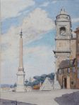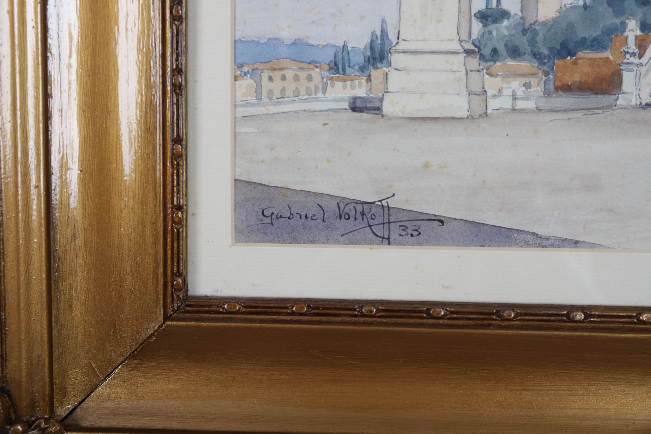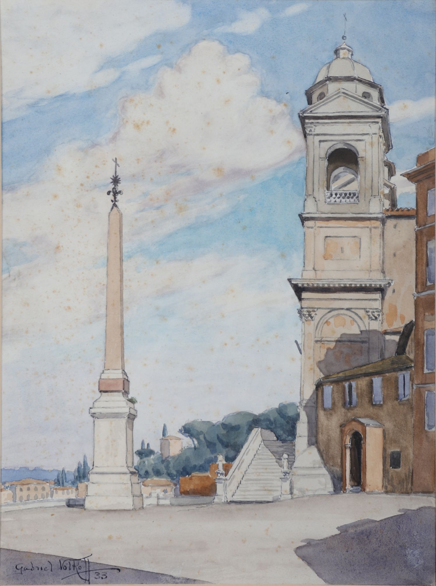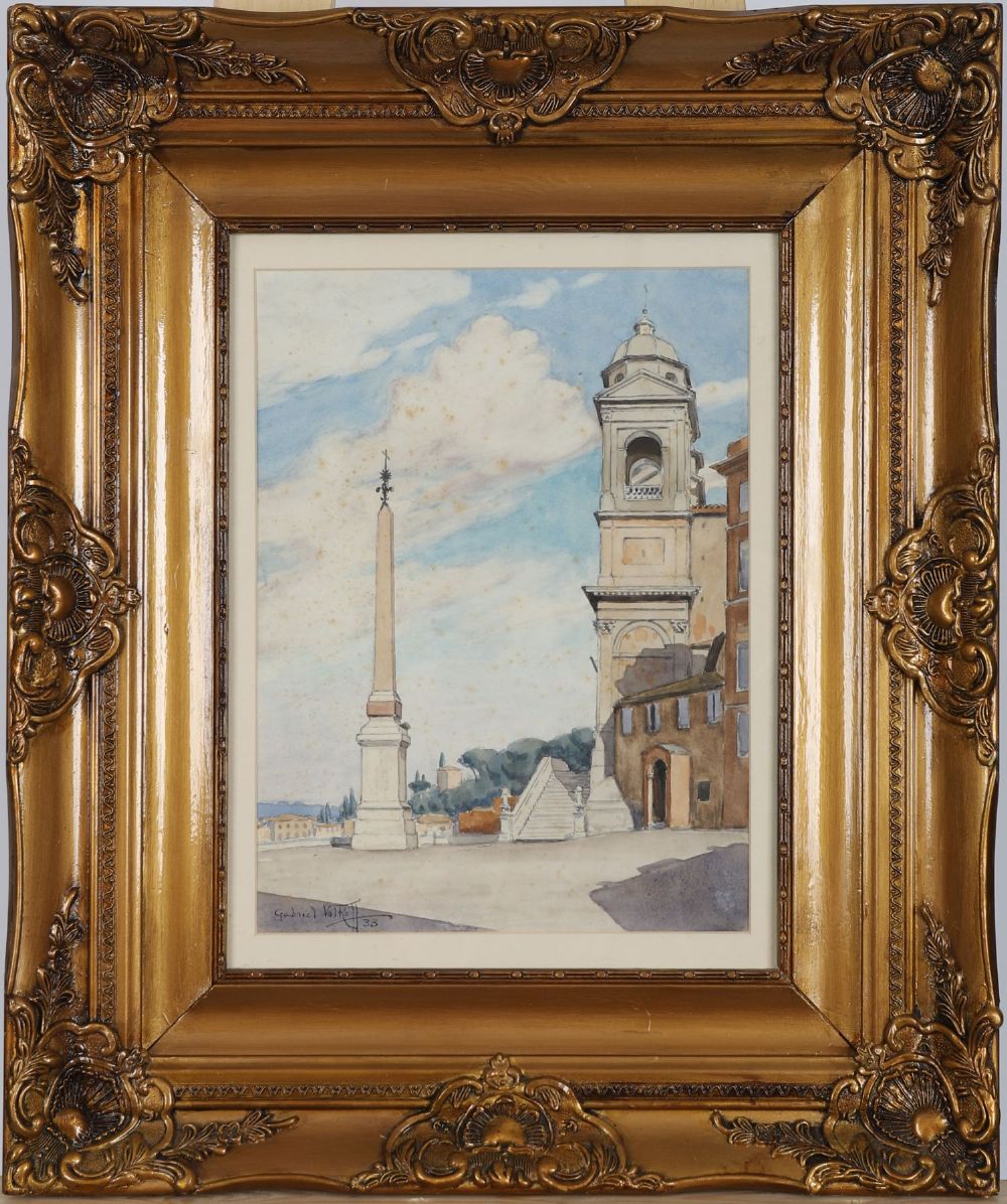 Watercolour depicting the Spanish Steps and obelisk in Rome with architectural detail. Signed and dated lower left “Gualtiero Nativi, 1933â€. Presented in a decorative gilt frame.