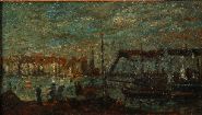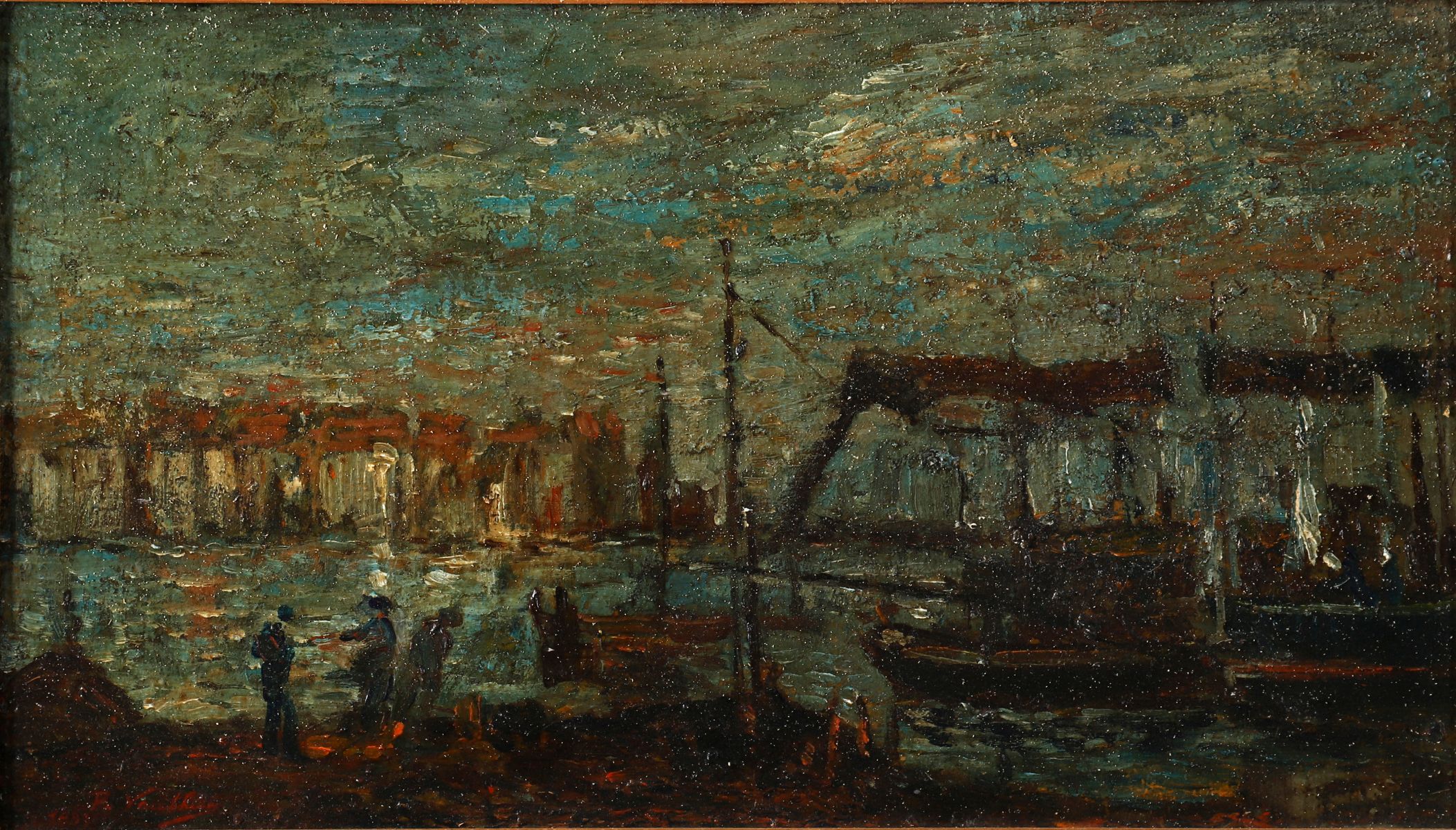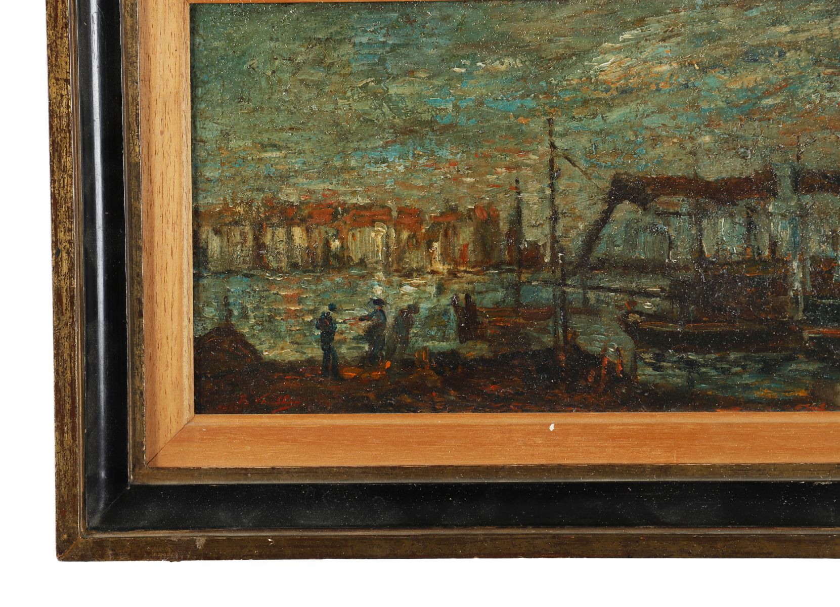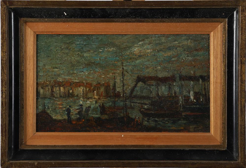 Boats in a harbour. Signed oil on wood panel. Enclosed in a moulded parcel-gilt frame.