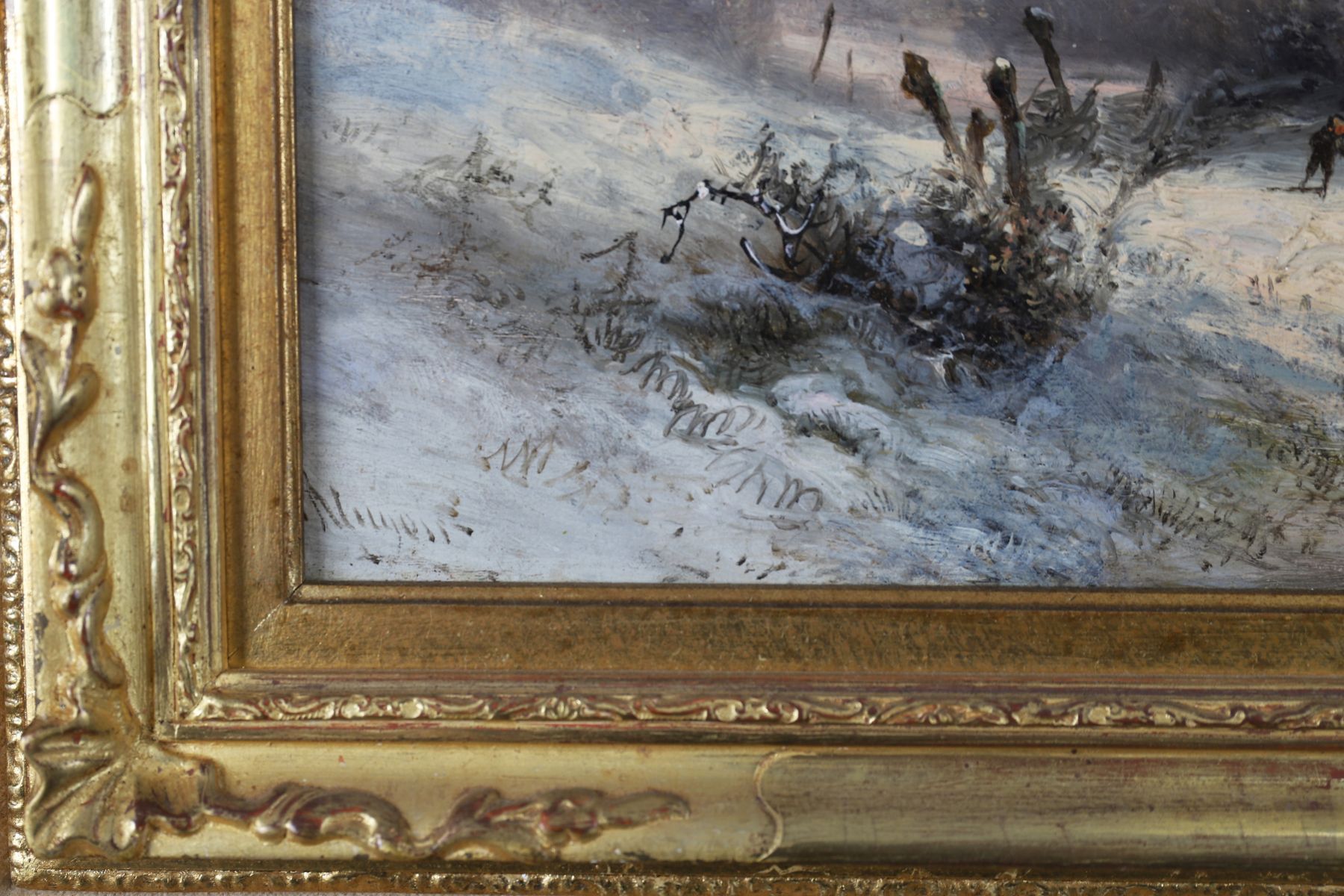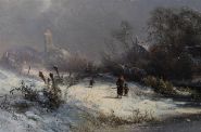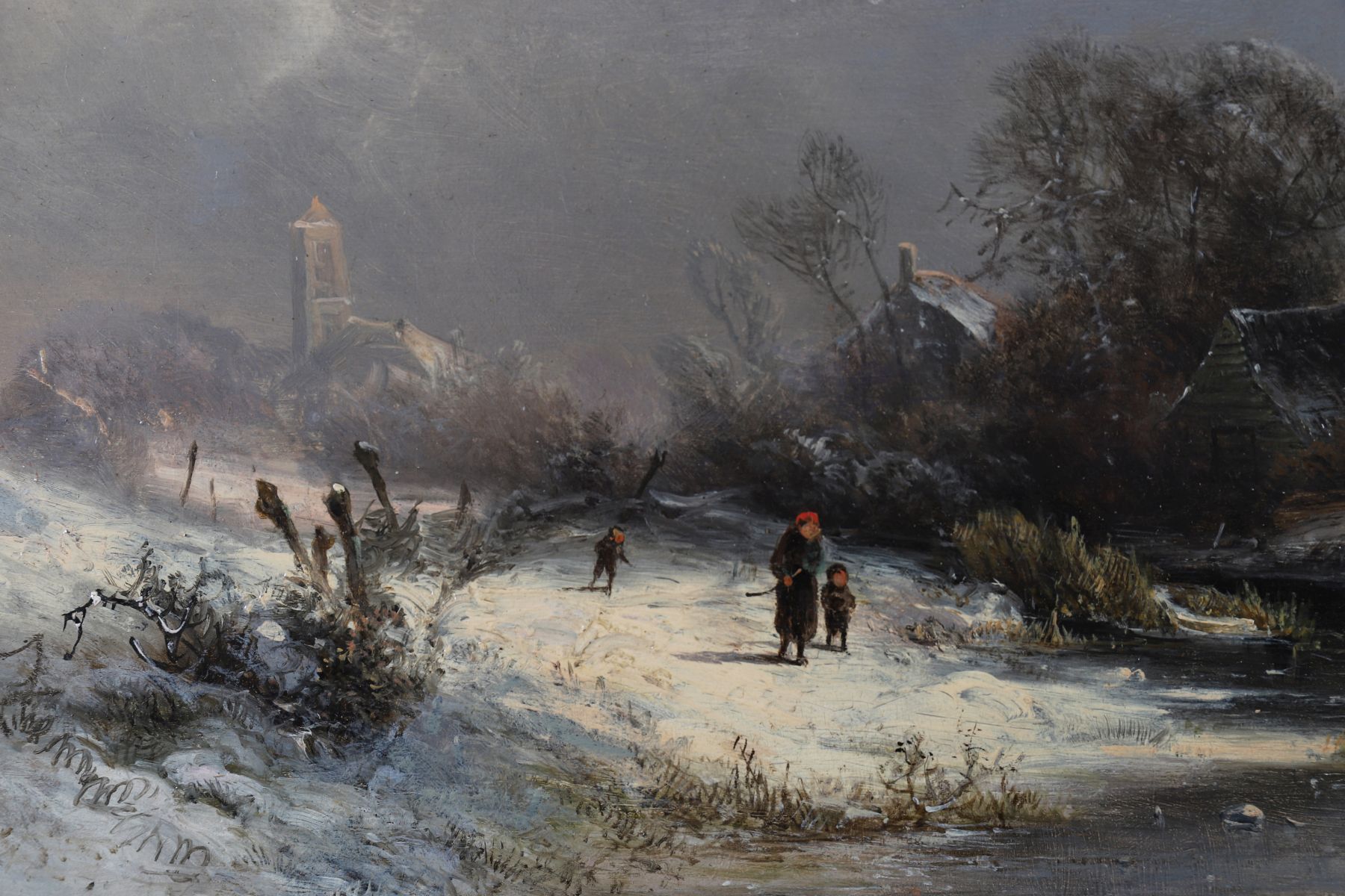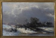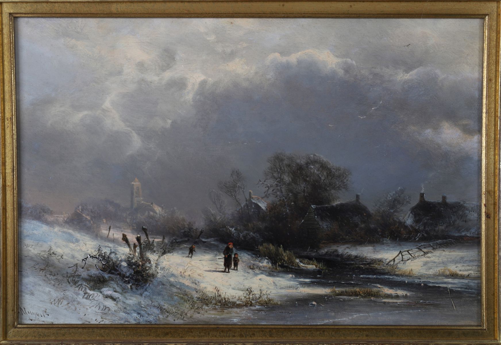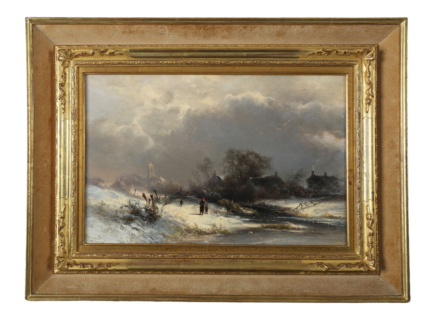 A serene winter scene depicting figures and skaters in a snow-covered village with cottages and a church in the distance. Oil on panel, signed lower right. Presented in a gilt frame.