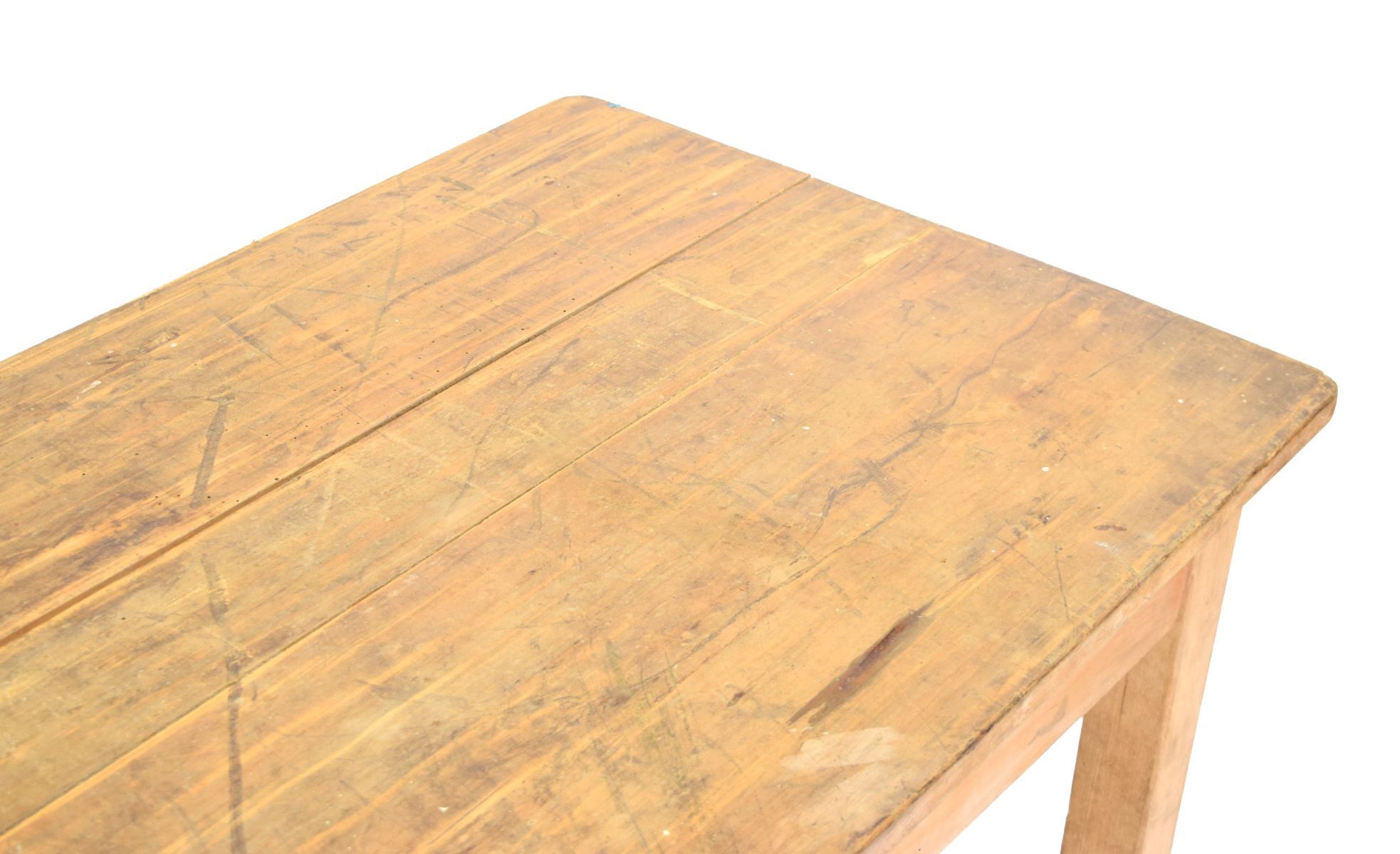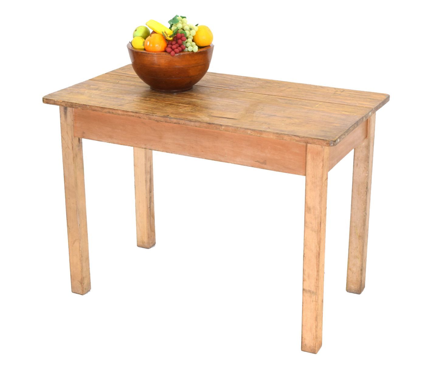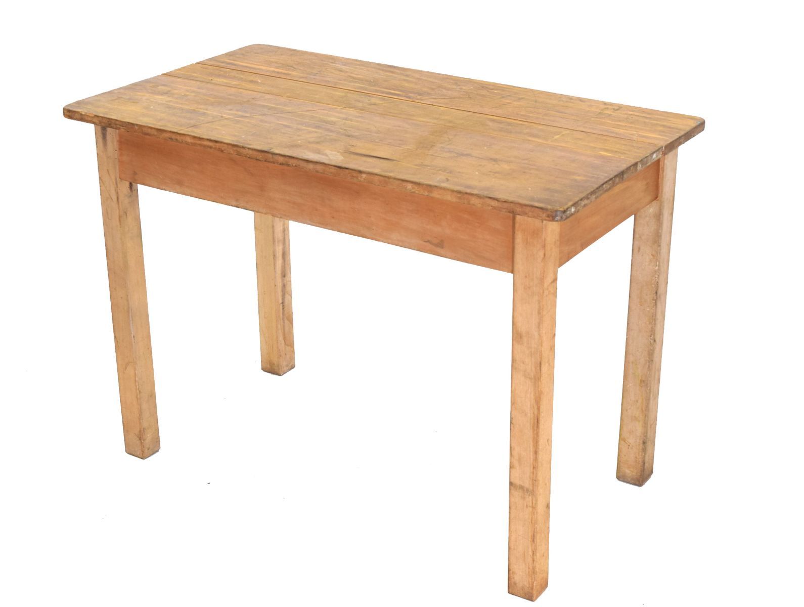 of simple rectangular form, raised on square legs; a functional table of modest proportions.