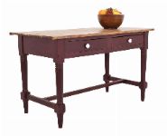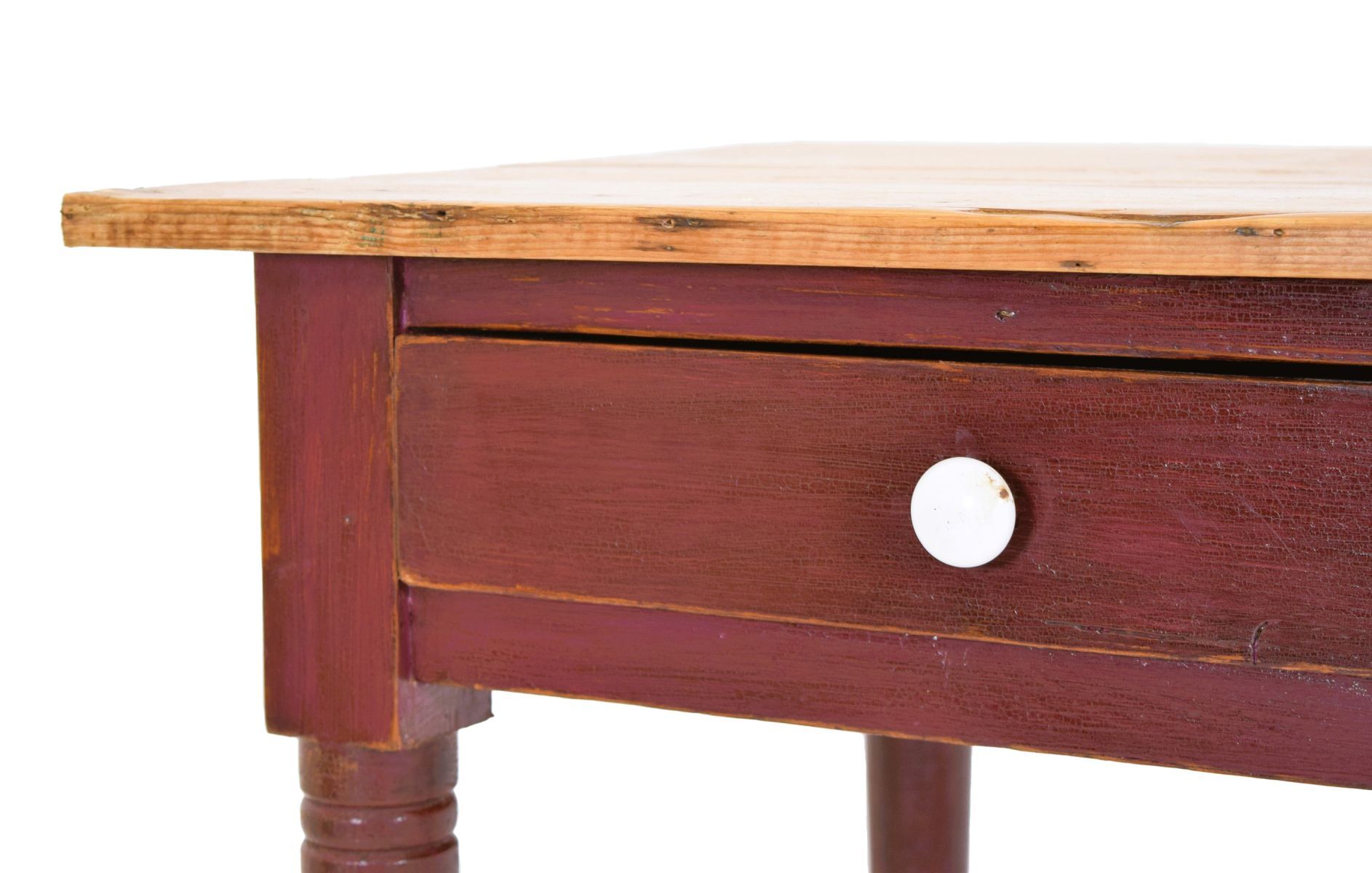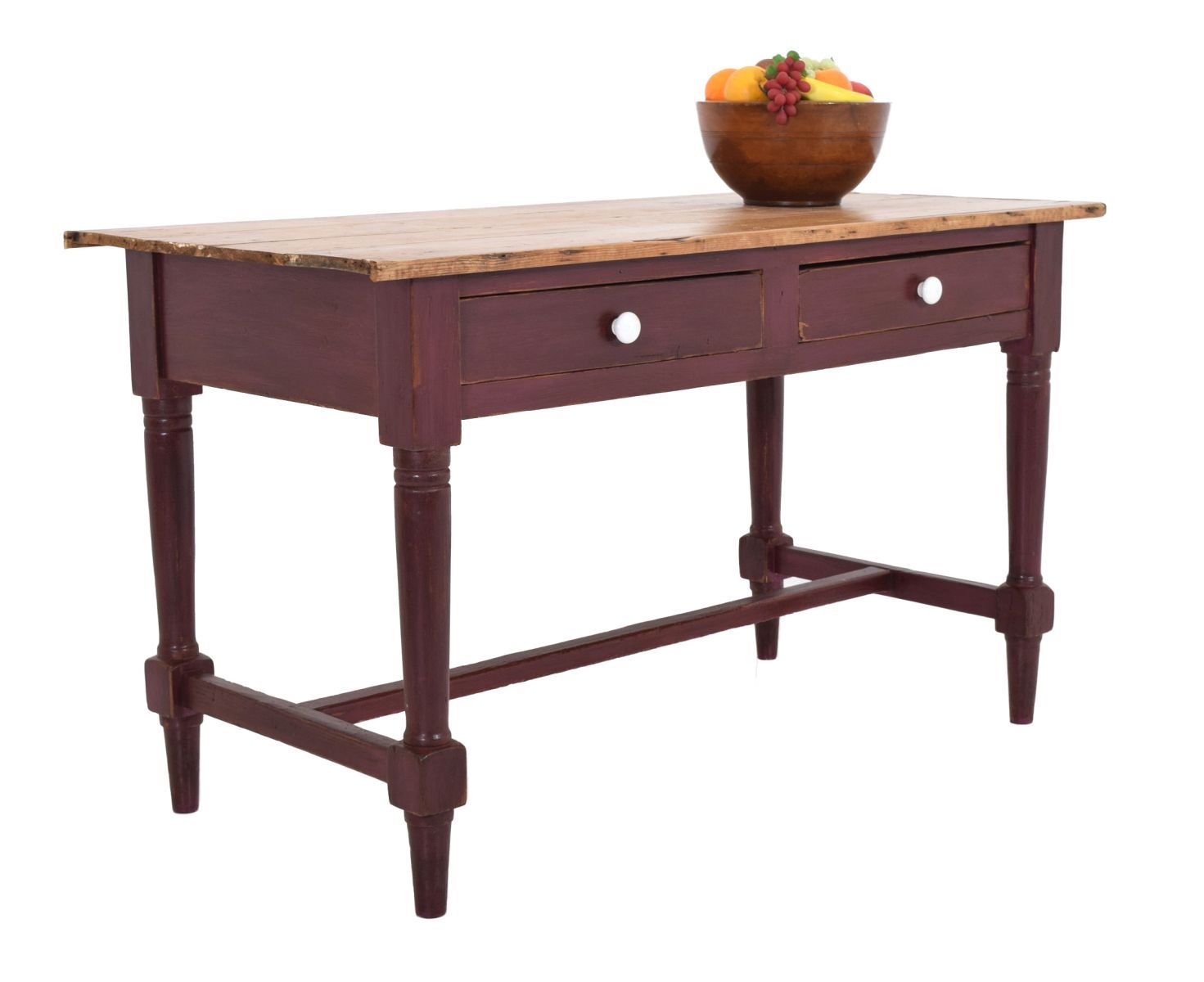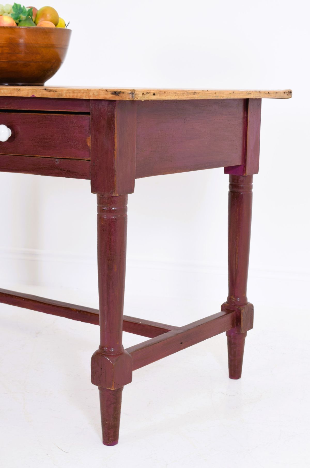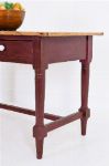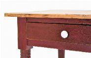 with rectangular top above two drawers, raised on turned legs joined by a stretcher rail, in original red paint.