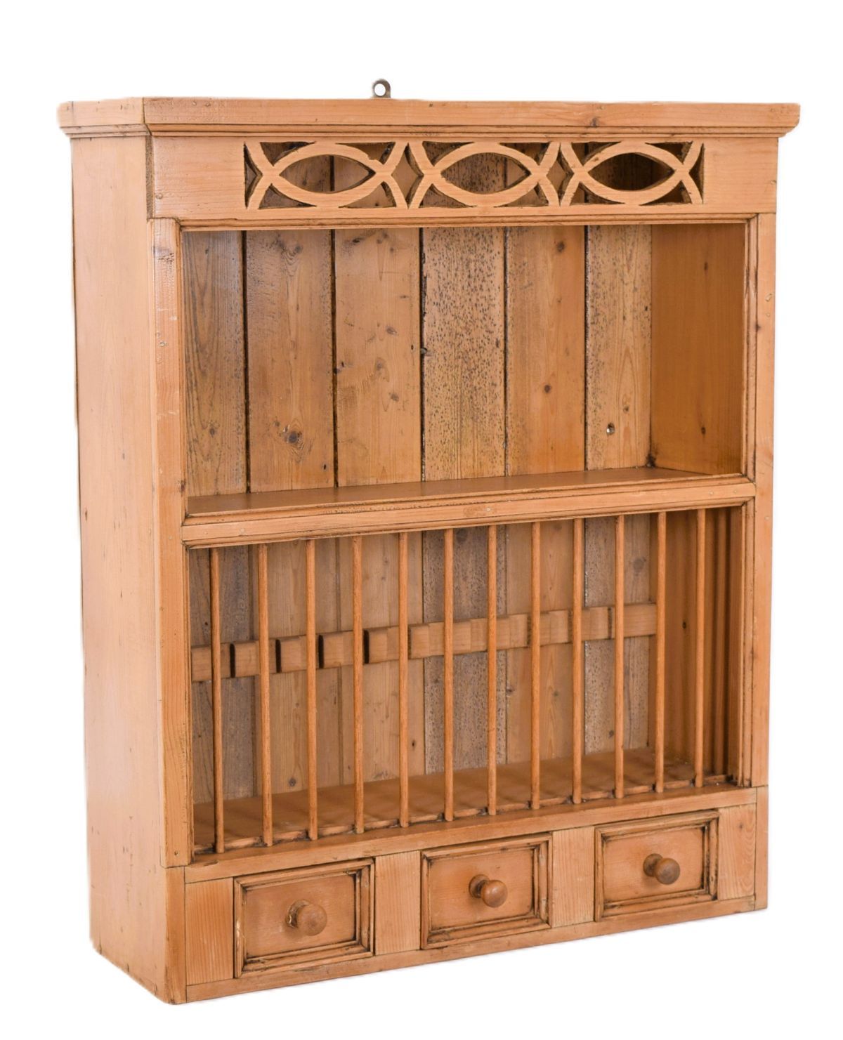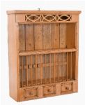 Pine wall bracket plate rack with open shelves and three small spice drawers below.