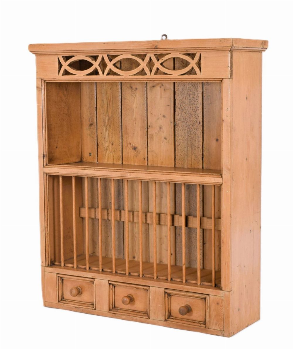 Lot 1595 PINE WALL-MOUNTED PLATE RACK WITH THREE SPICE DRAWERS