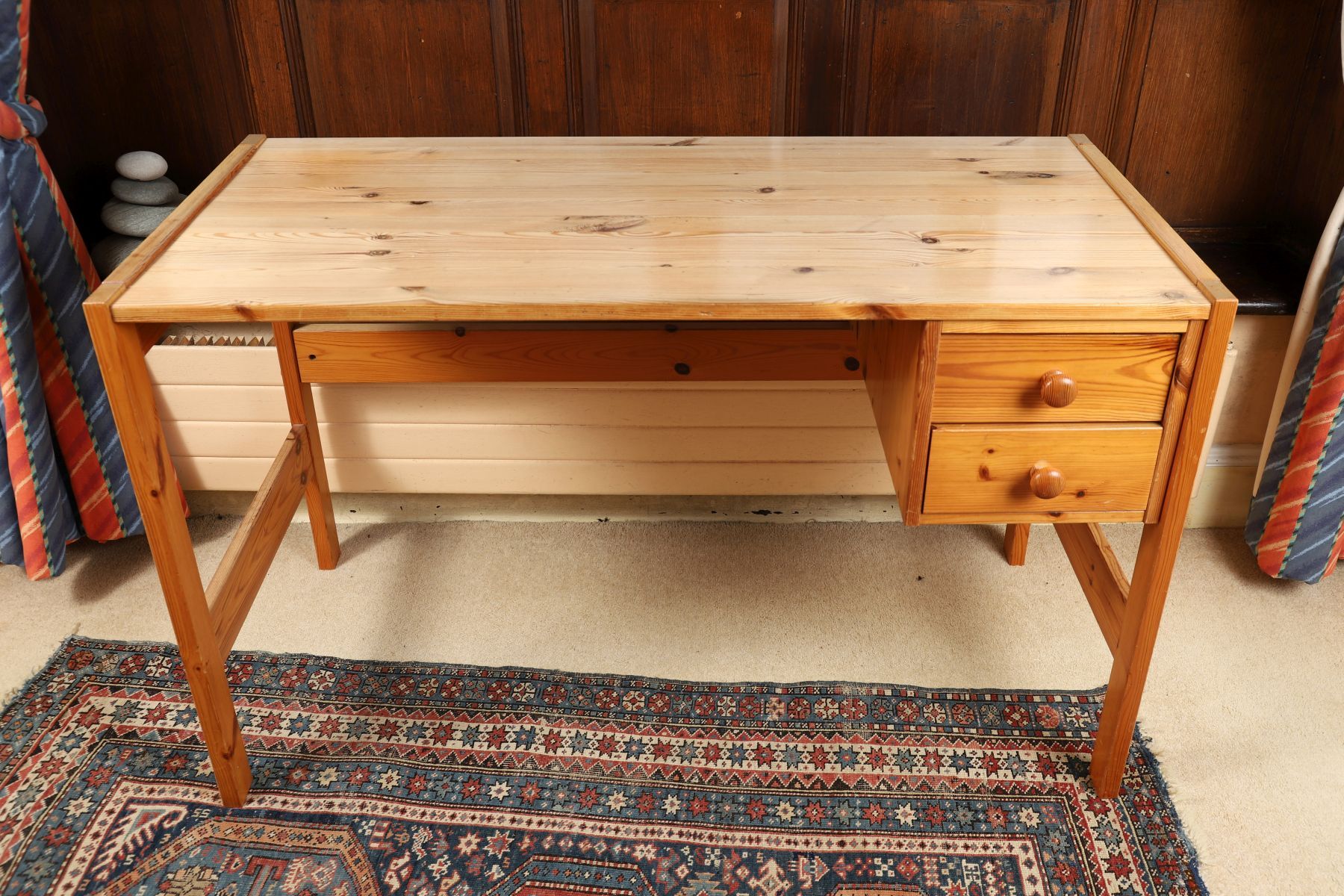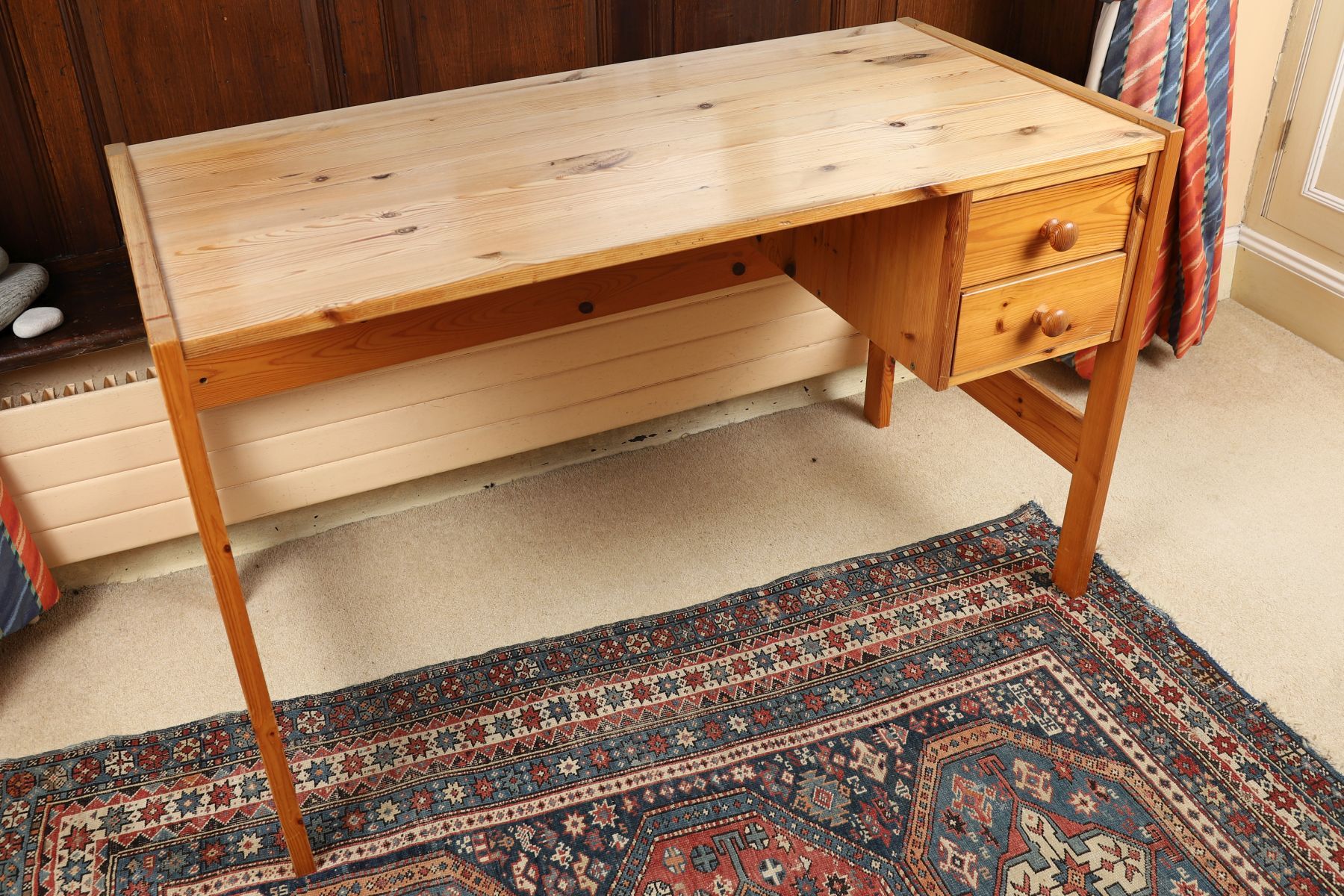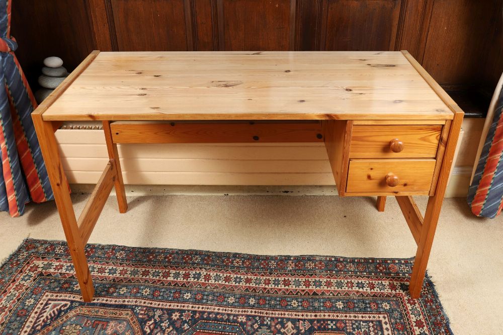 A pine writing desk with a rectangular top above drawers to one side, raised on square-section legs.
