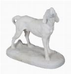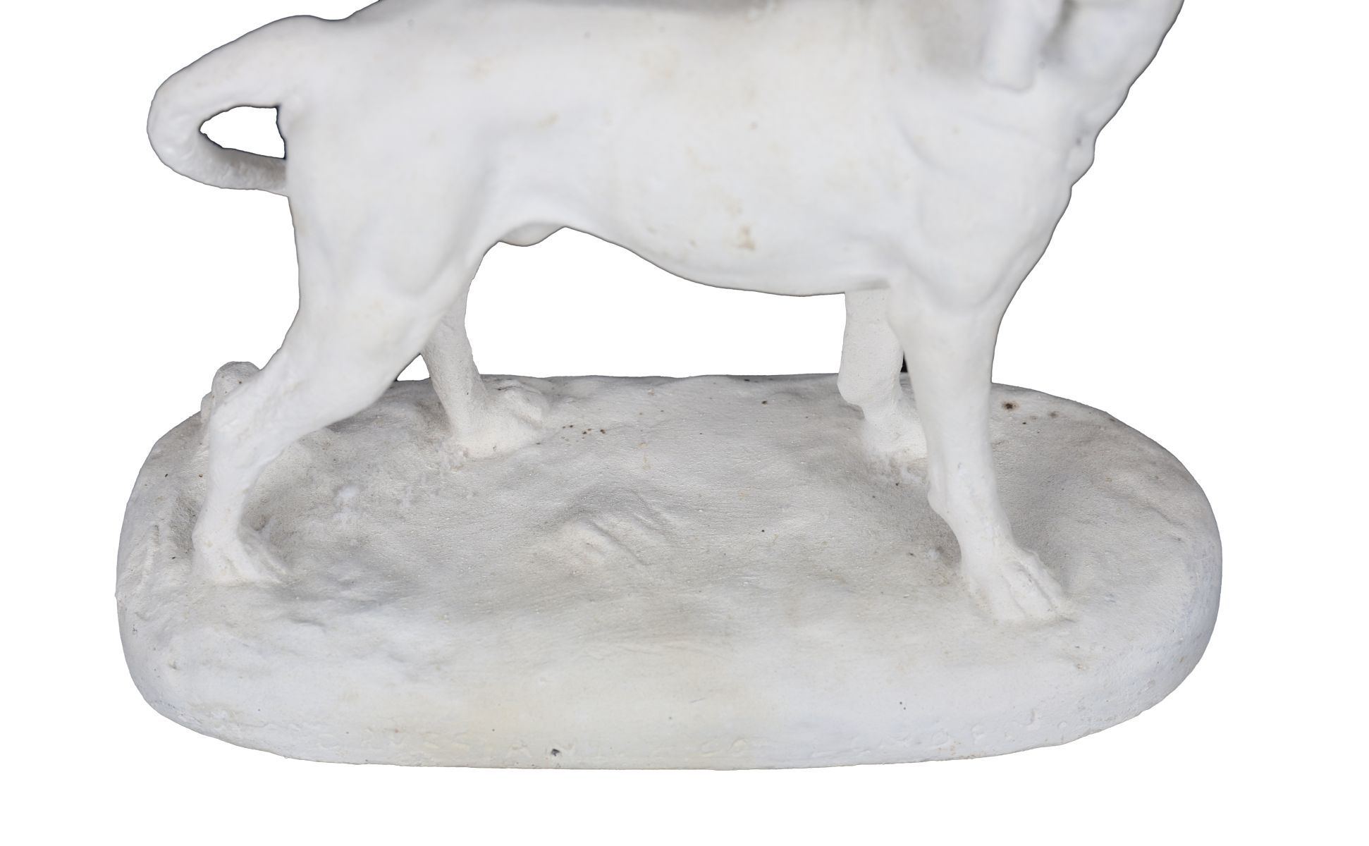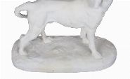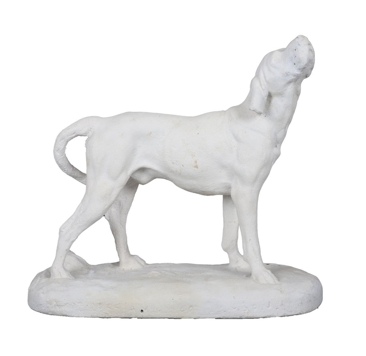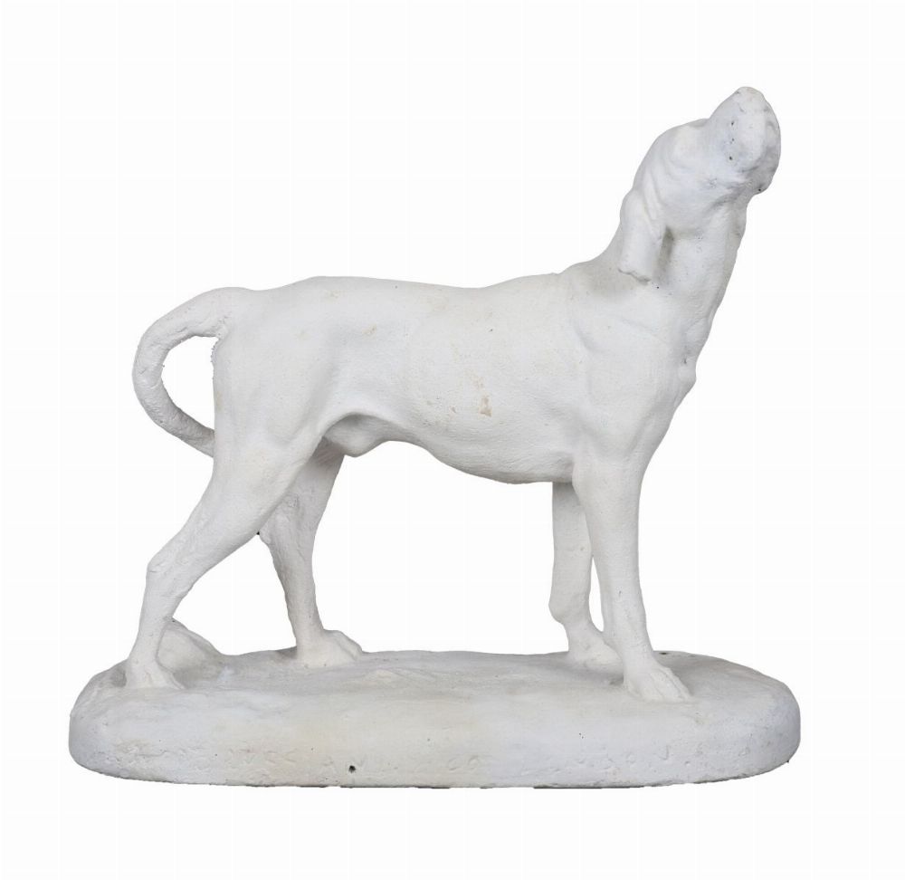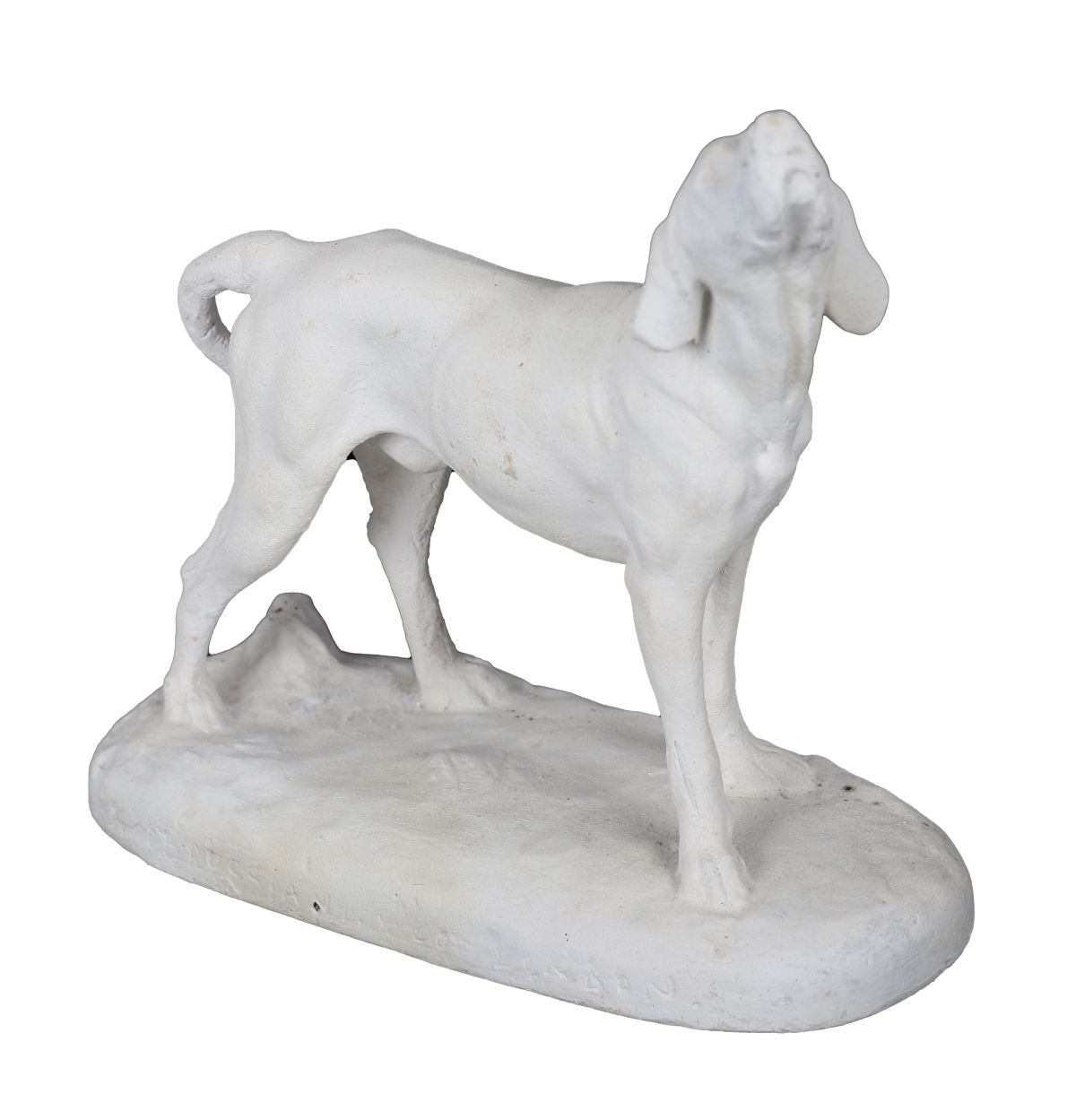 A plaster figure of a hound standing alert on an oval base, unpainted with natural white surface.