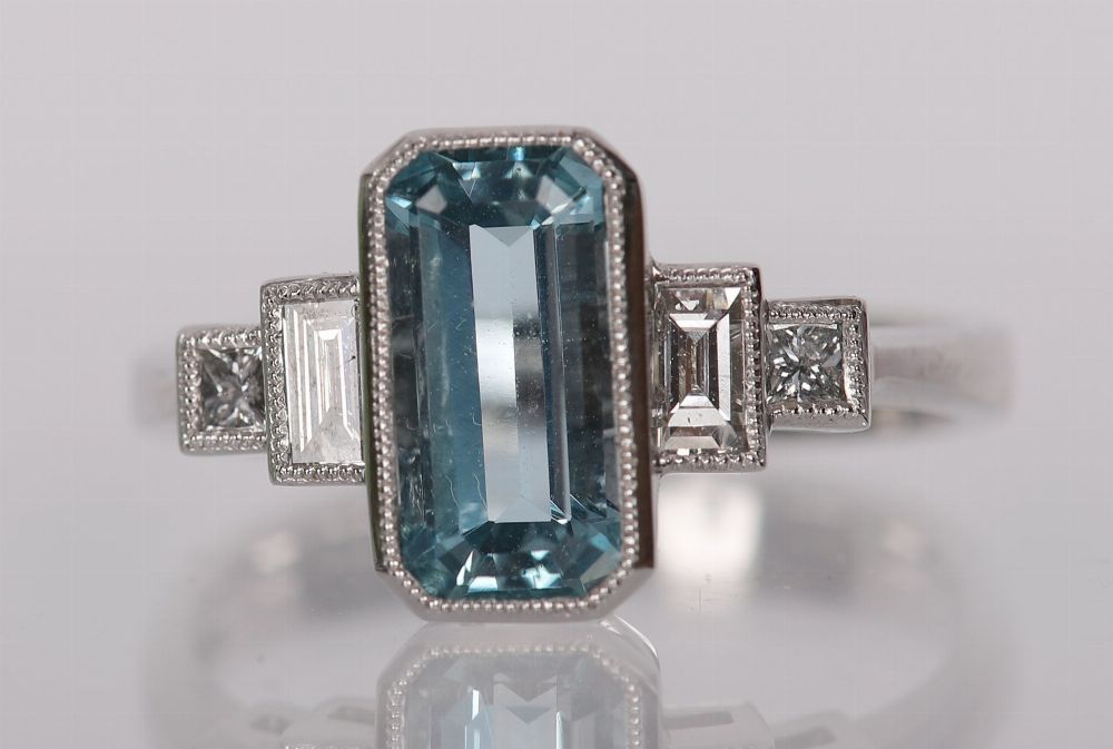 A rectangular step-cut aquamarine of fine blue colour, flanked by baguette-cut diamonds in platinum mount.