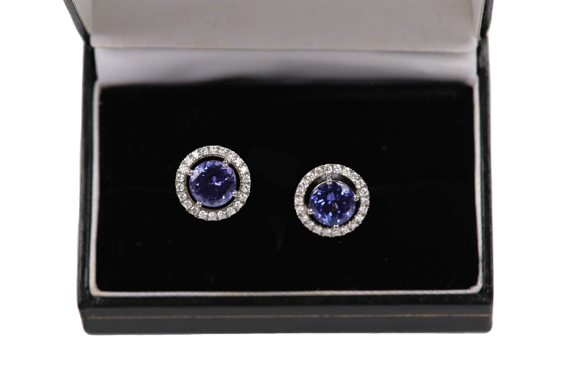 A pair of platinum earrings, each set with an oval-cut tanzanite of rich violet-blue hue surrounded by a border of brilliant-cut diamonds. Fitted with post and butterfly backs.
