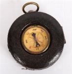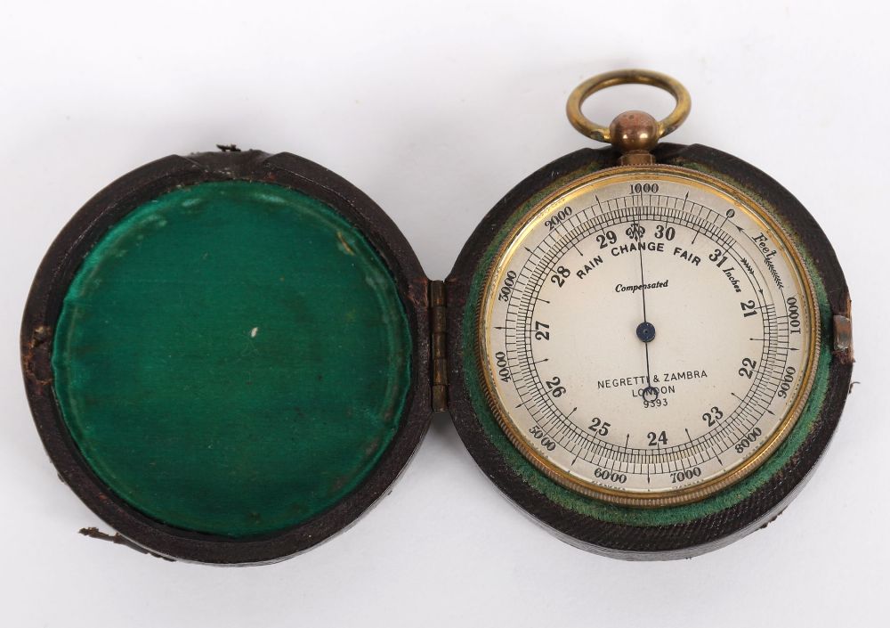 A late 19th century pocket barometer by Negretti & Zambra, London, no. 9393, with silvered dial calibrated for altitude and pressure, in original leather case lined with green velvet.