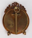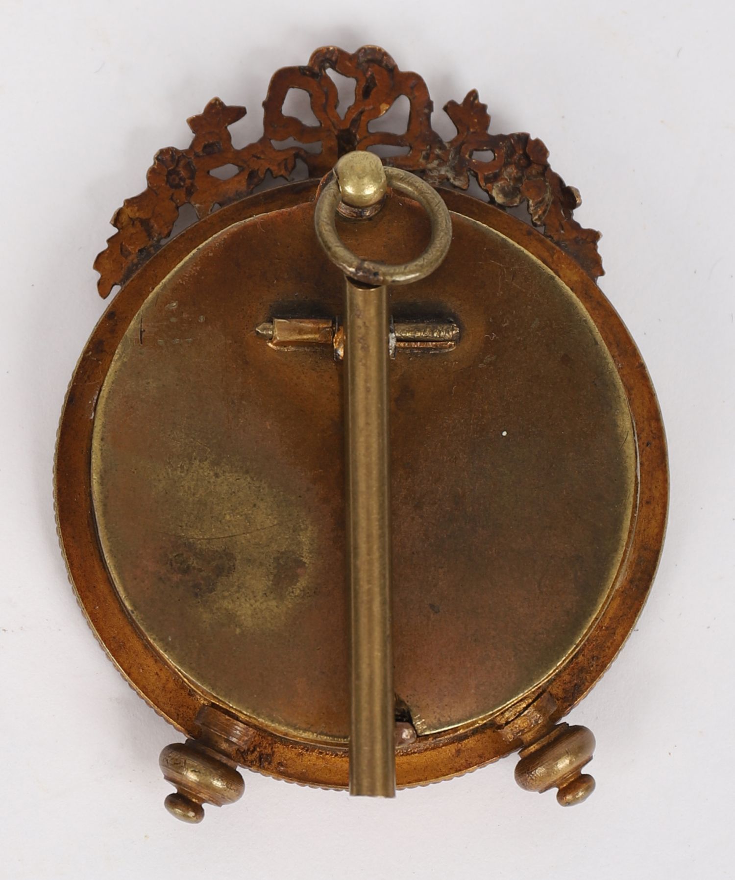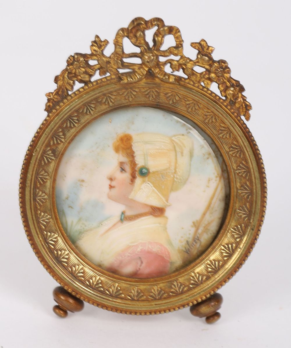 A 19th century portrait miniature of a lady wearing a white bonnet and pink dress, set in an ormolu-mounted circular frame with ribbon cresting.
