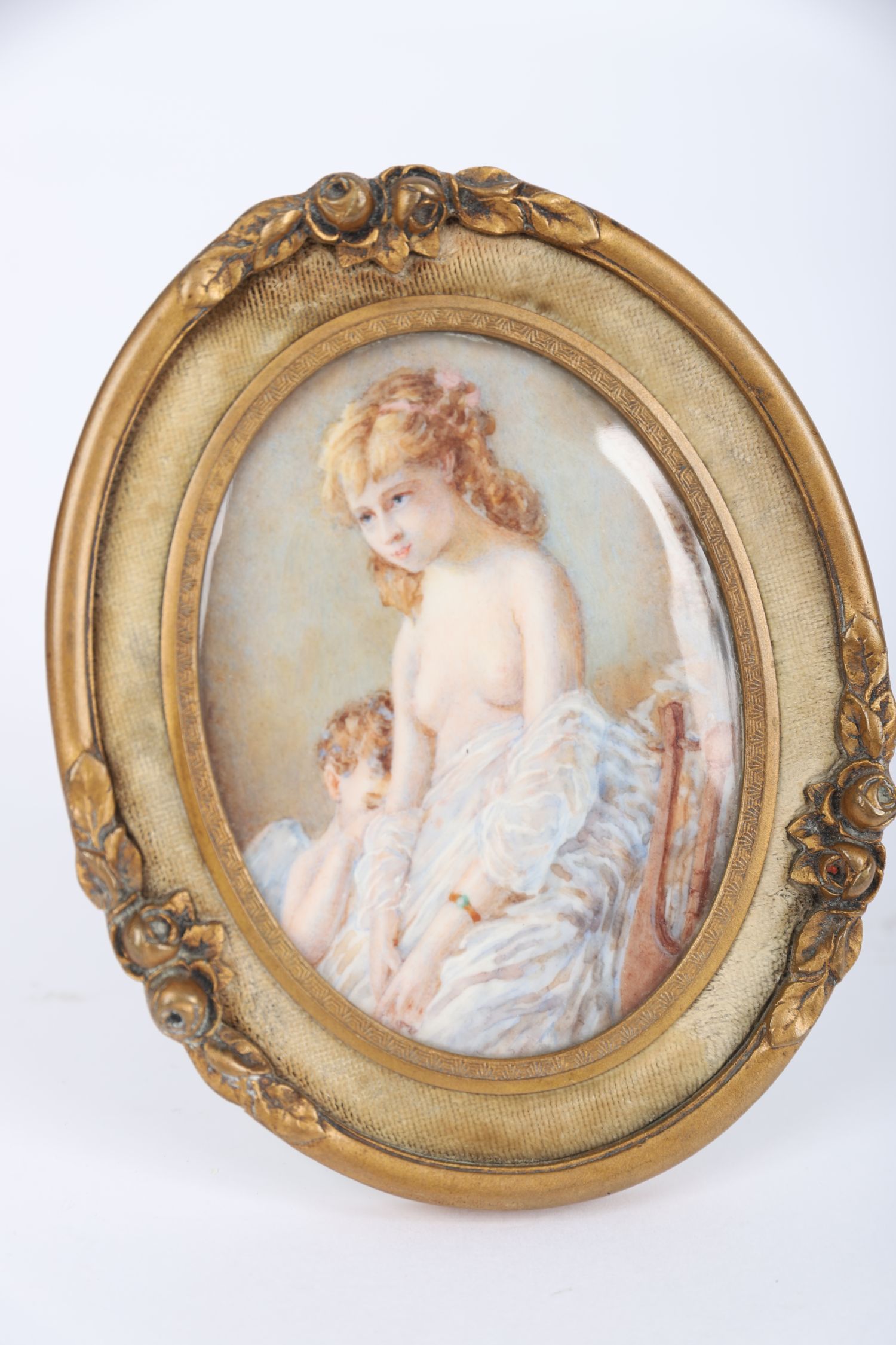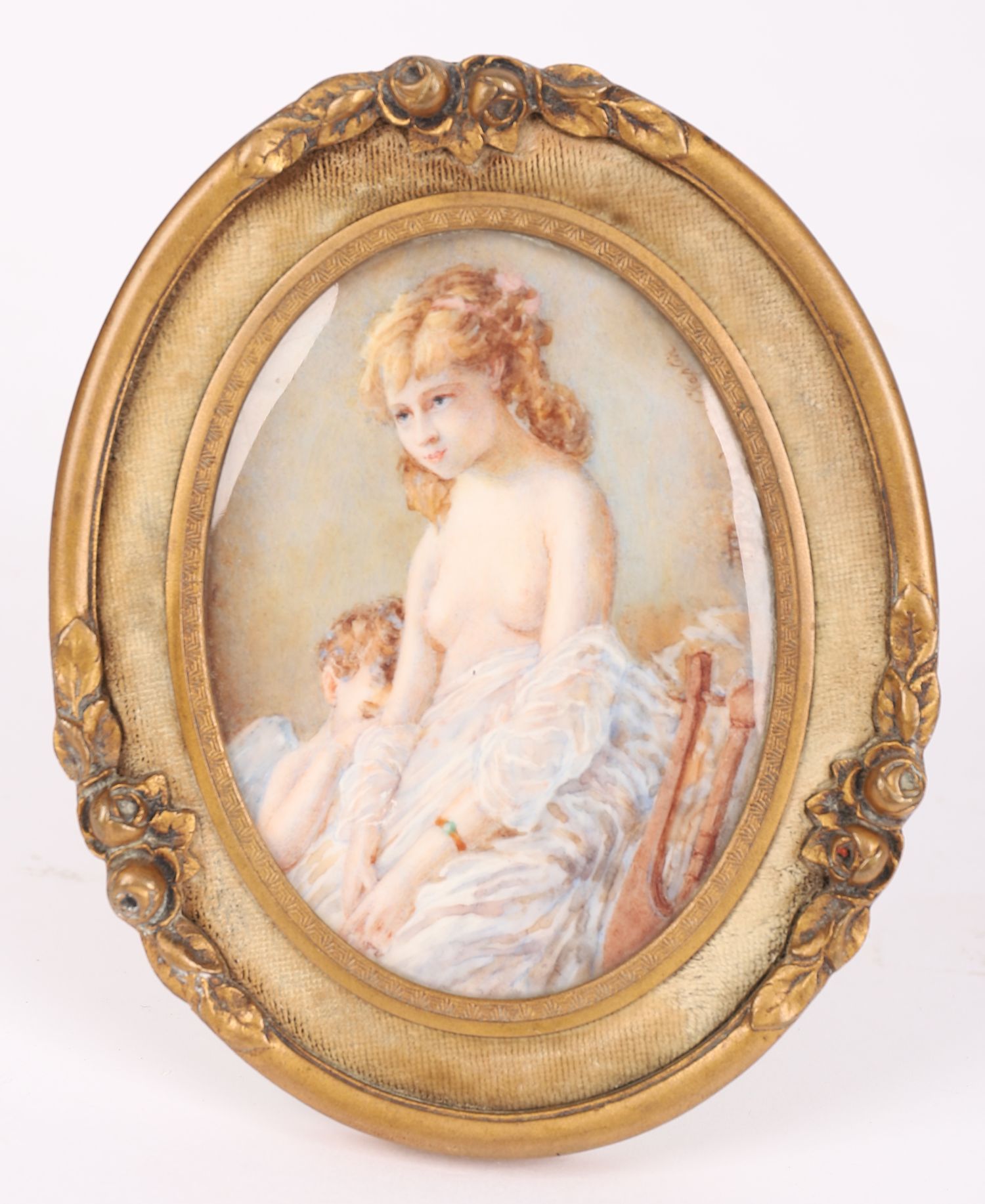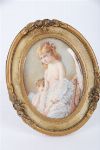 A 19th century oval portrait miniature, depicting a lady in classical dress with long flowing hair, painted with fine detail and set within a gilt frame.
