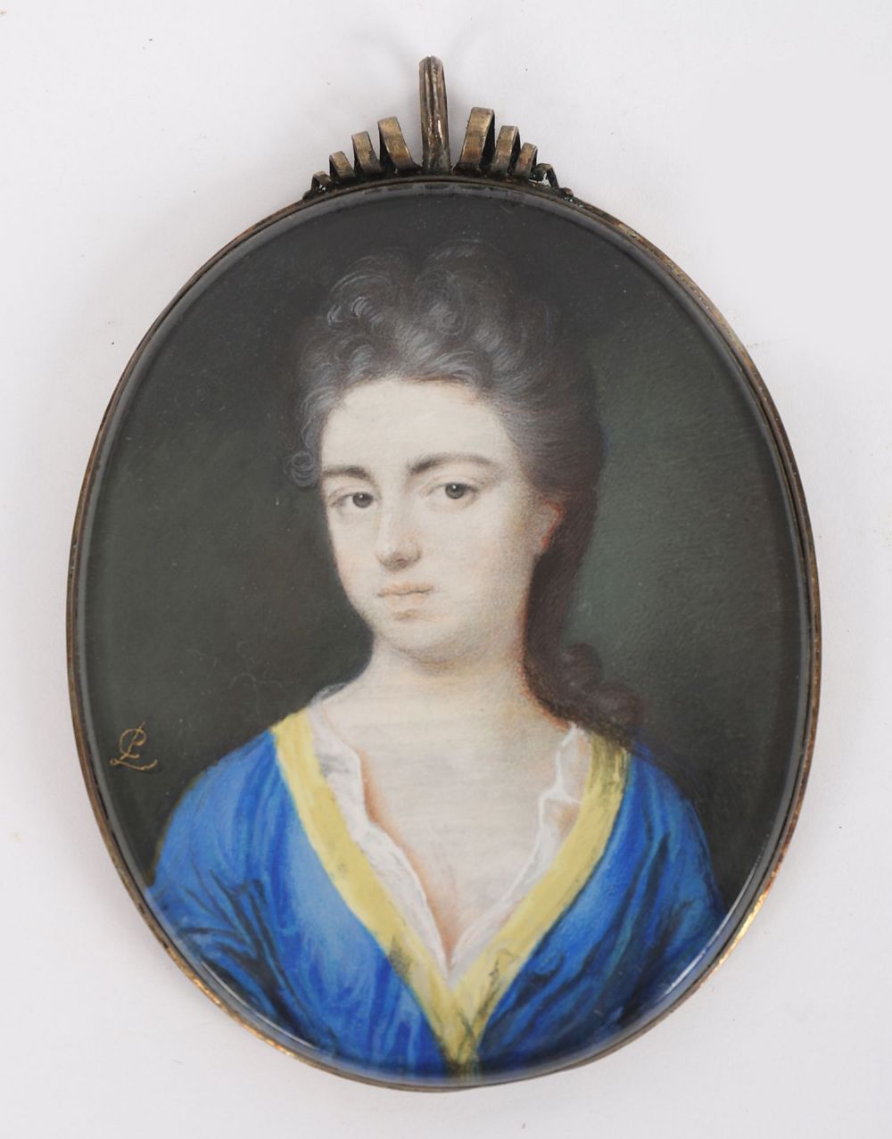An 18th century oval portrait miniature, finely painted with a lady in blue dress with yellow trim, wearing her hair upswept. Set under glass in a gilt-metal frame with suspension loop.