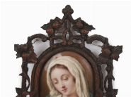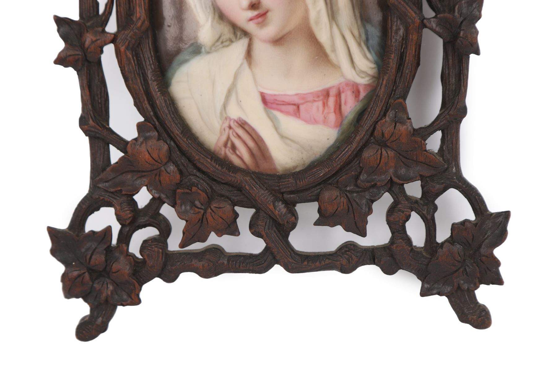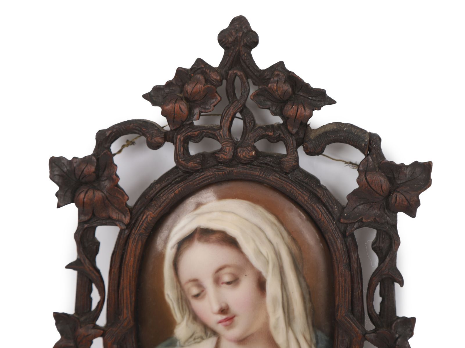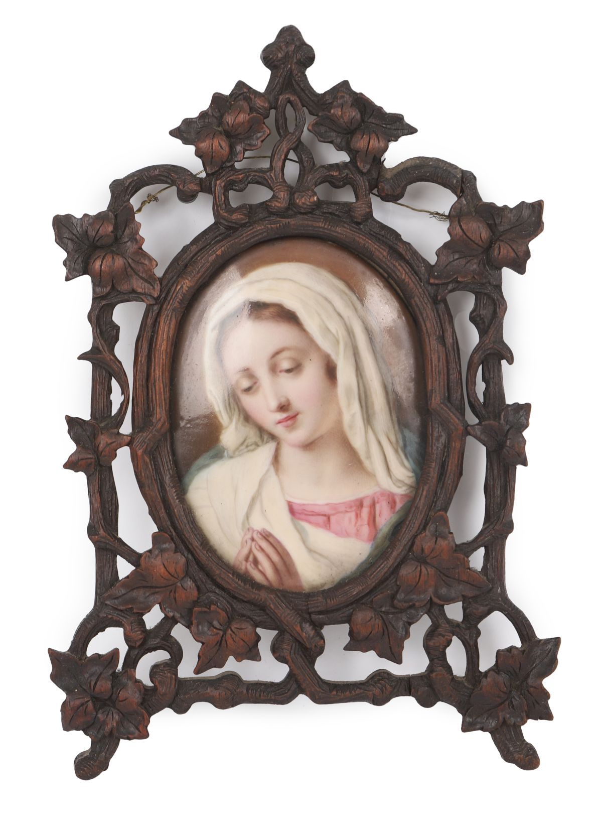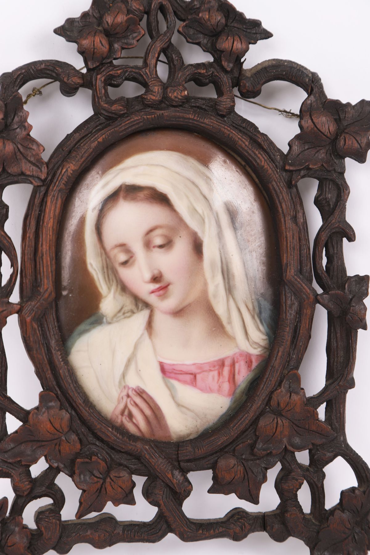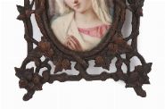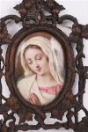Early 19th century. Oval miniature depicting a young woman with loosely dressed hair and classical attire, mounted in an ornate carved wood frame with floral decoration.