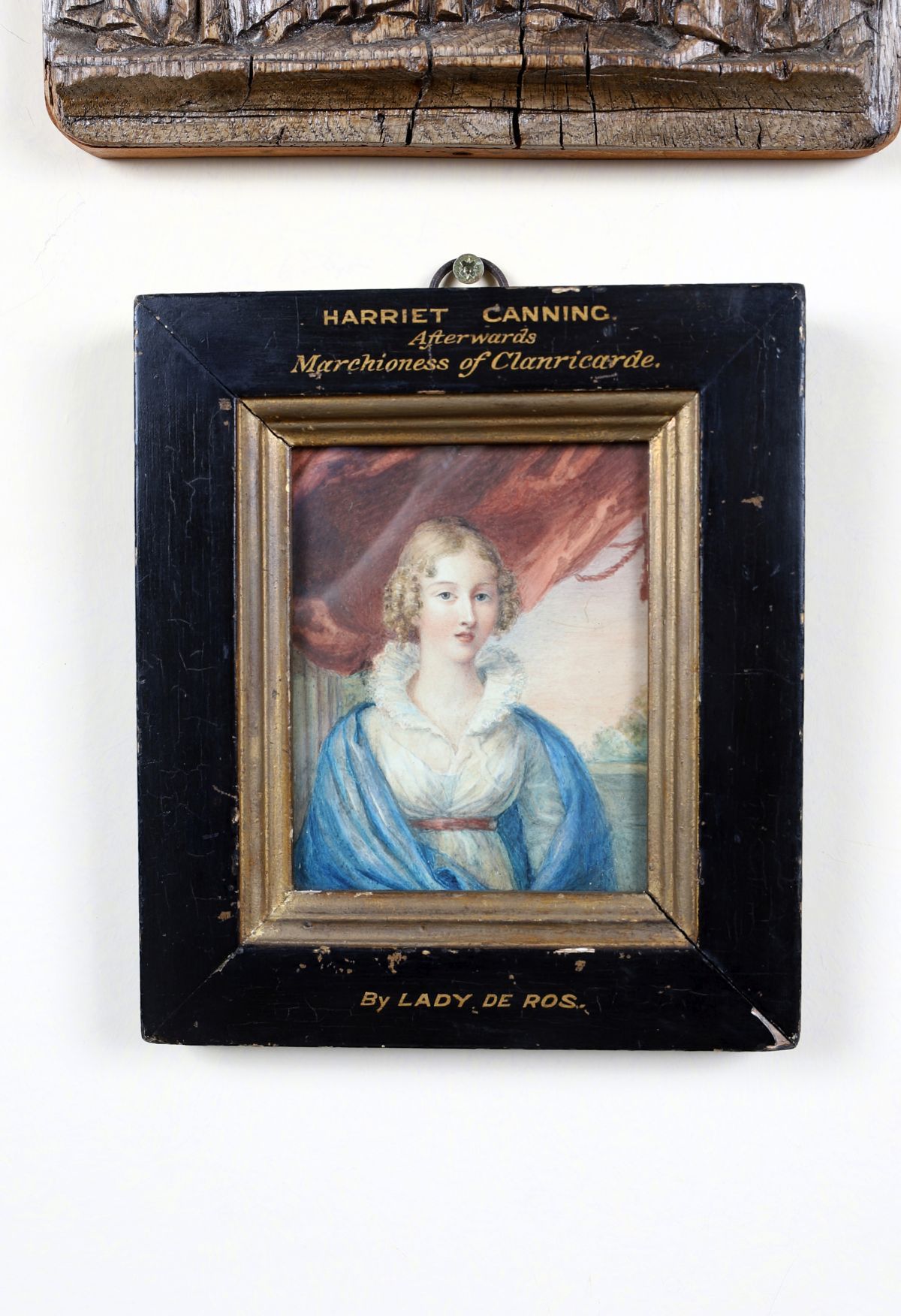 Portrait miniature depicting Harriet Canning, afterwards Marchioness of Clanricarde, painted in period dress. Inscribed to the frame and presented within a painted and gilt surround. 19th century.
