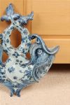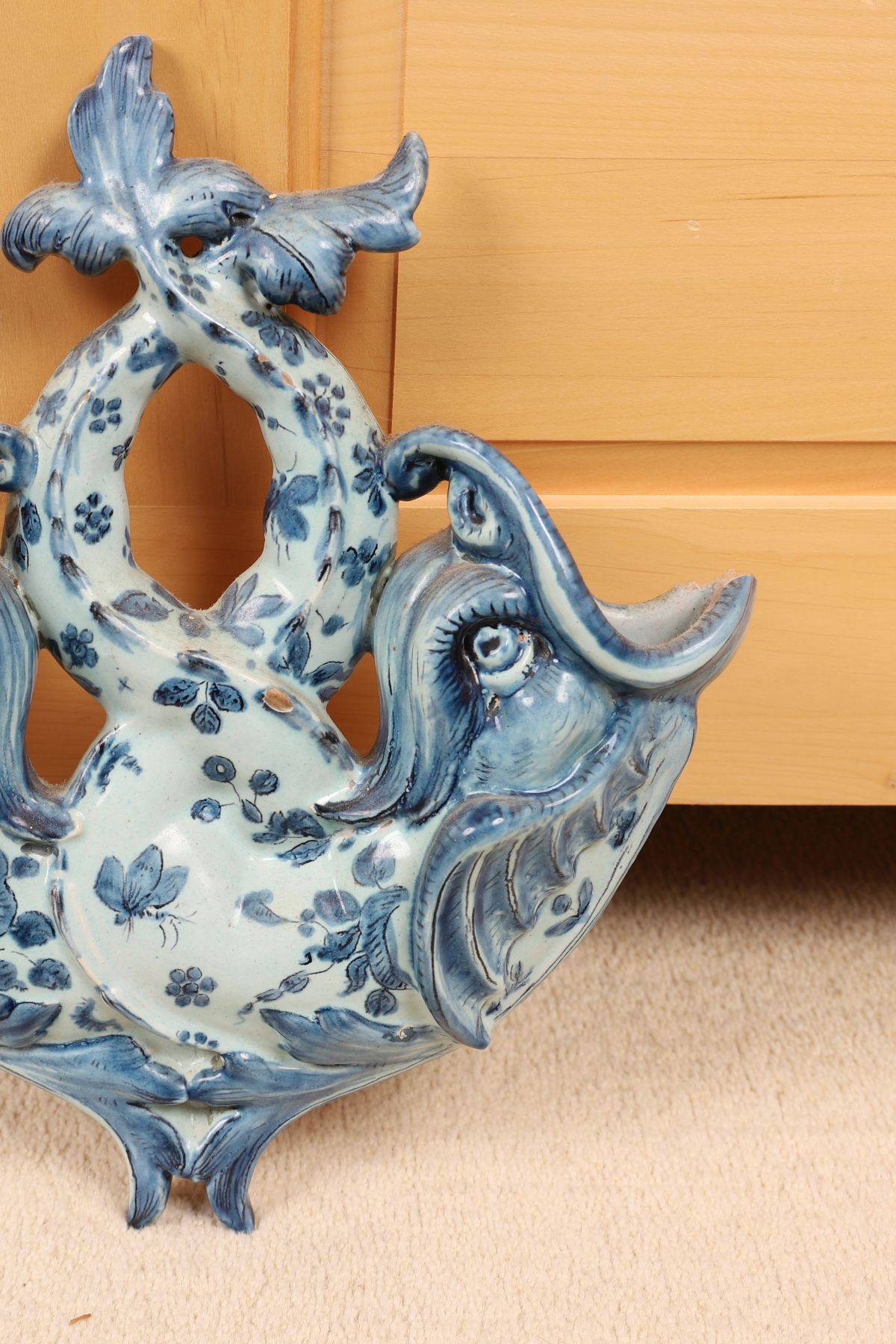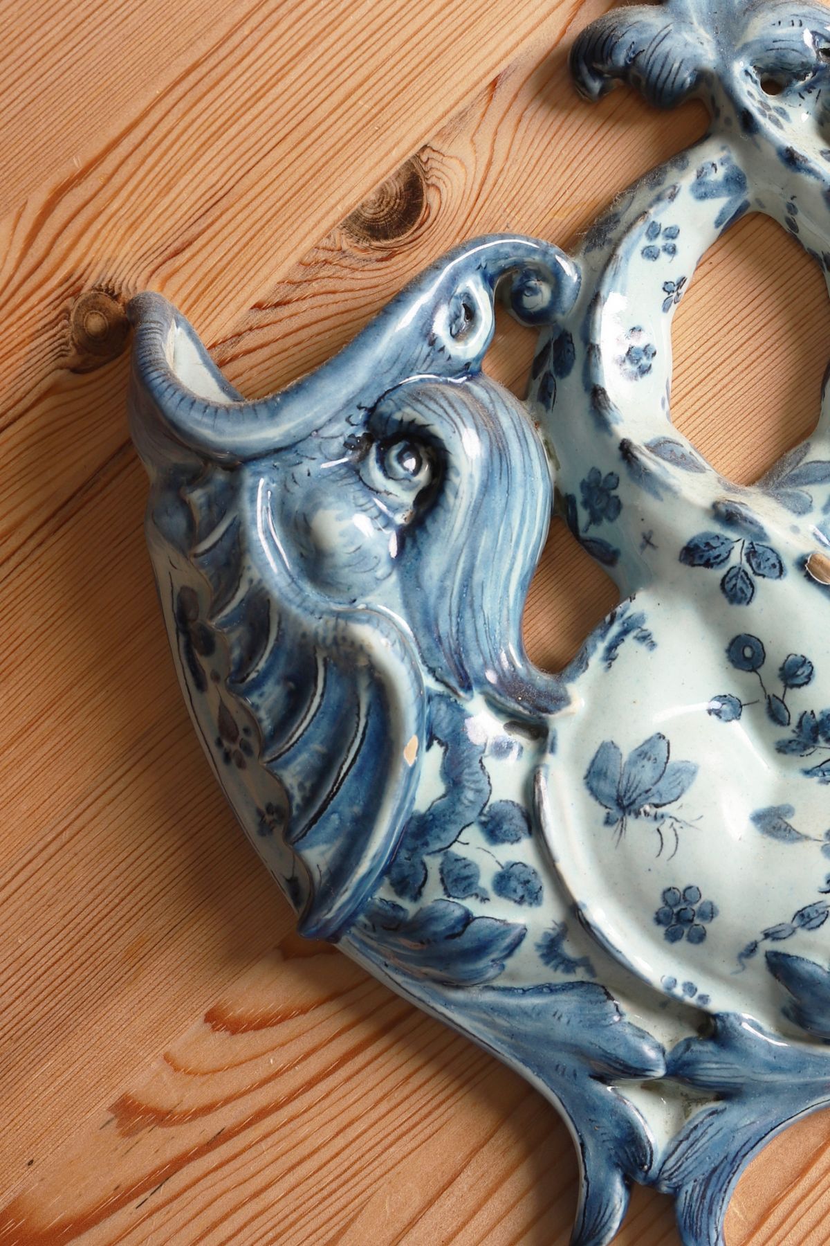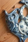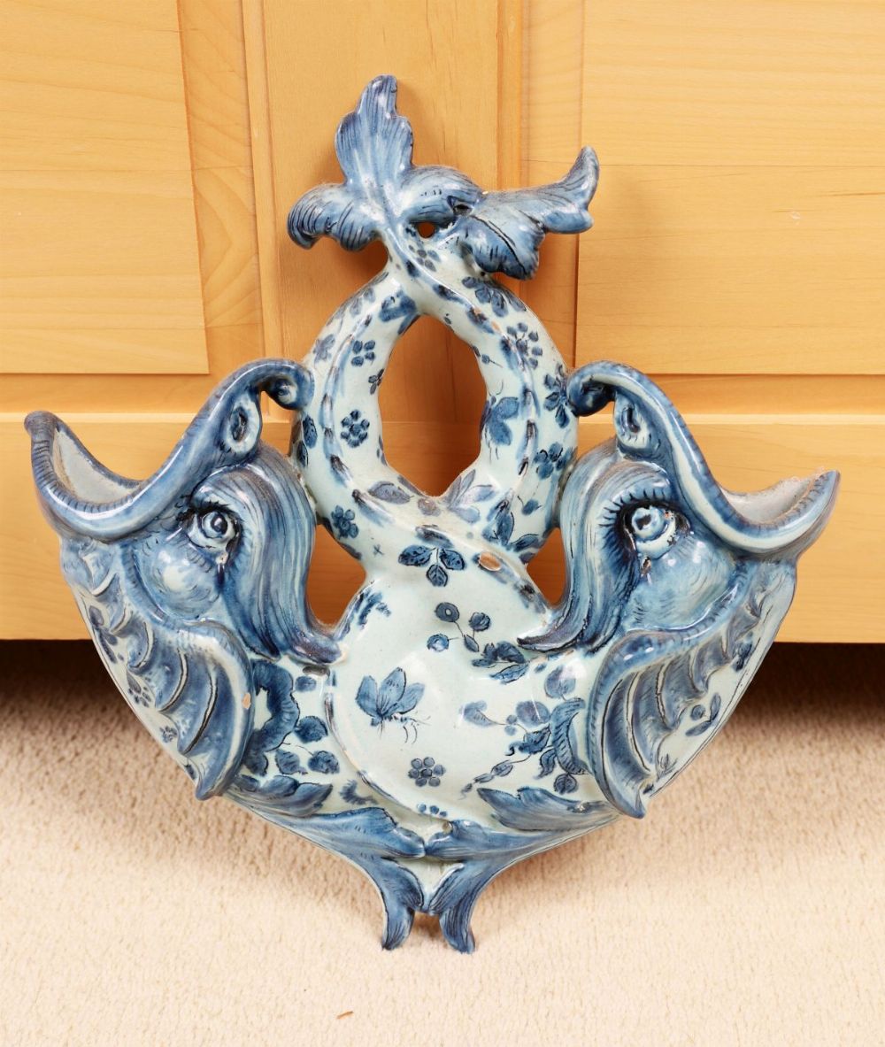 A Portuguese ceramic wall pocket of pierced and scrolling form, decorated in blue with floral motifs on a white ground. Wall-mounted.