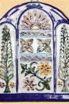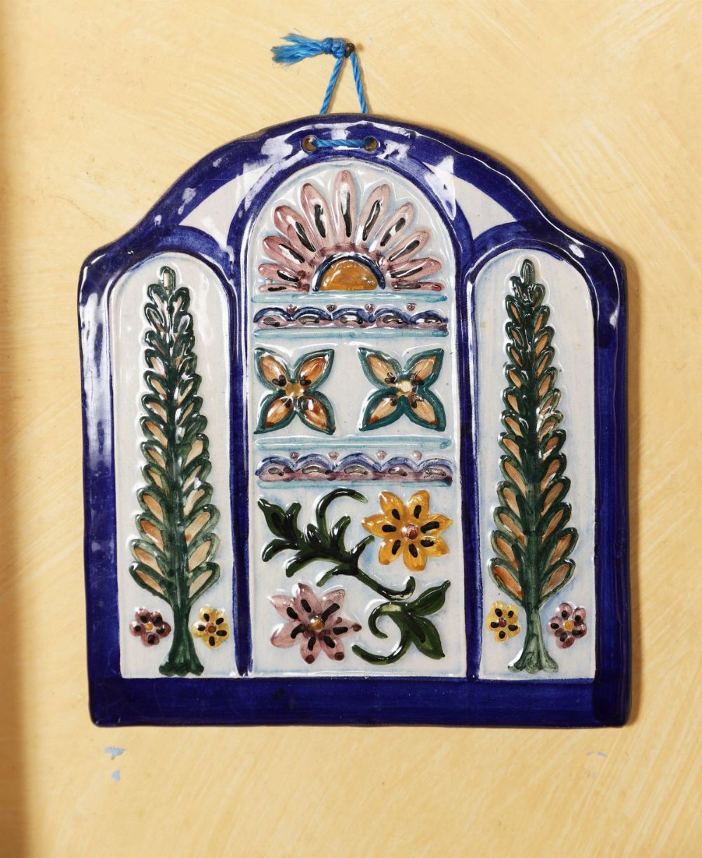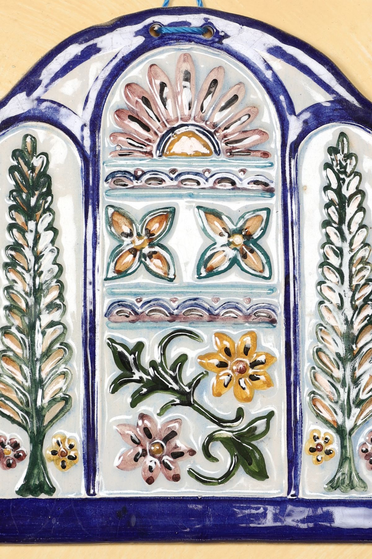 Of arched form, decorated in relief with floral and foliate motifs, glazed in blue, green and ochre tones.