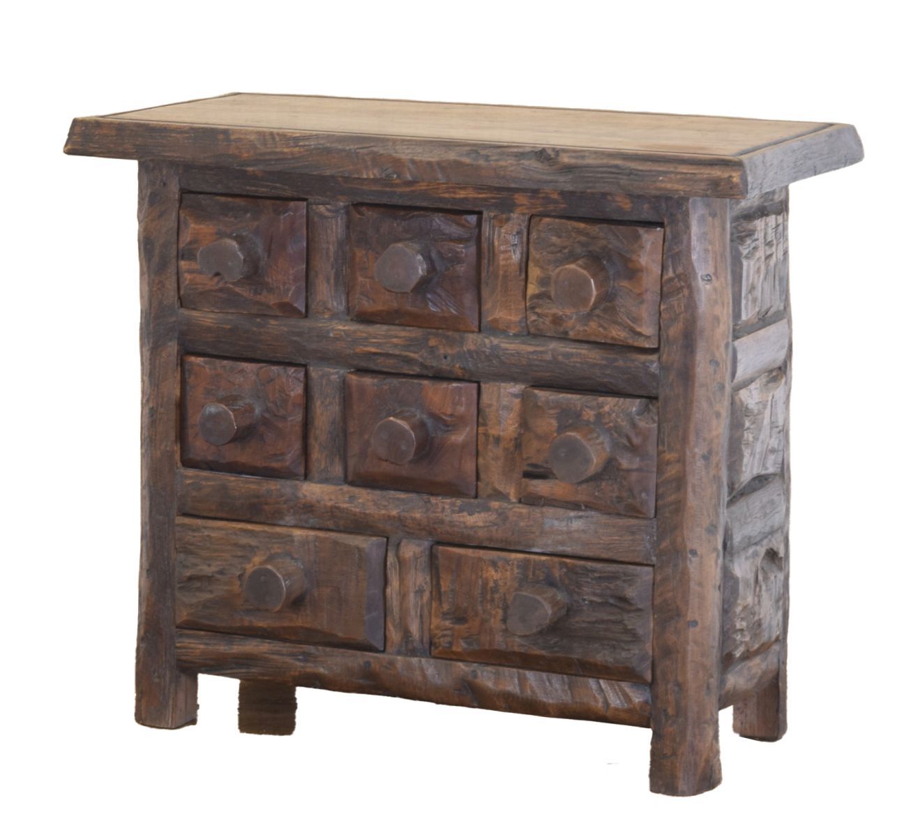 a folk-crafted chest of drawers made from salvaged driftwood, the square top above eight small drawers; an evocative piece of coastal cottage furniture.
