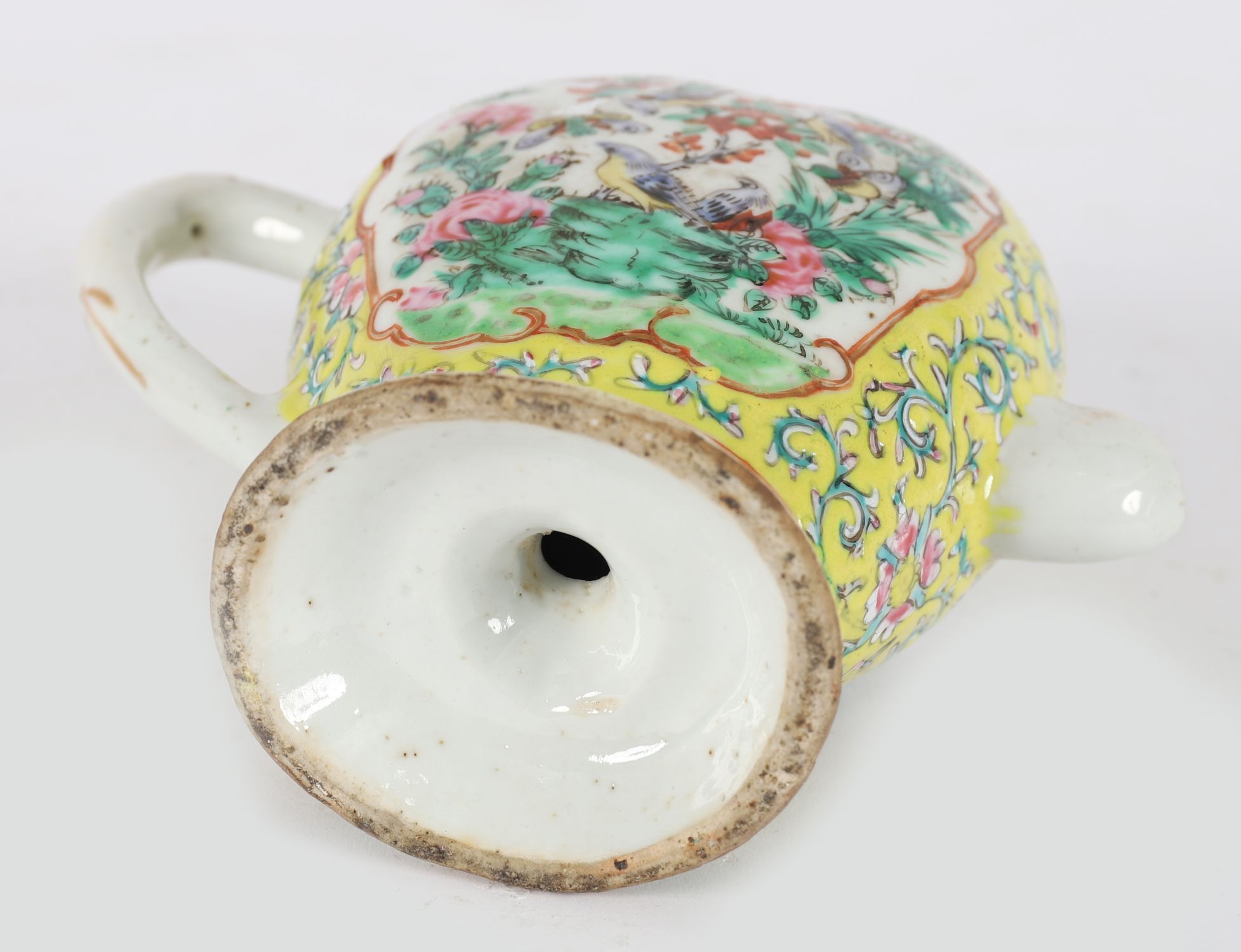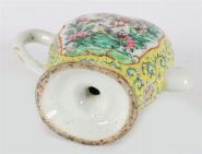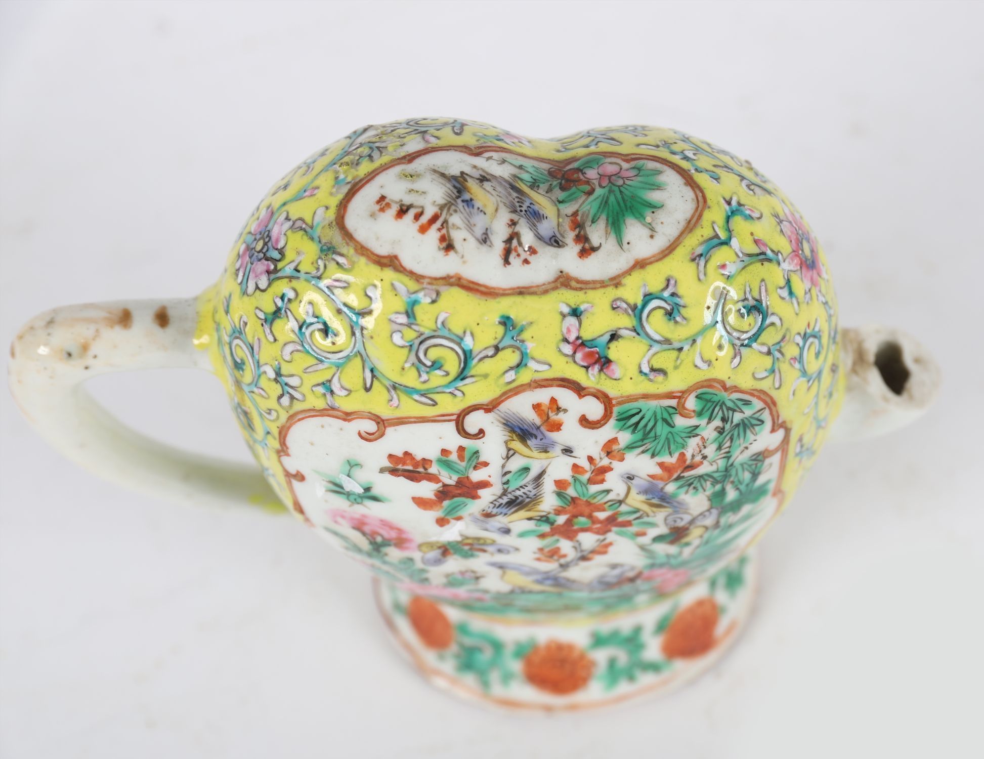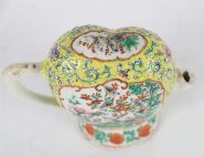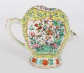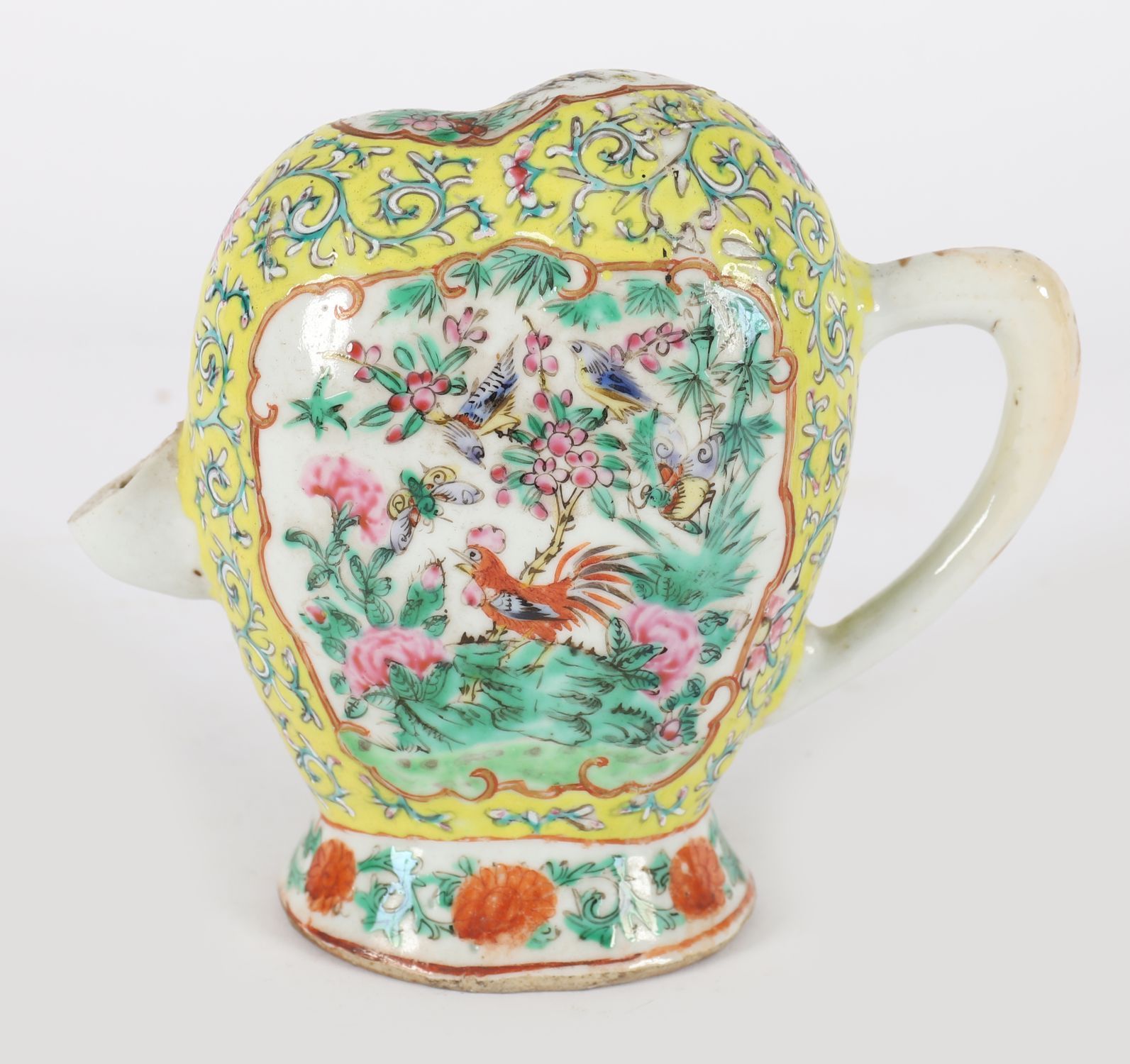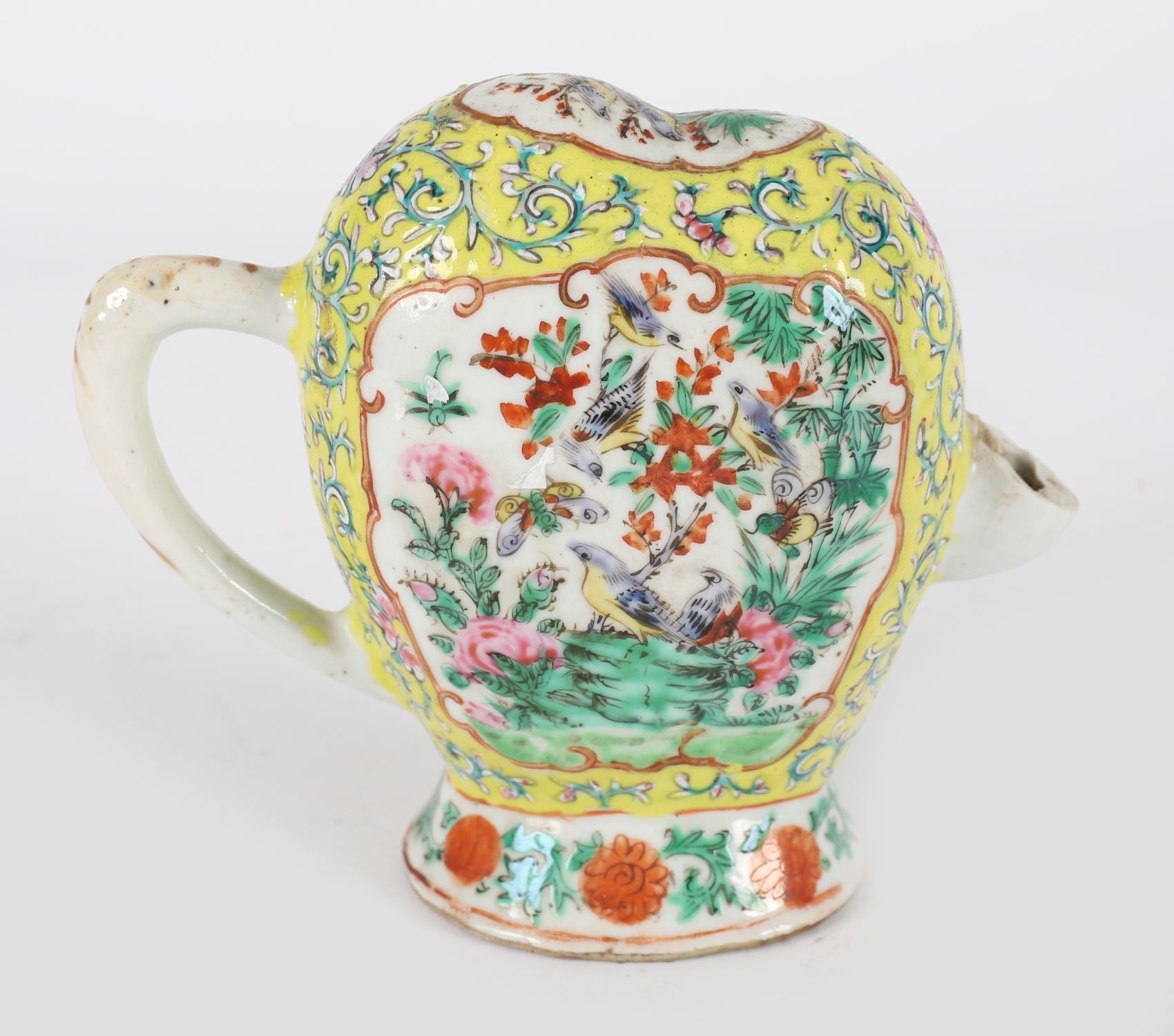 An unusual Chinese Qing dynasty famille rose porcelain wine ewer, of flattened oval form with a monk's cap-shaped top and scroll handle, the spout now missing. Finely enamelled in vibrant famille rose palette with cartouches of birds and flowering shrubs on a yellow scrollwork ground, with further floral borders around the foot and collar.